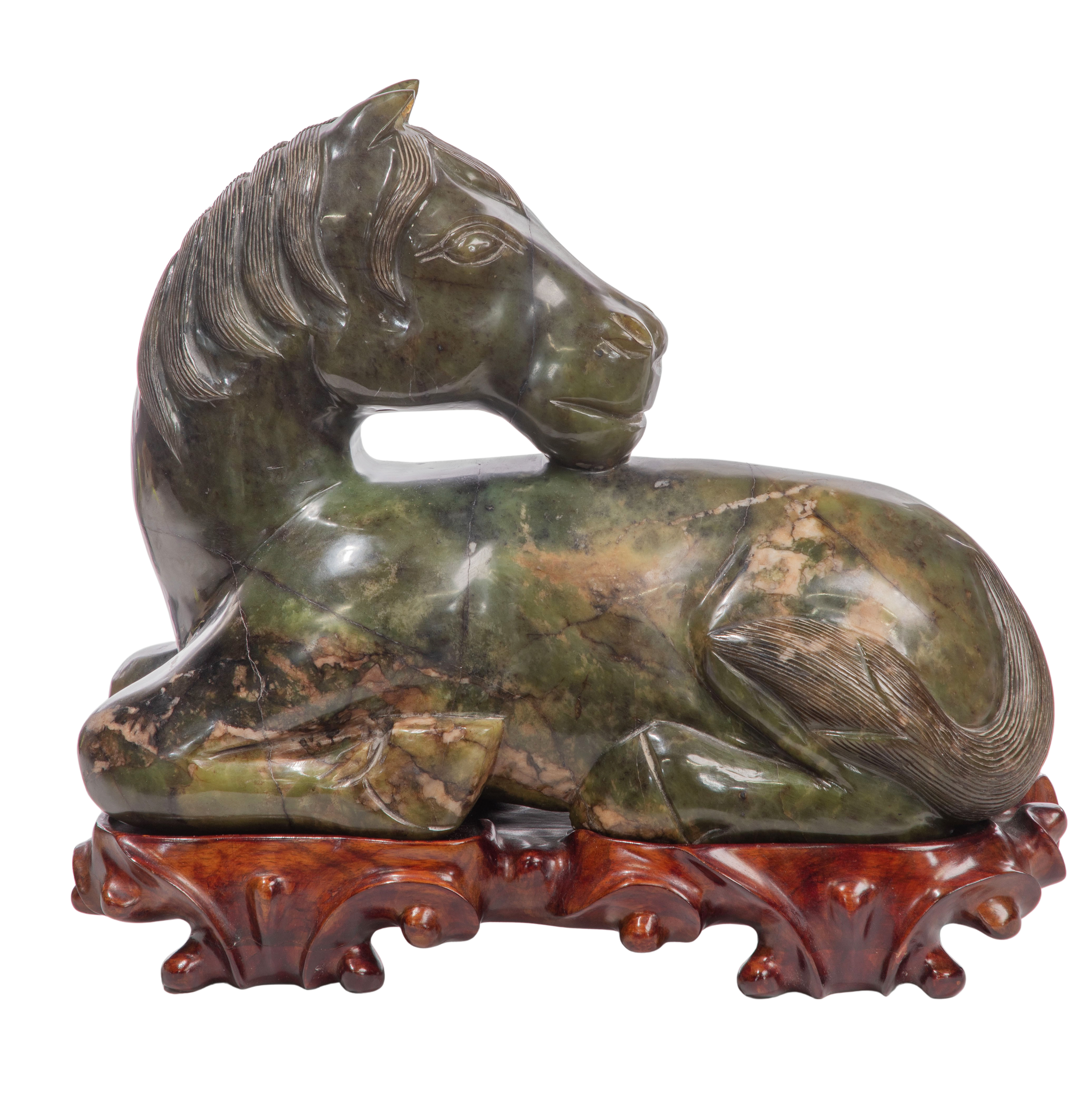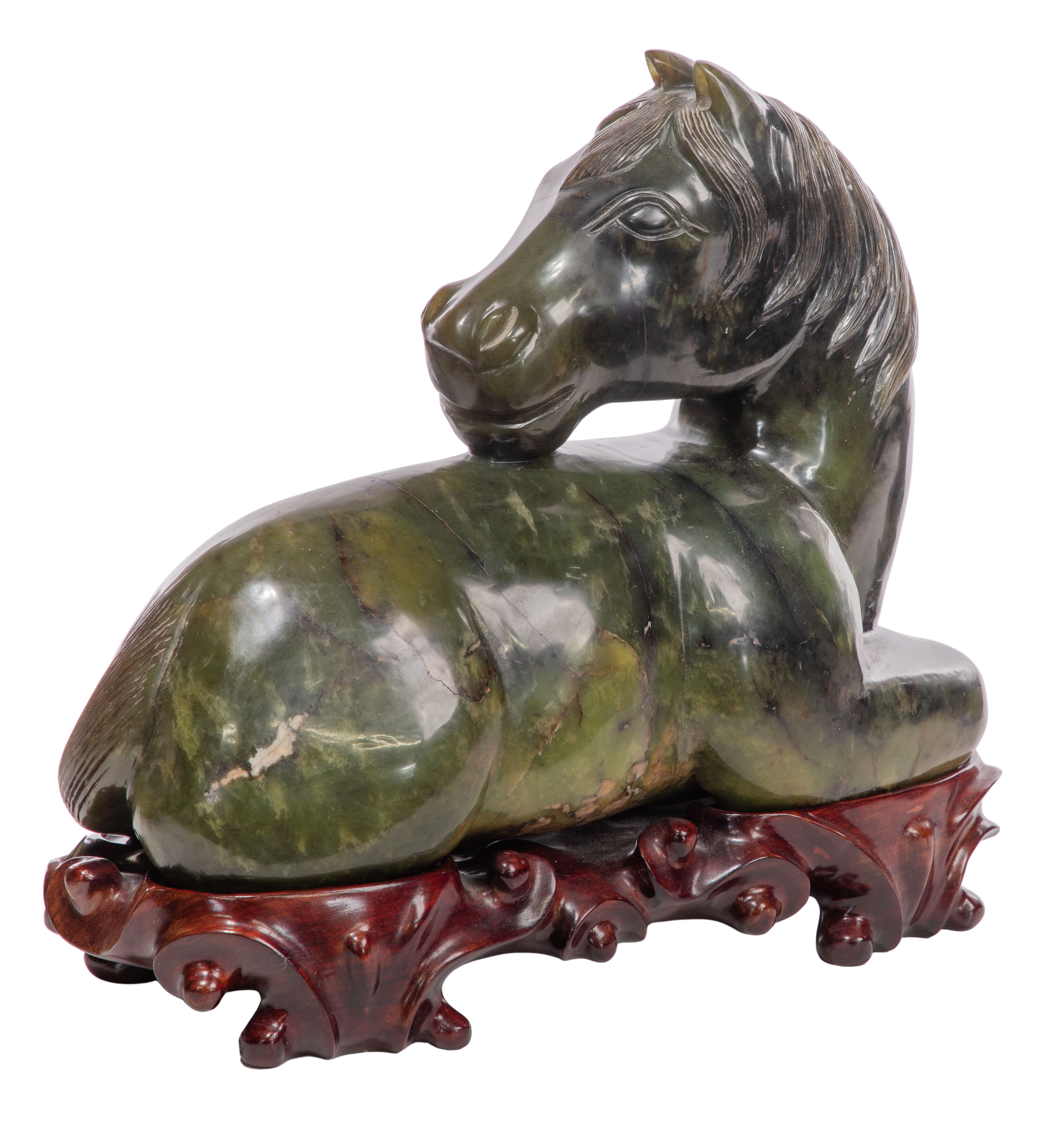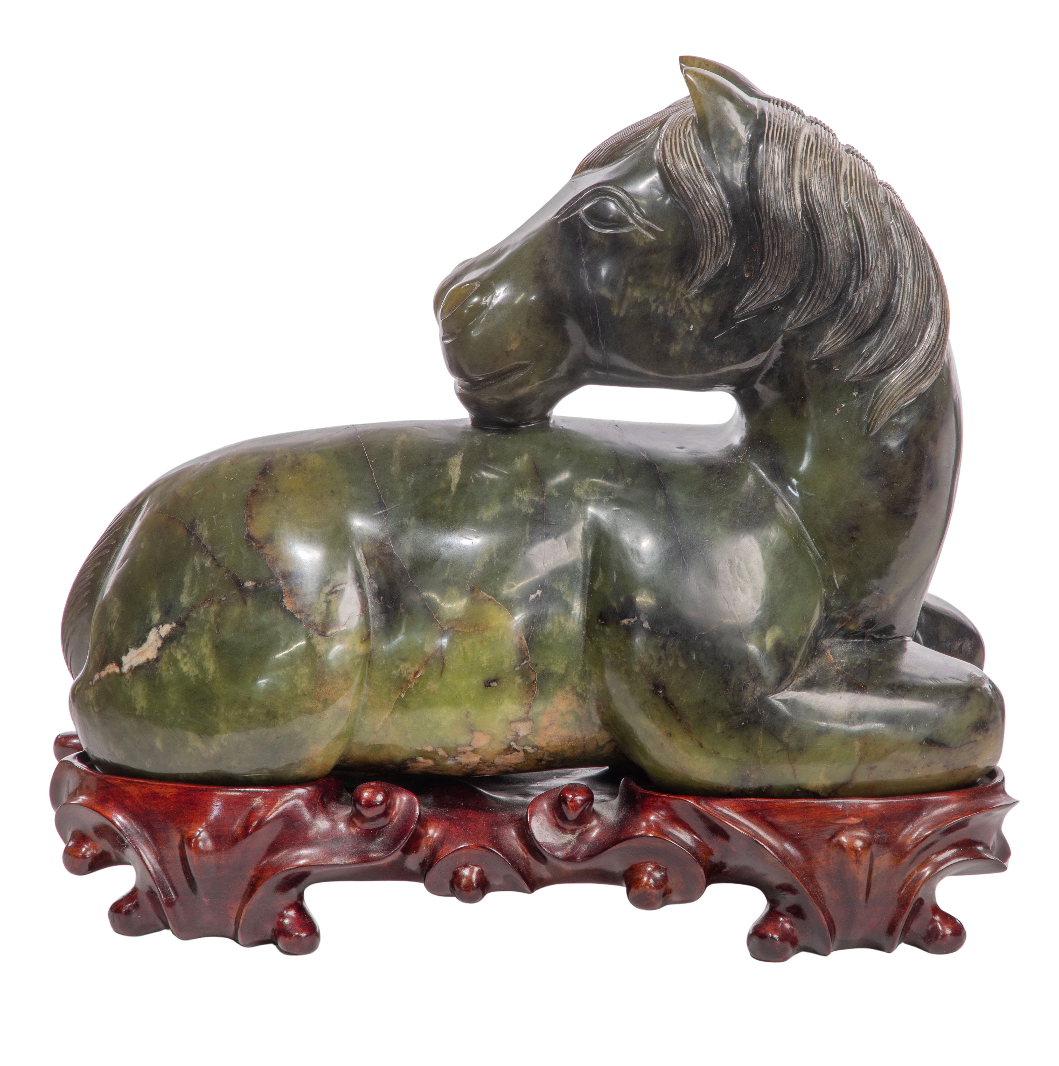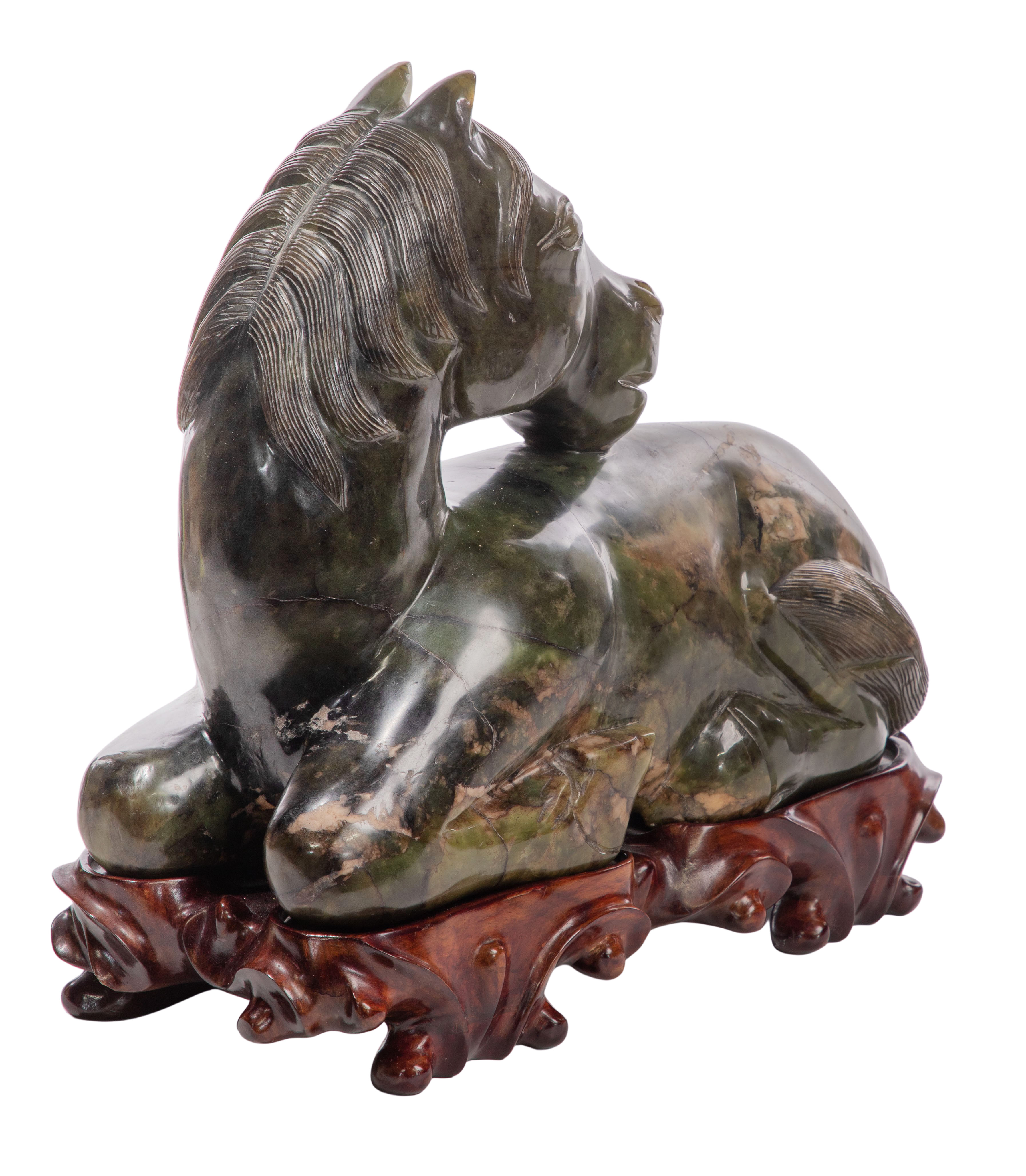 A hand carved reclining horse in green jadeite jade on a carved wood plinth