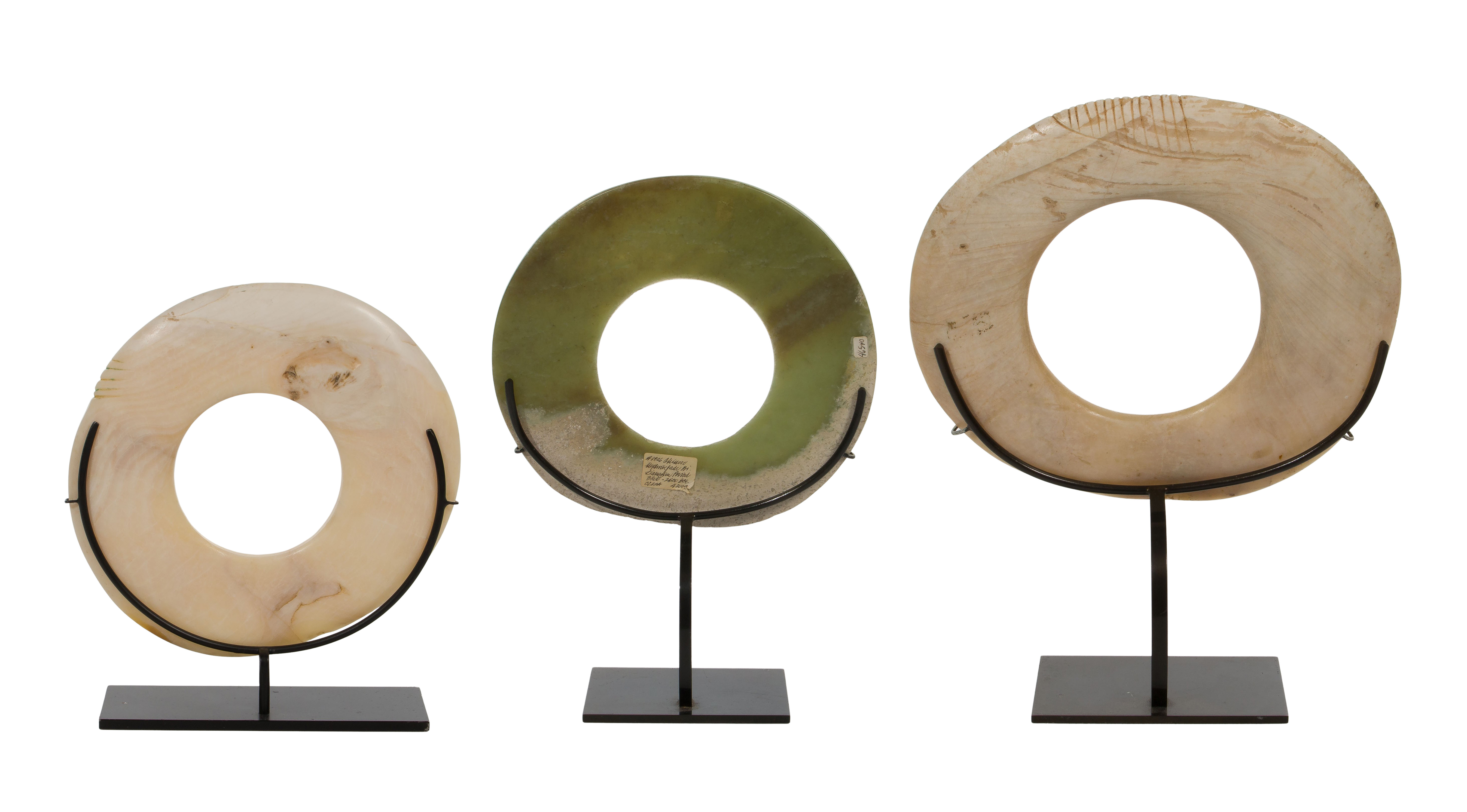 (3) total items including shell rings made from the marble-like shell of the giant clam, one edge having incisions; together with a Chinese jadeite jade bi-disk, all having stands
