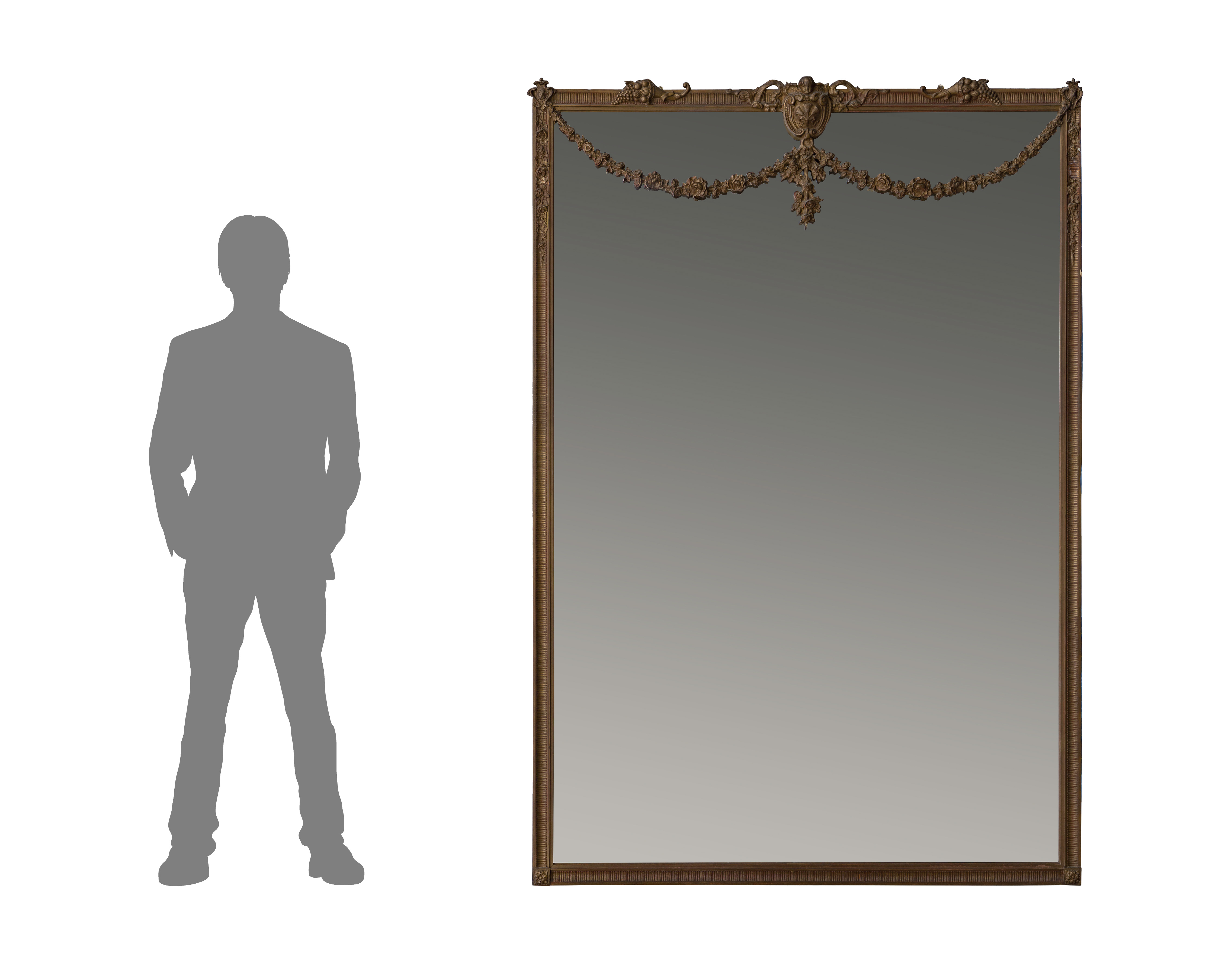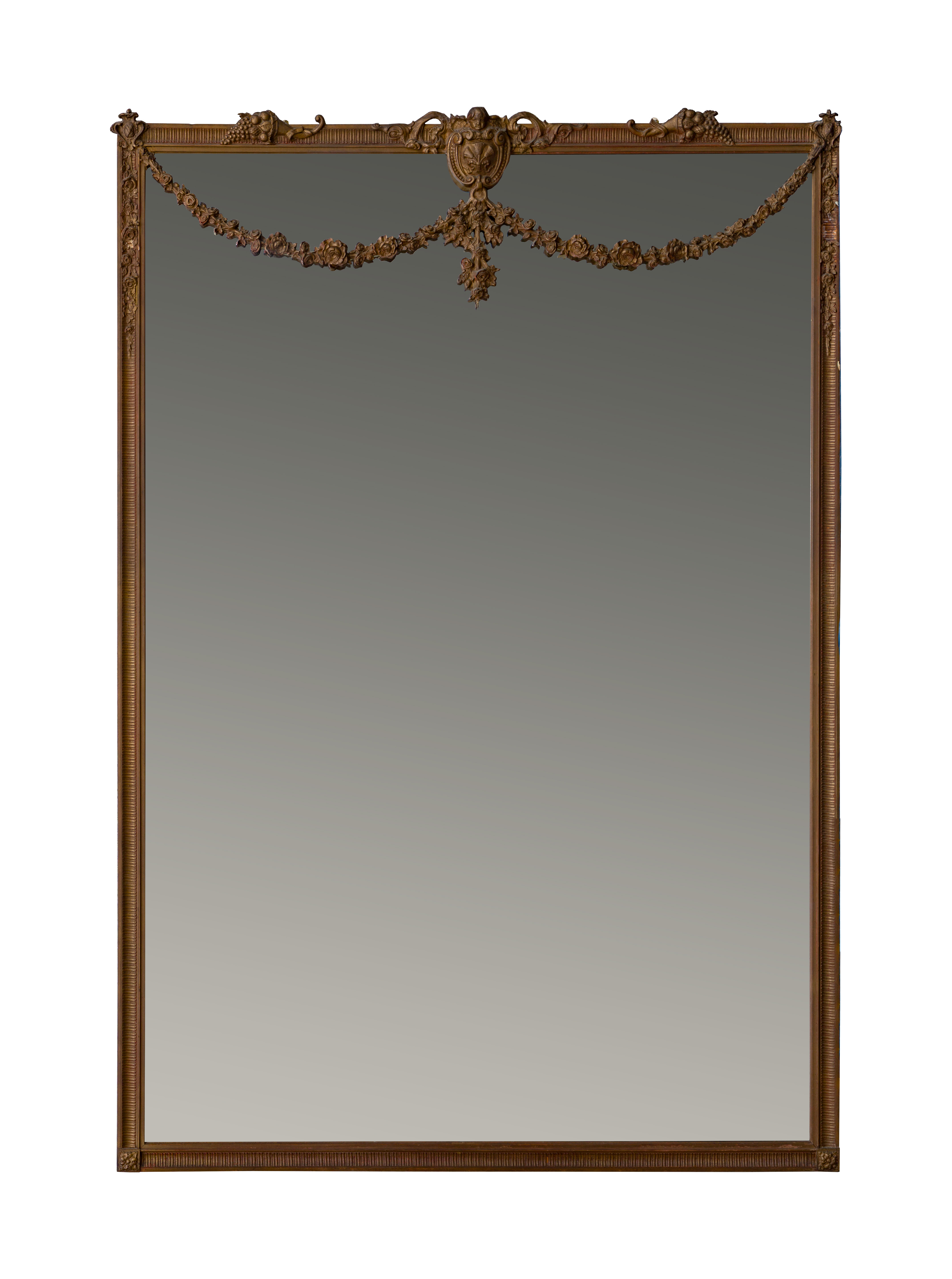 An entry mirror having a cherub shield and garland top, in a bronze painted gesso on wood frame