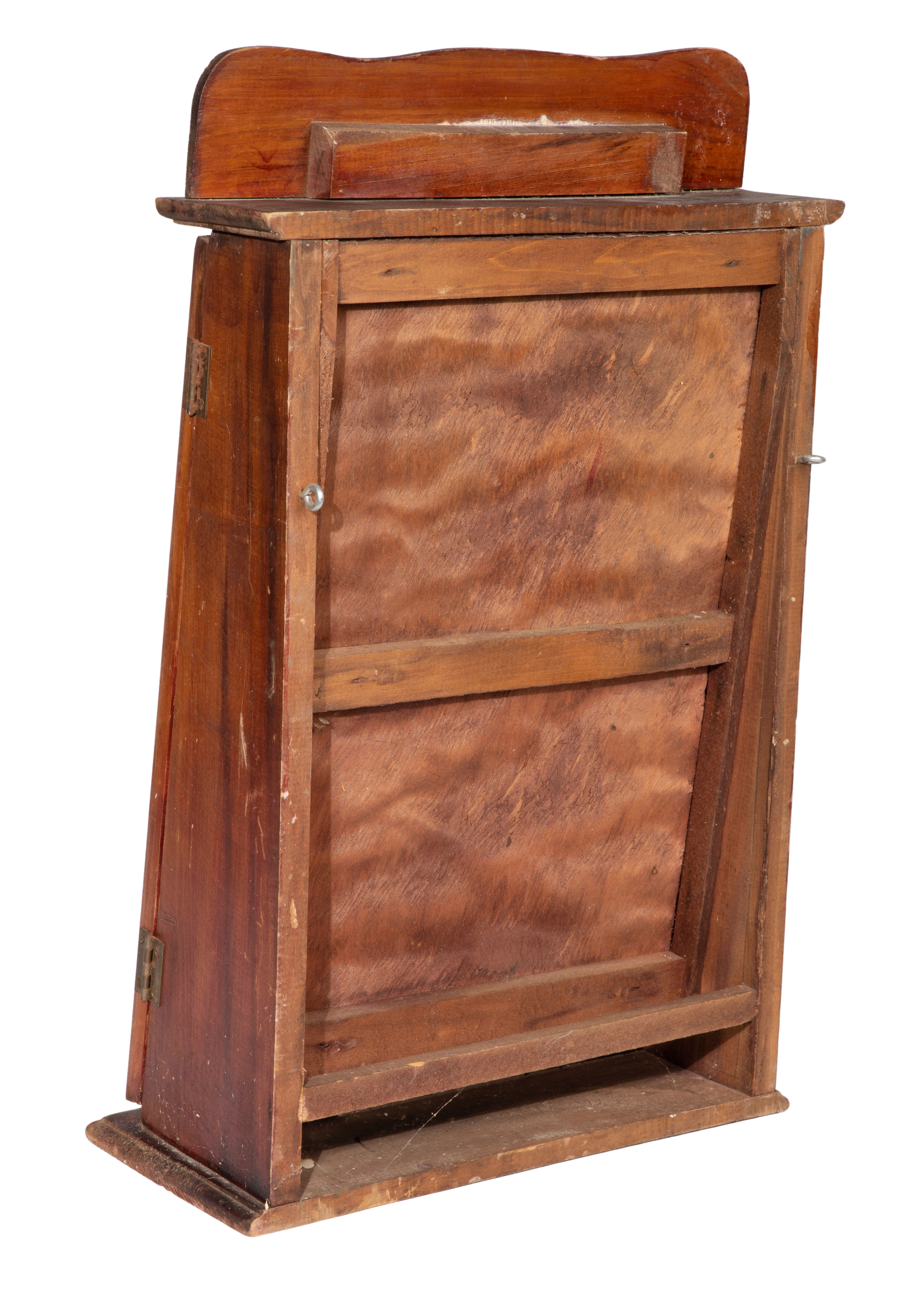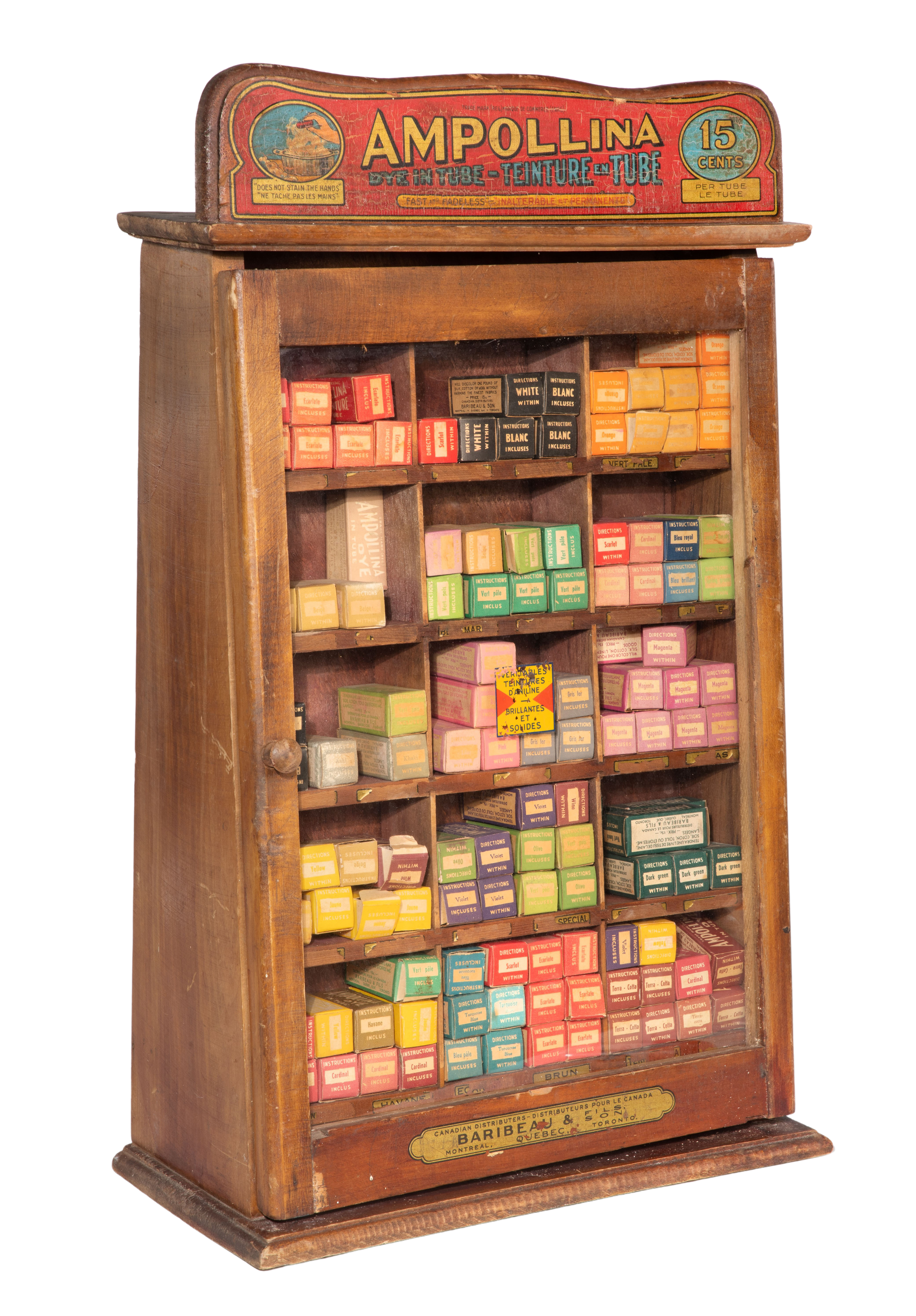 Having fifteen compartments holding corked glass tubes of aniline dyes of many colors having instruction sheets and boxes, behind a slant front framed glass door and having dual language French / English decals
