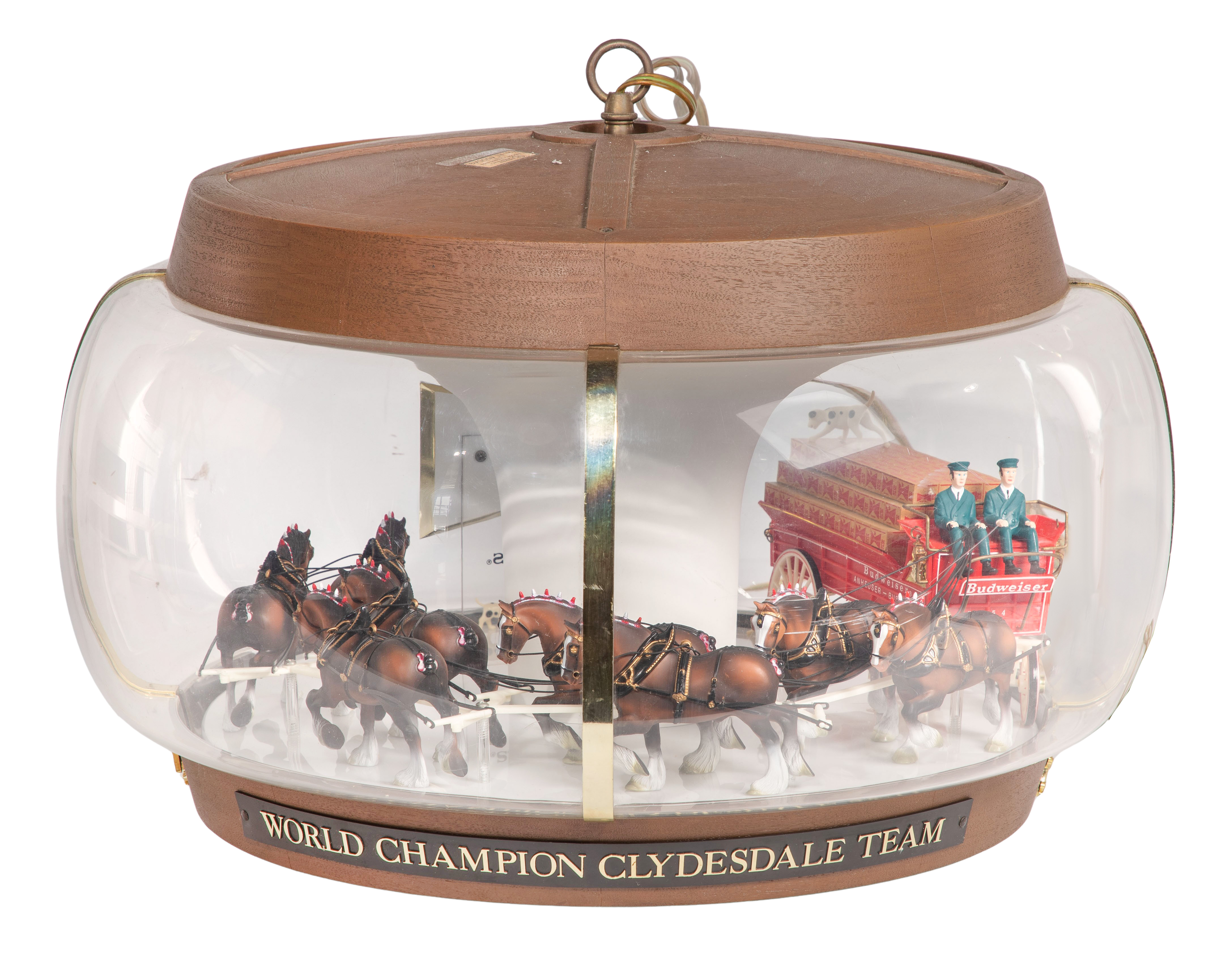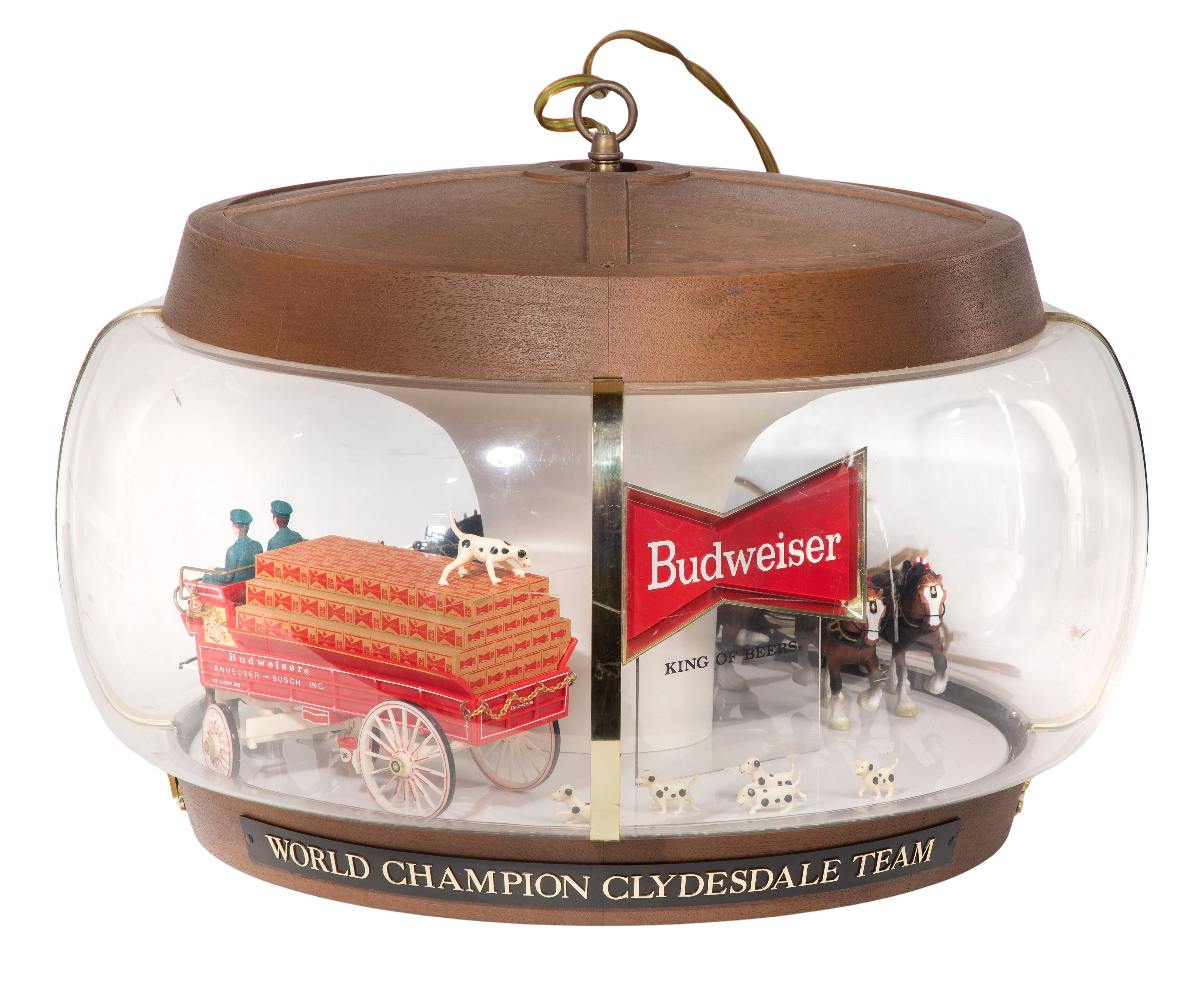 Hanging motion light-up advertising display, depicting an eight-horse Clydesdale team pulling the two-driver Budweiser wagon, a pack of dalmatians following behind, the lower rim of the fixture having the Anheuser-Busch emblem and ‘World Champion Clydesdale Team’ twice
