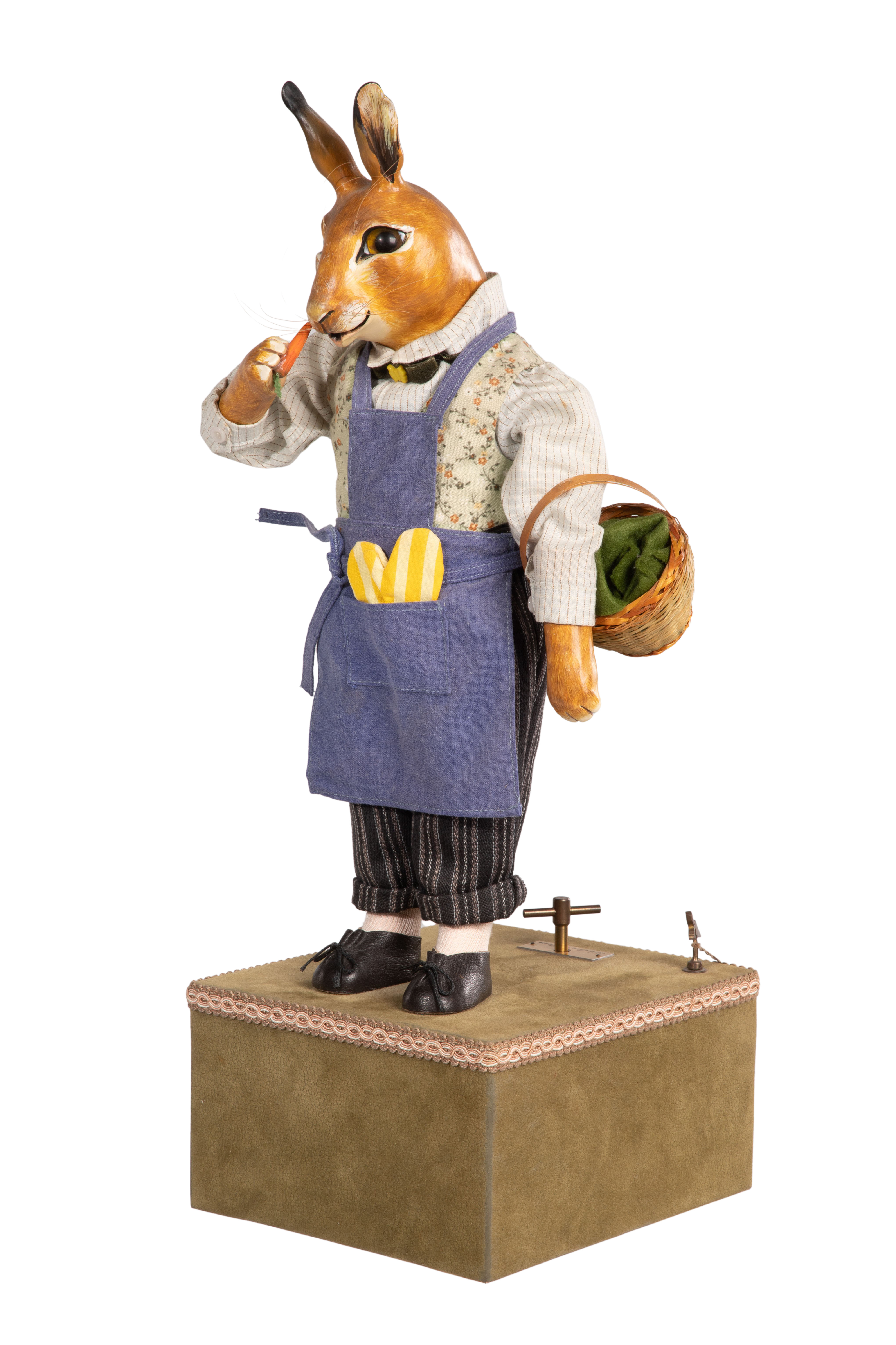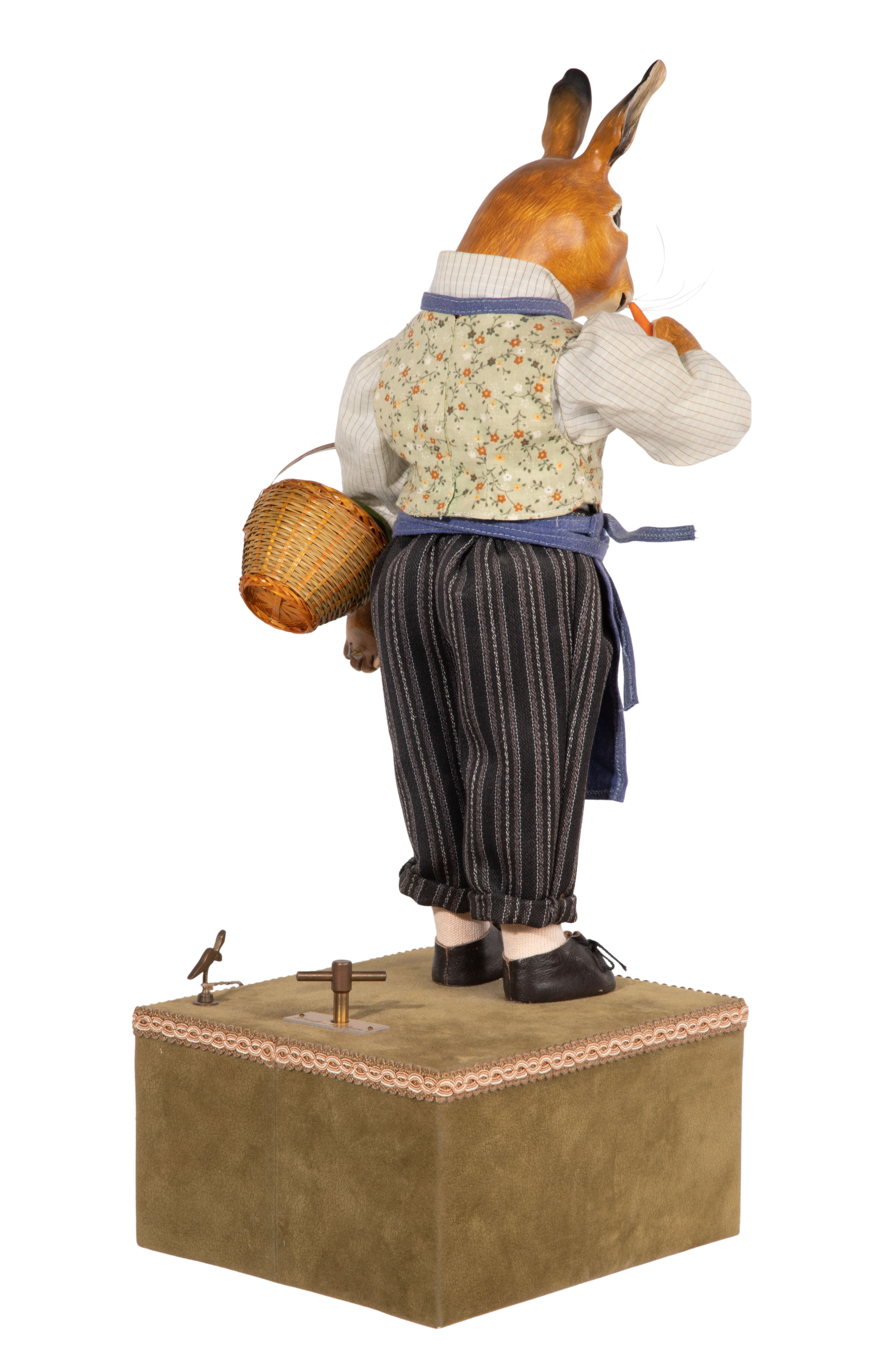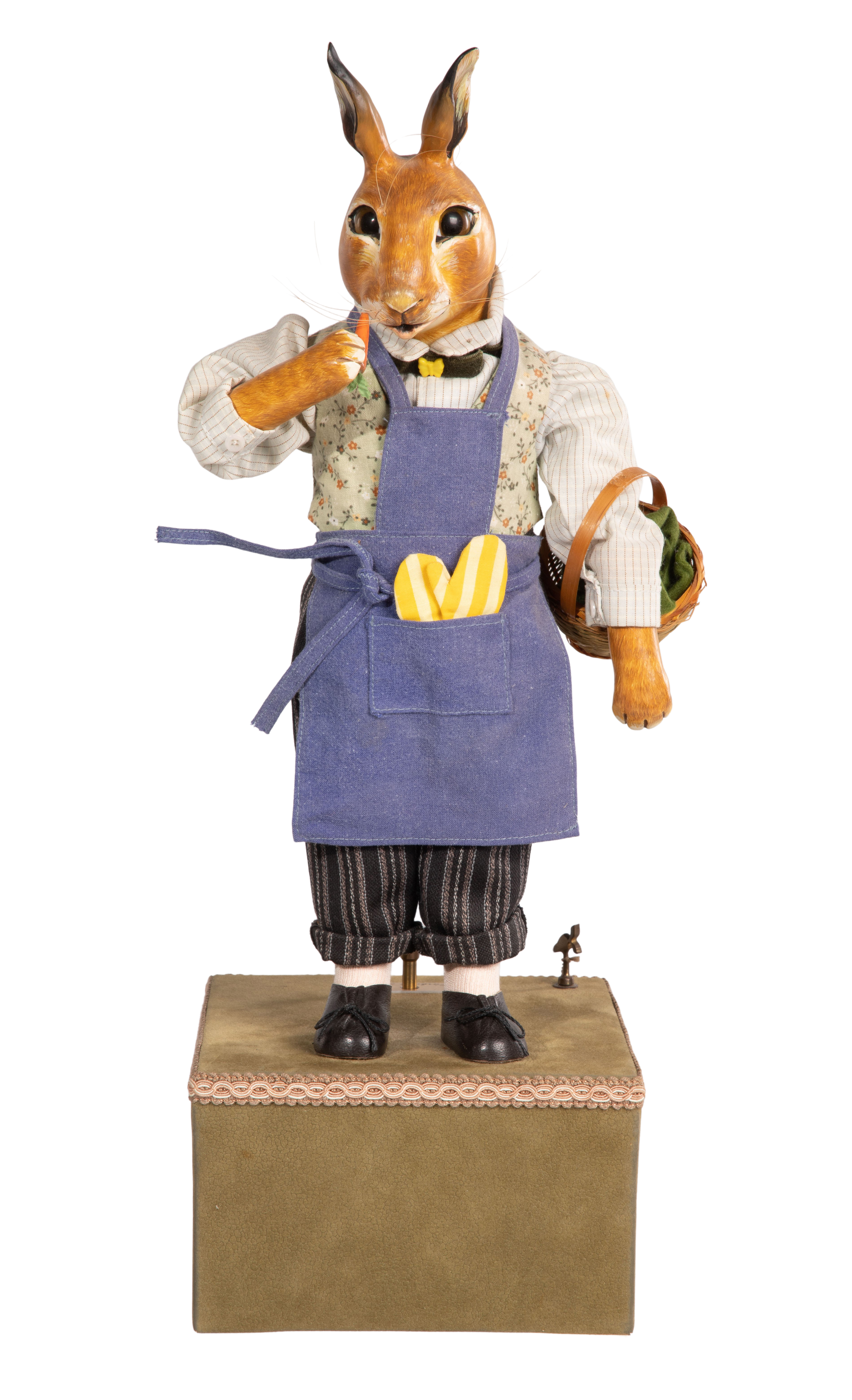 Depicting a rabbit, dressed and carrying a basket, who raises his carrot towards his mouth, the Swiss movement by Reuge plays ‘Minuet Gavotte’ by Mozart, having a carrot shaped on / off switch and stamped ‘l’Arbre a Pain’ mark to key port, retaining rubber stamped and hand written hang tag, COA having ink signatures of designers Anne Pradere and Dominique Jalabert