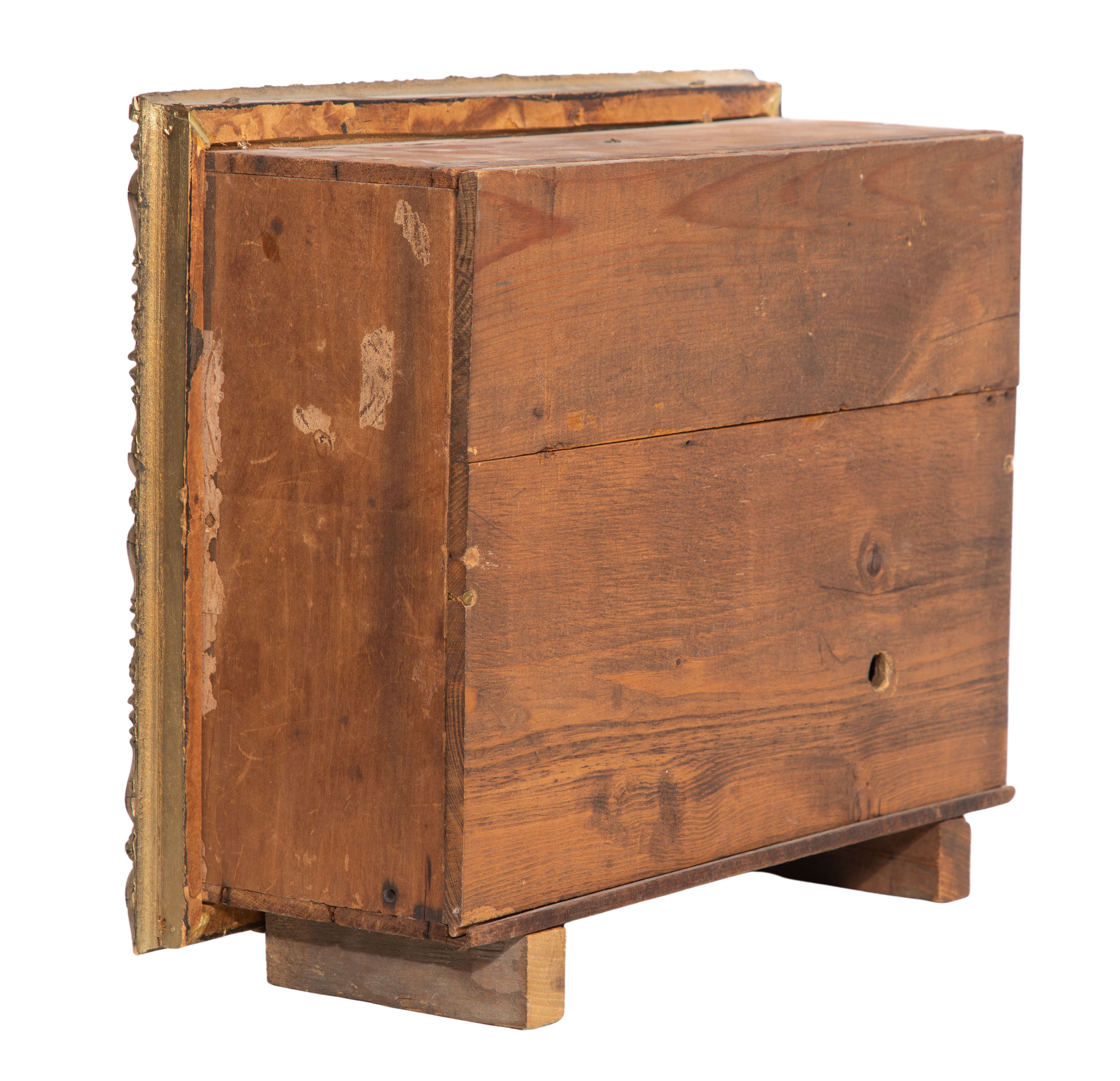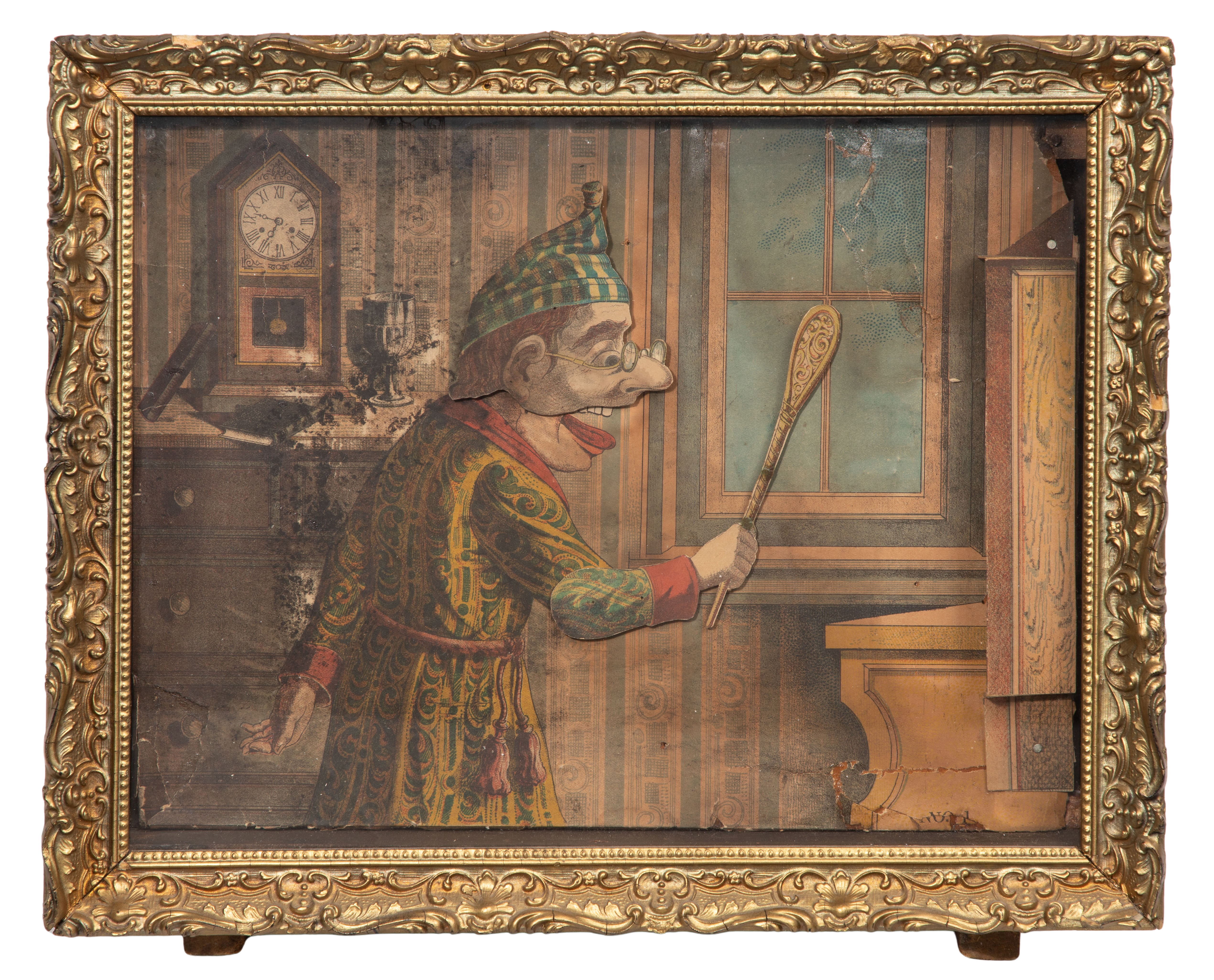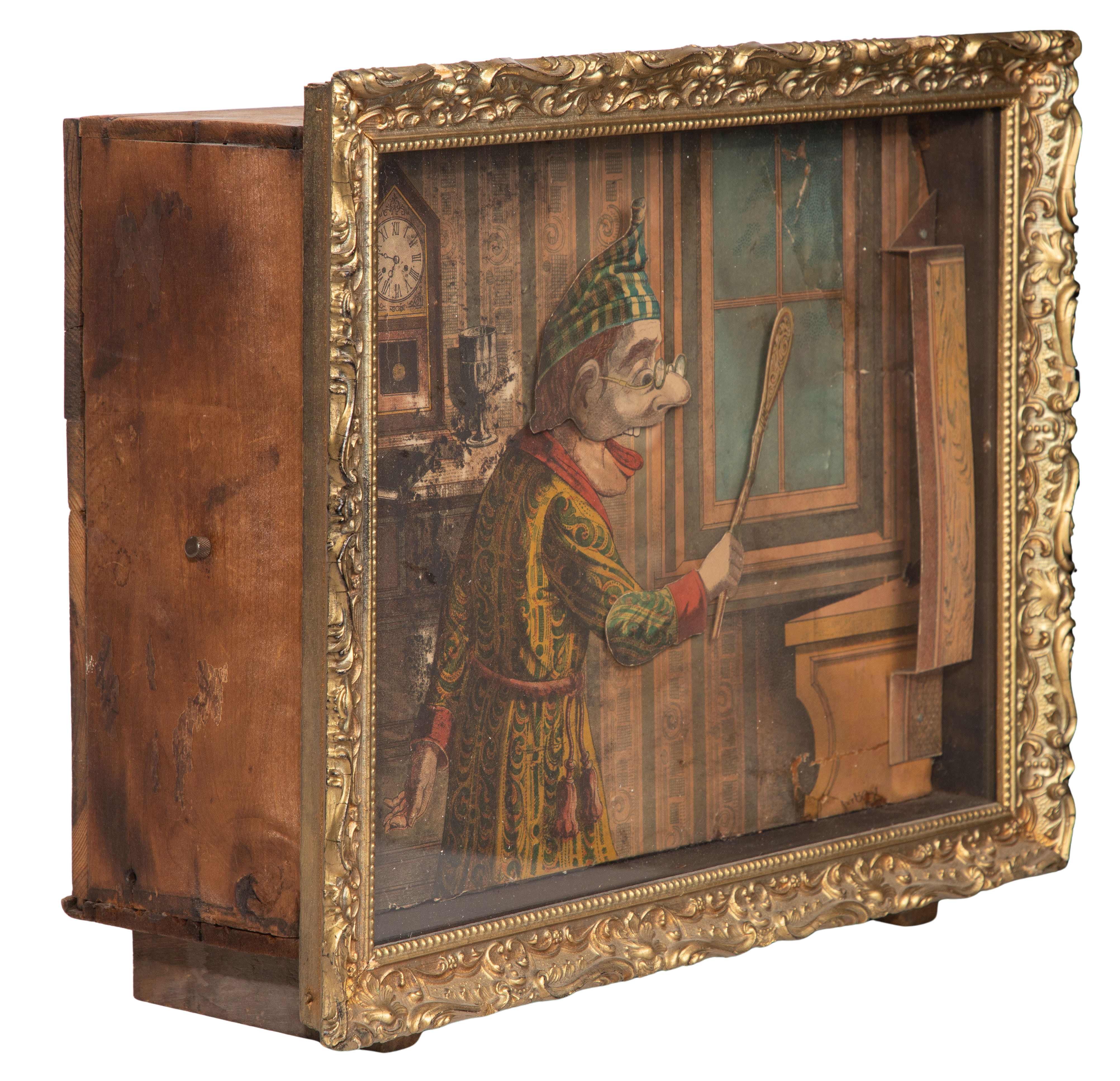 Paper lithograph image depicting a man attempting to swat a dodging mouse, clockwork mechanism activates arm, head and mouse actions, wood frame having acrylic front