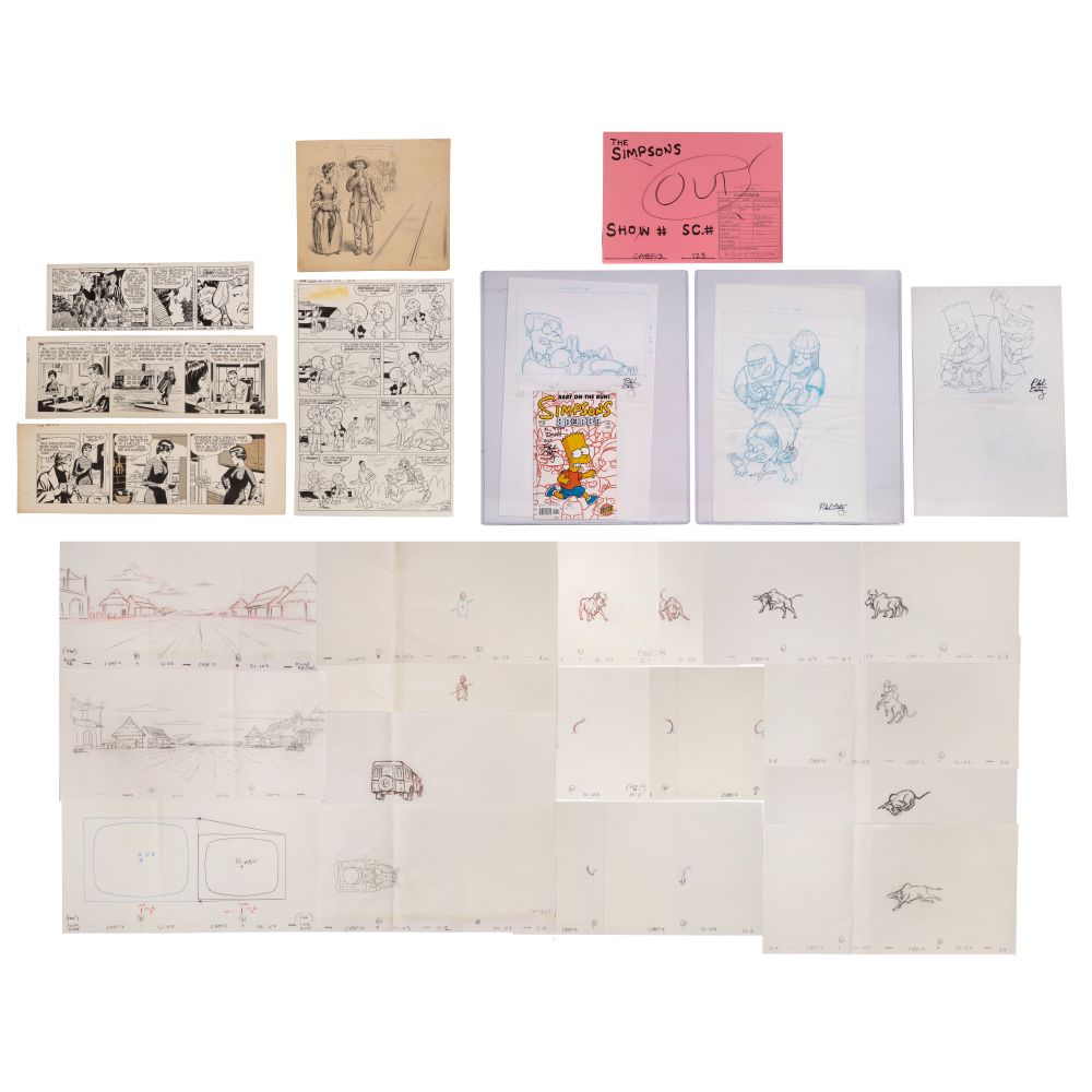 (29) total items including production drawings from ‘The Simpsons’, some signed by Phil Ortiz, and production panels from Richie Rich, W. A. Rogers political cartoonist and comic strip panels; together with a Simpsons comic book