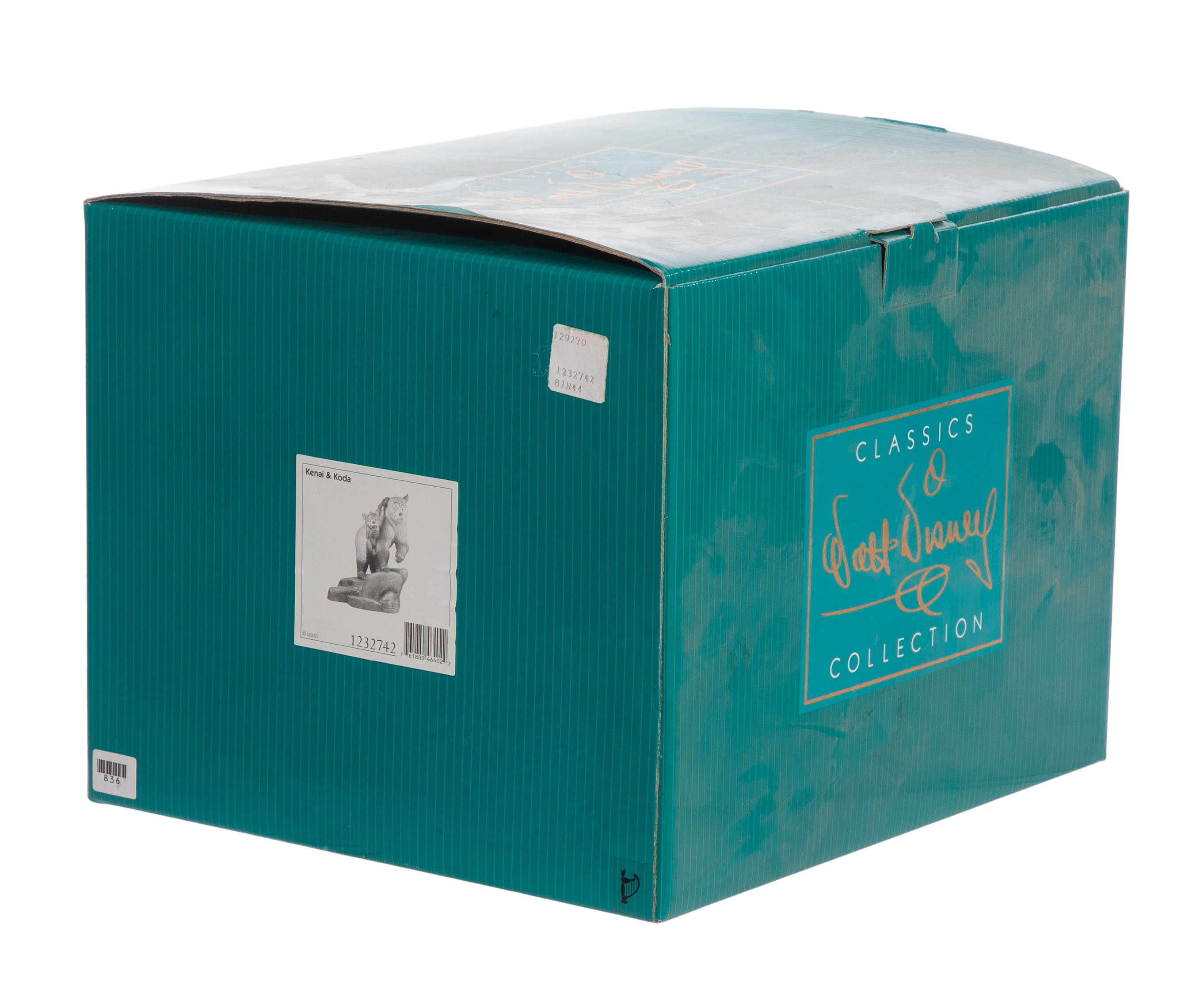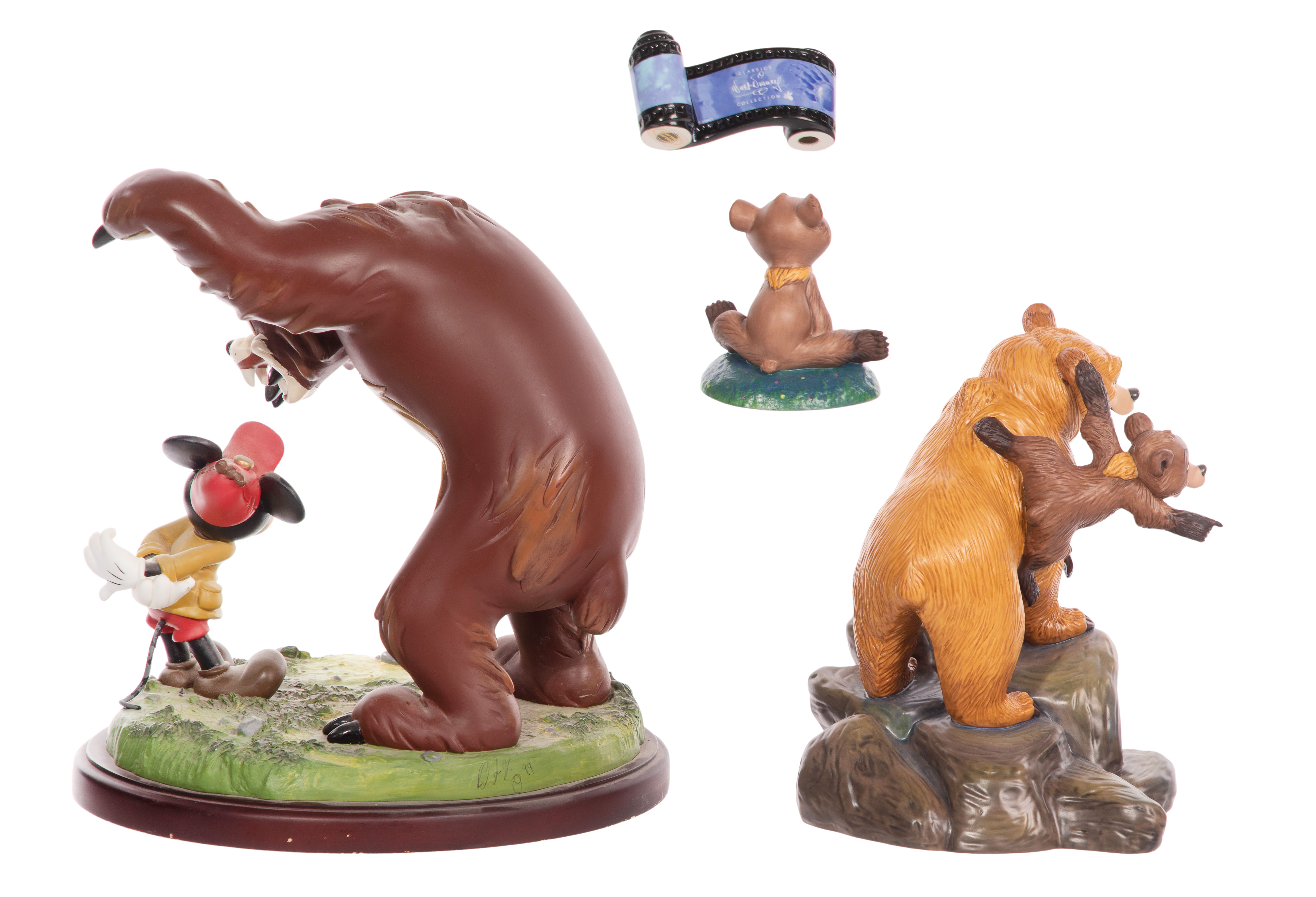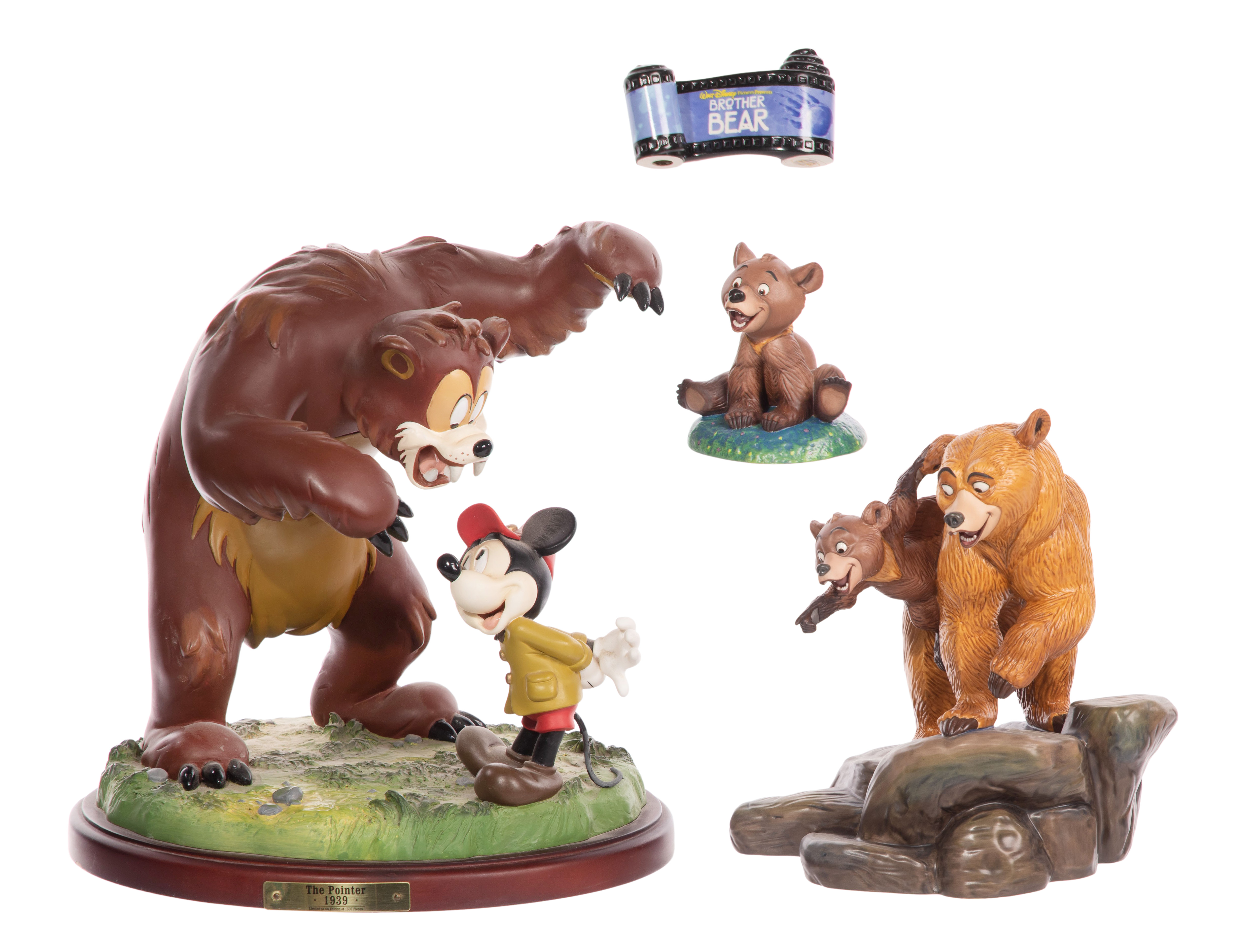 (4) items including in resin a 1999 Safari Adventure Official Disneyana Convention, ‘The Pointer’, #627/1500, depicting Mickey threatened by a bear, on brass labeled faux wood base as well as in porcelain ‘Brotherly Time’, #836/2000 having packaging and box, ‘Sitting Cub’ and an opening title plaque from ‘Brother Bear’ marked on underside