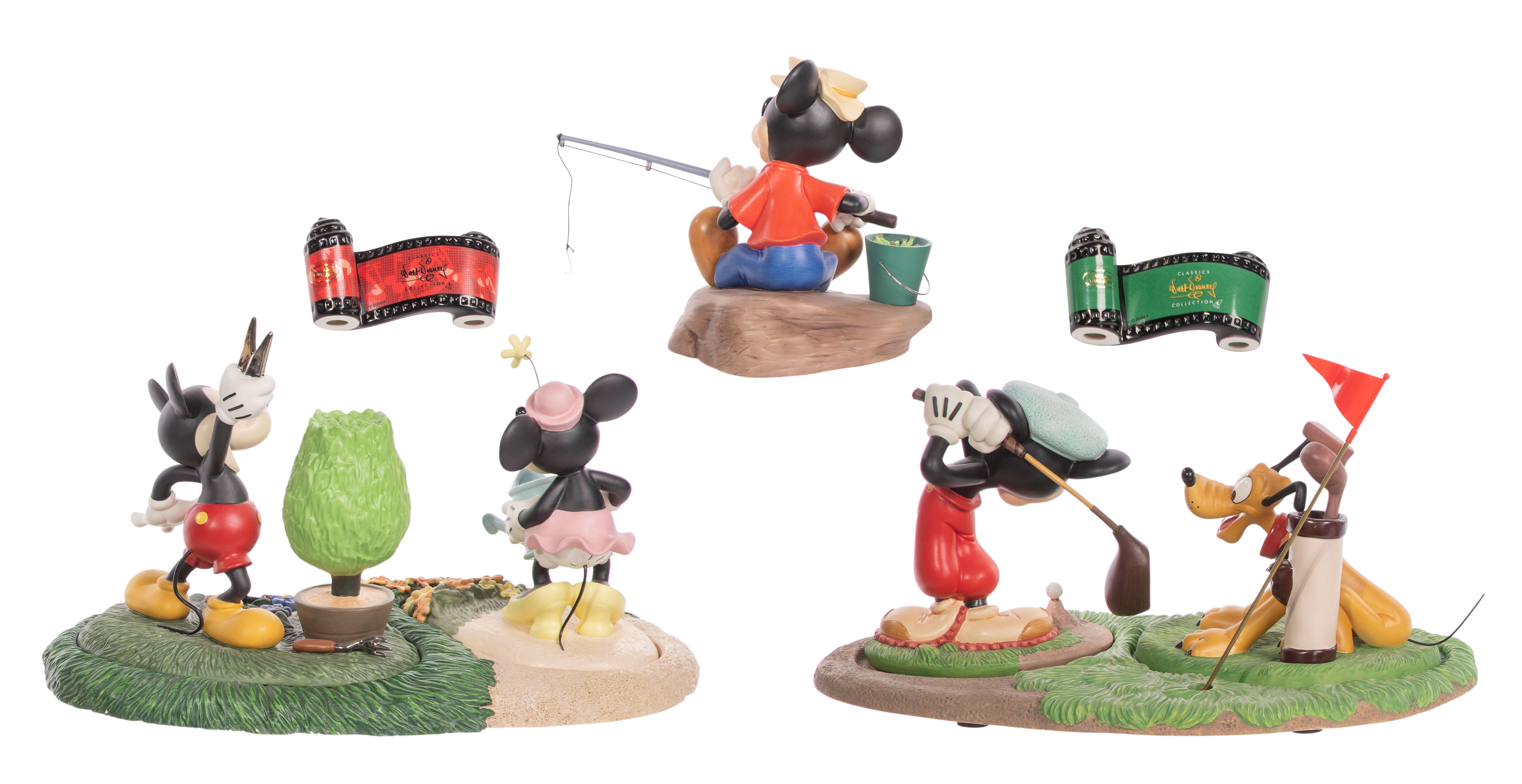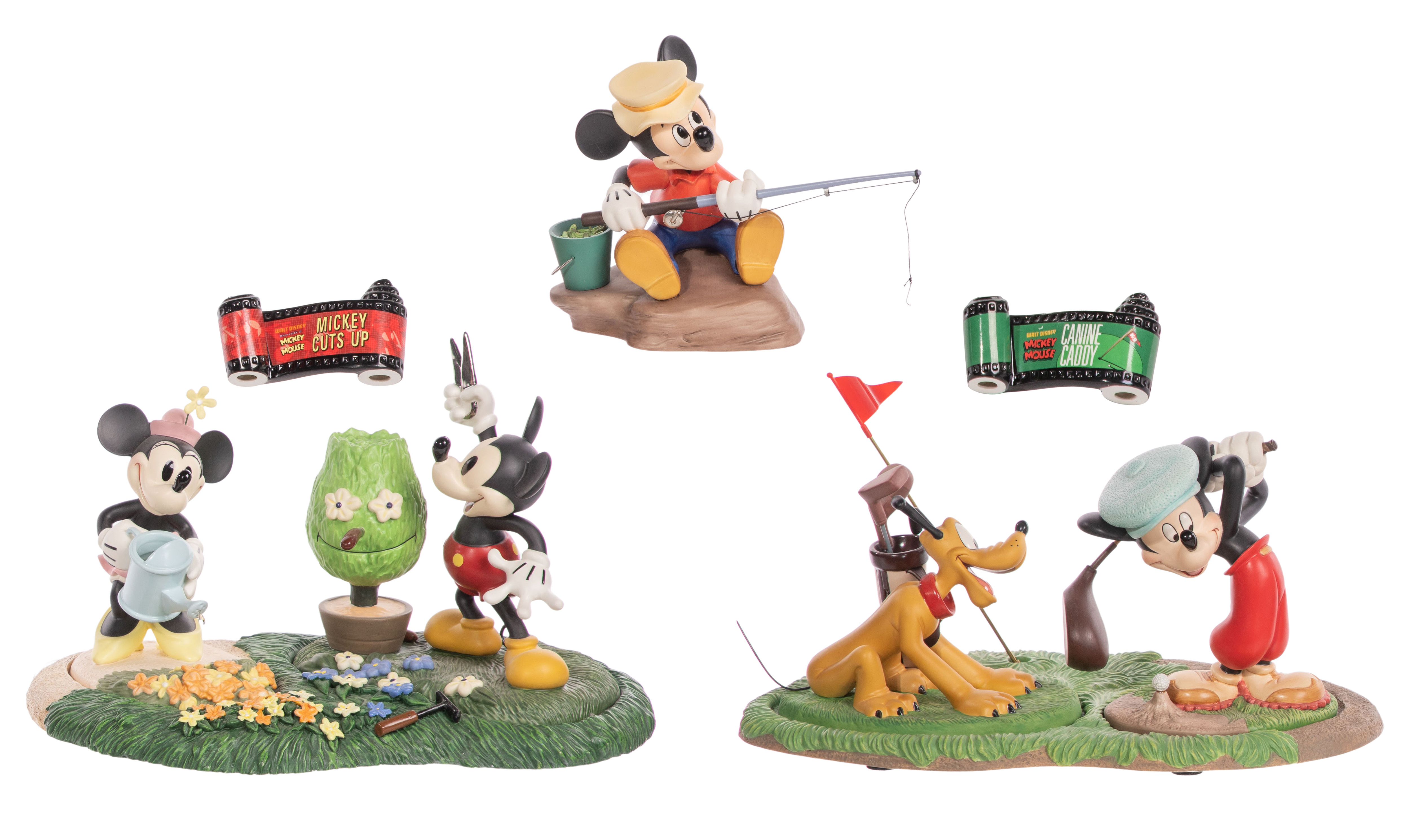 (5) items including a porcelain 3-piece Mickey and Minnie set ‘Mickey’s Cup Up’ having resin base, a porcelain 3-piece Mickey and Pluto set ‘Canine Caddy’ having resin base, a porcelain ‘Somethin’ Fishing’ Mickey and (2) film strip plaques, all marked on underside