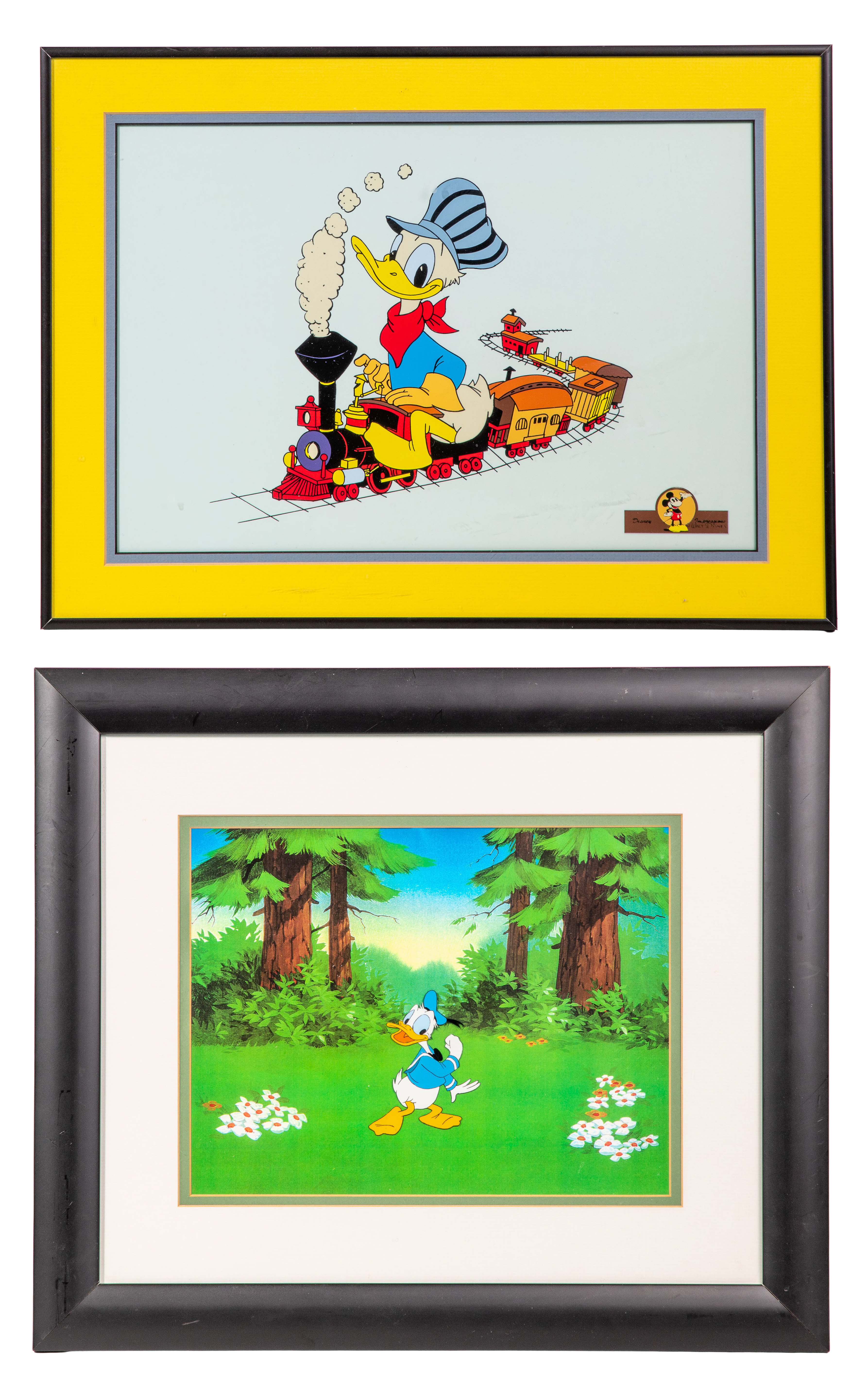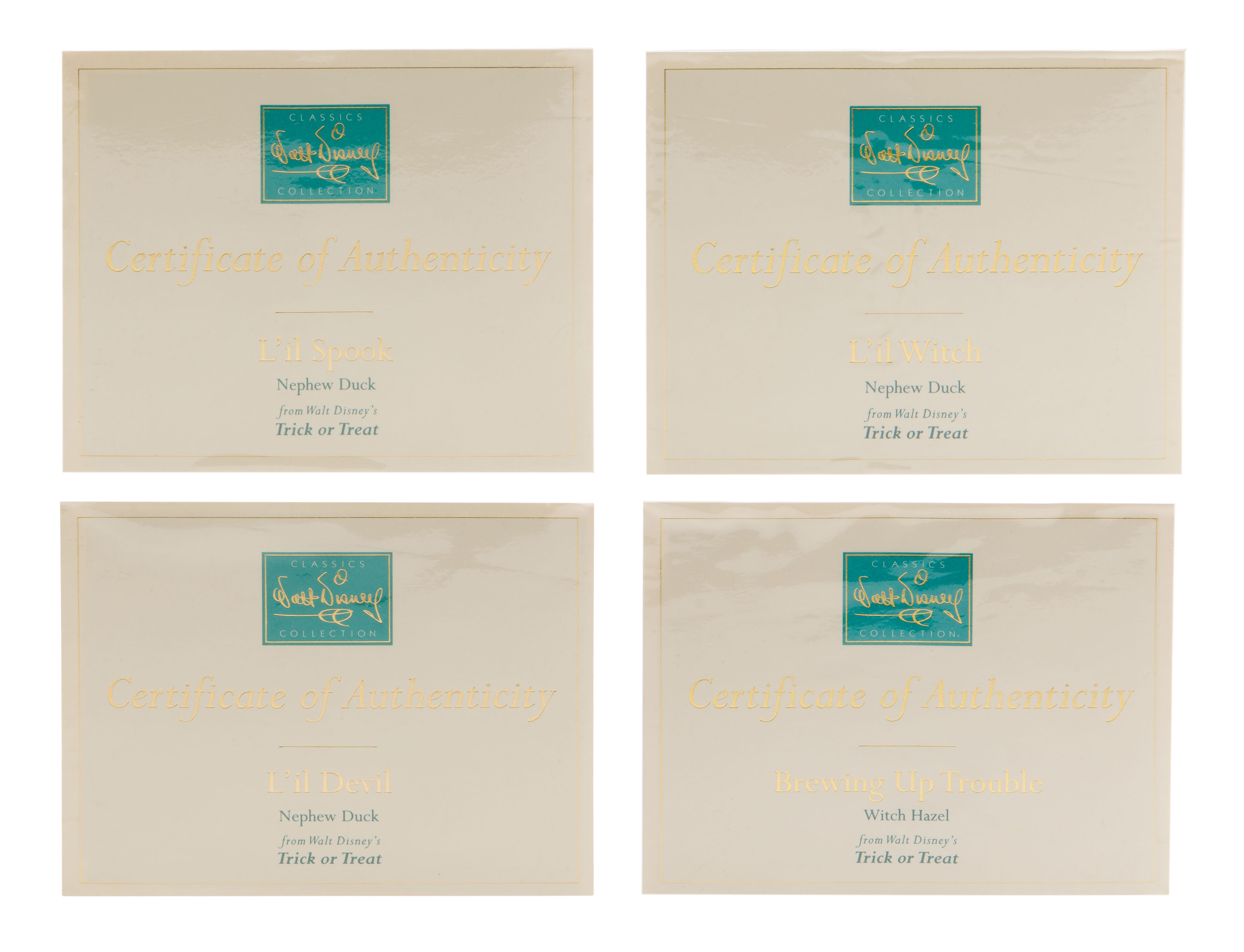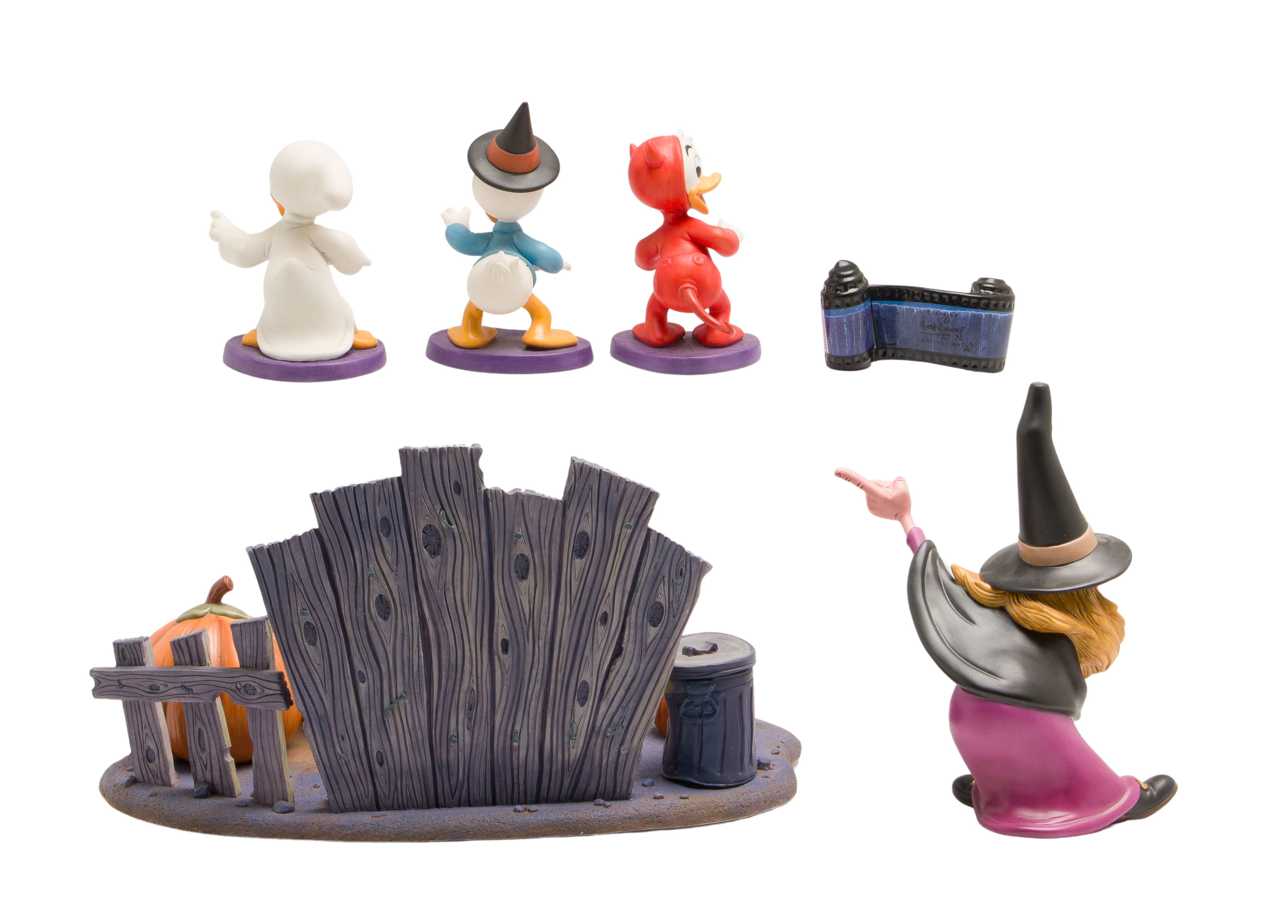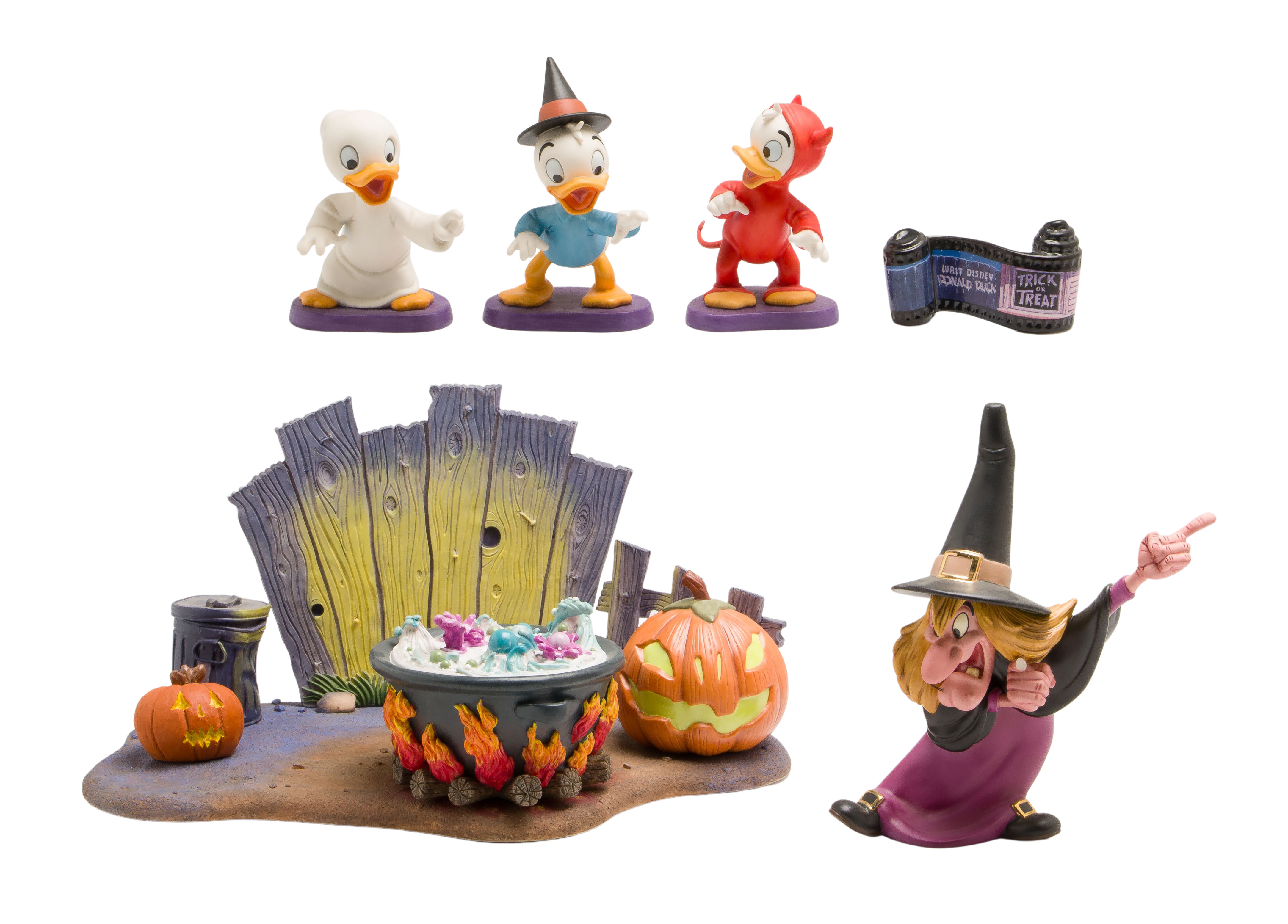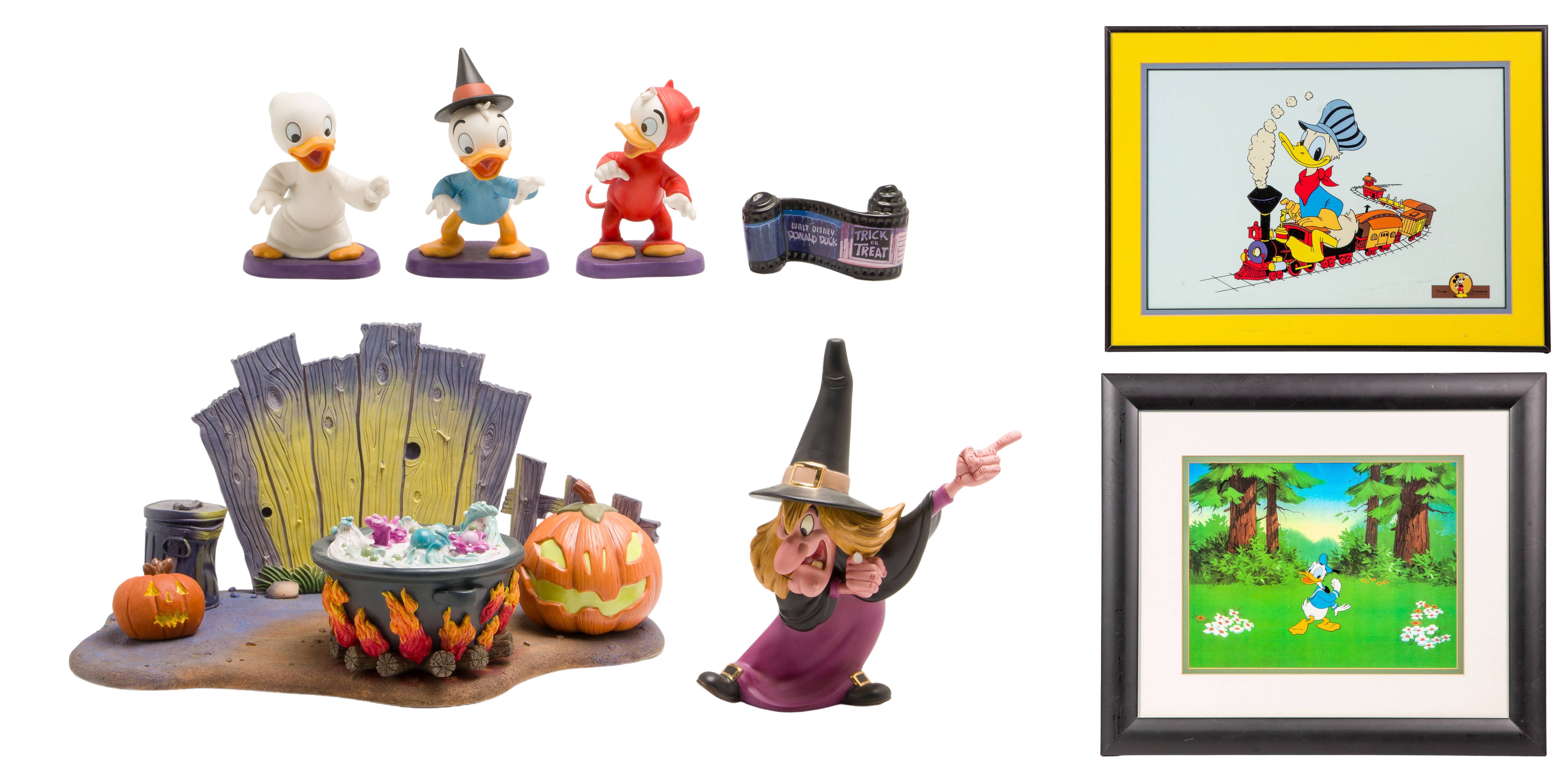 (8) items including a set of (6) Trick or Treat porcelain items including ‘Lil Witch’, ‘Lil Spook’, ‘Lil Devil’, ‘Brewing Up Trouble’, a title plague and a base, most having boxes and COAs, a Donald Duck in the woods serigraph and a print of Donald duck as a train conductor from the short ‘Out of Scale’, both matted under acrylic in wood and metallic frames