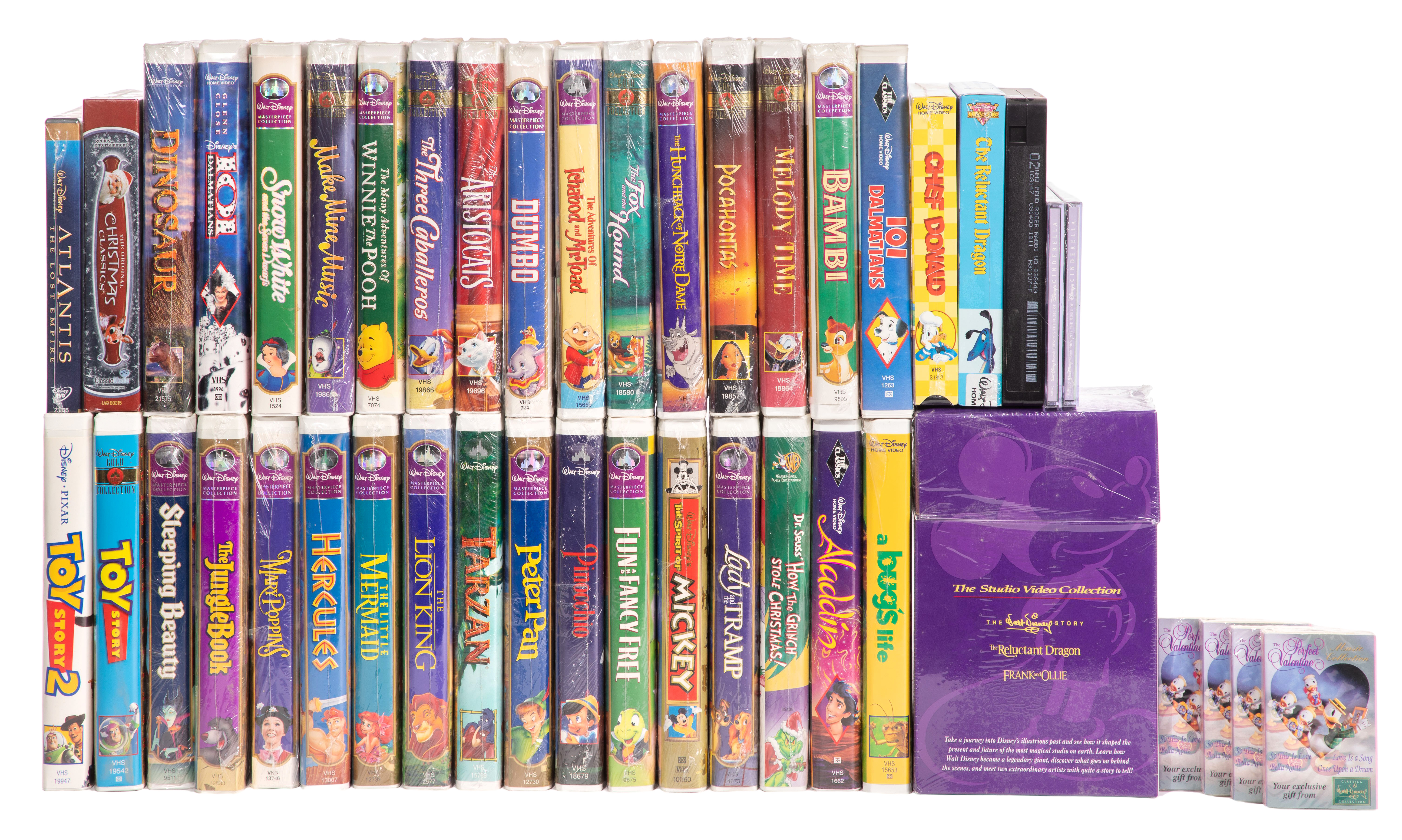 Approximately (30) items including a 1996 McDonald’s ‘One Hundred and One Dalmatians’ collection box set appearing complete, (5) Disney dressed dolls having resin heads and fabric bodies, (2) Barbies in original boxes, a 1938 coloring book, (5) Dell comic books, a wood working set, a Mickey Mouse Club tambourine and other objects as well as promo and other various items; together with approximately (35) VHS videos and compact discs including ‘Lady and the Tramp’, ‘Mary Poppins’, ‘The Lion King’, ‘Sleeping Beauty’ as well as music CDs, most being sealed