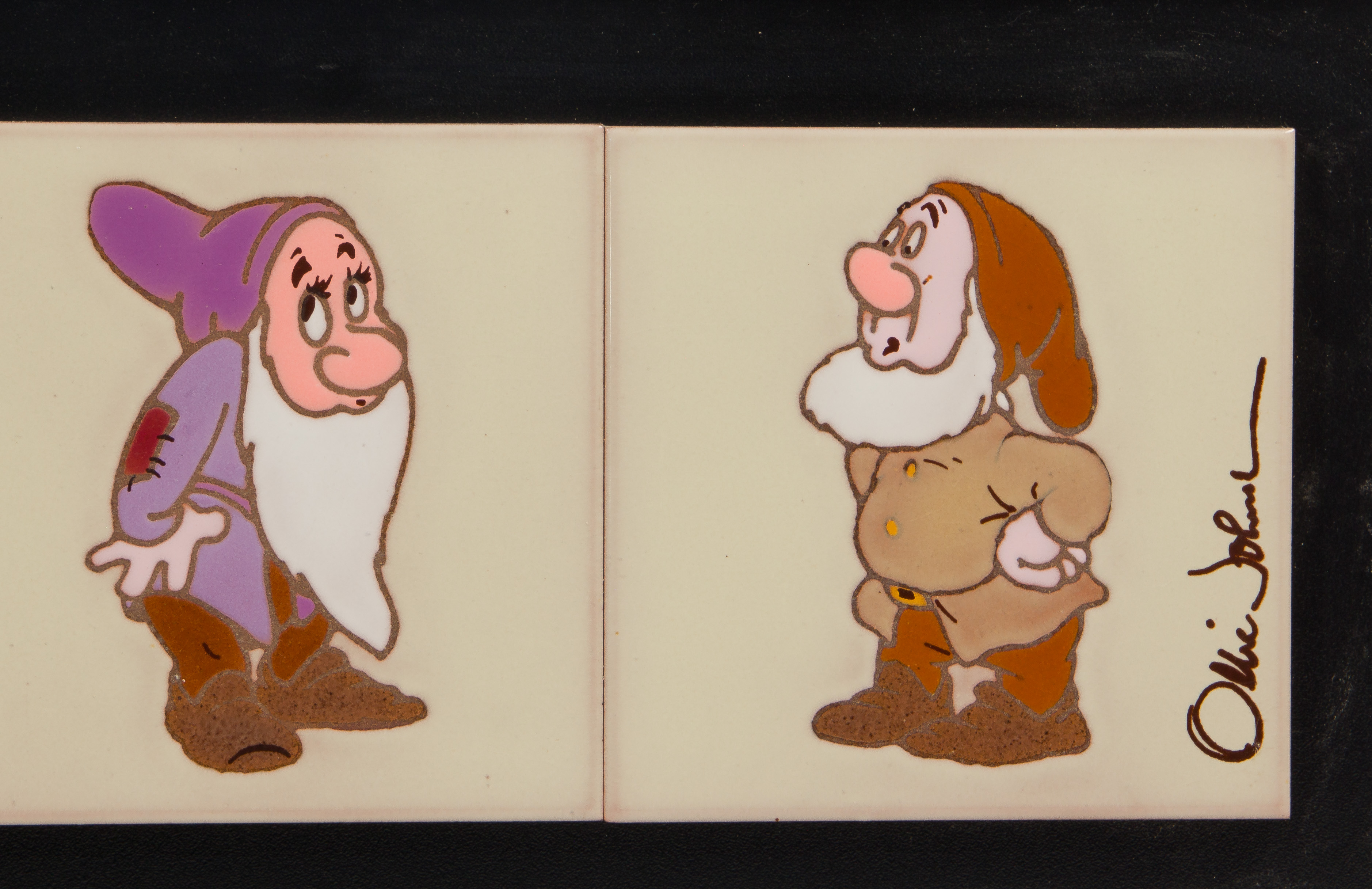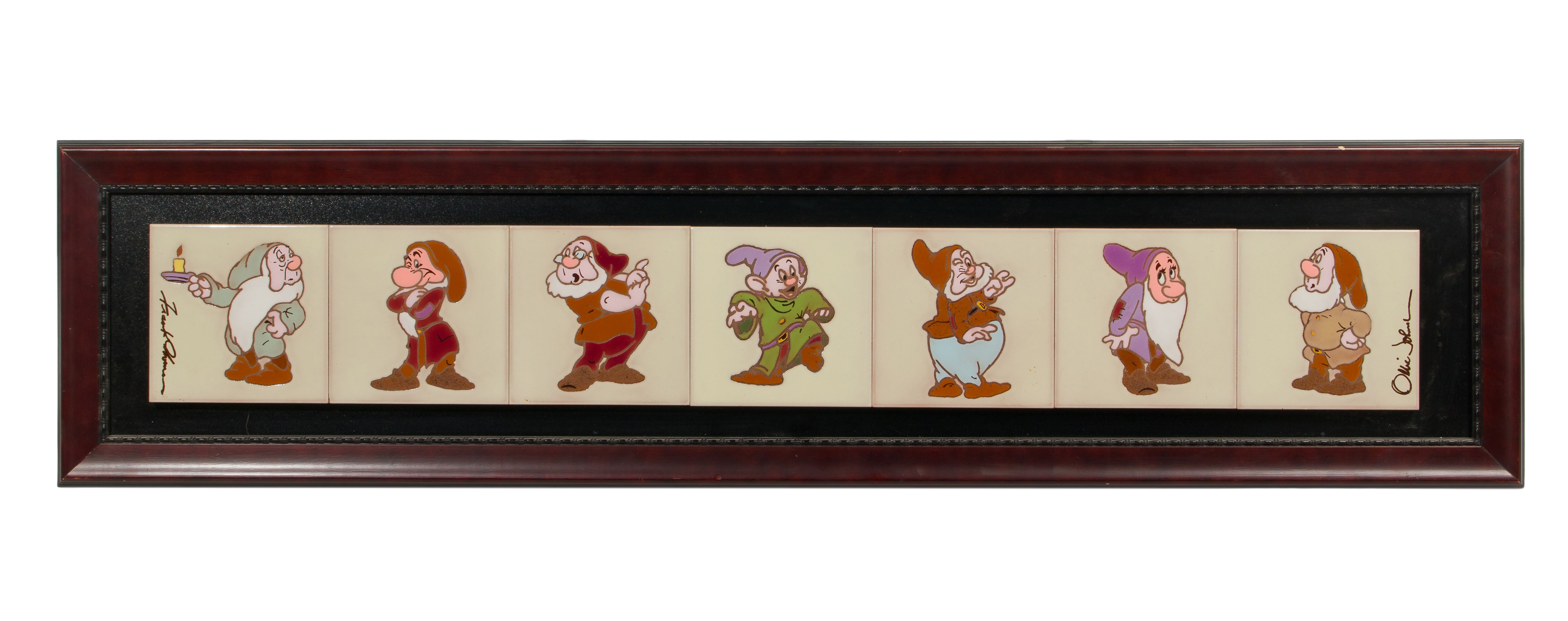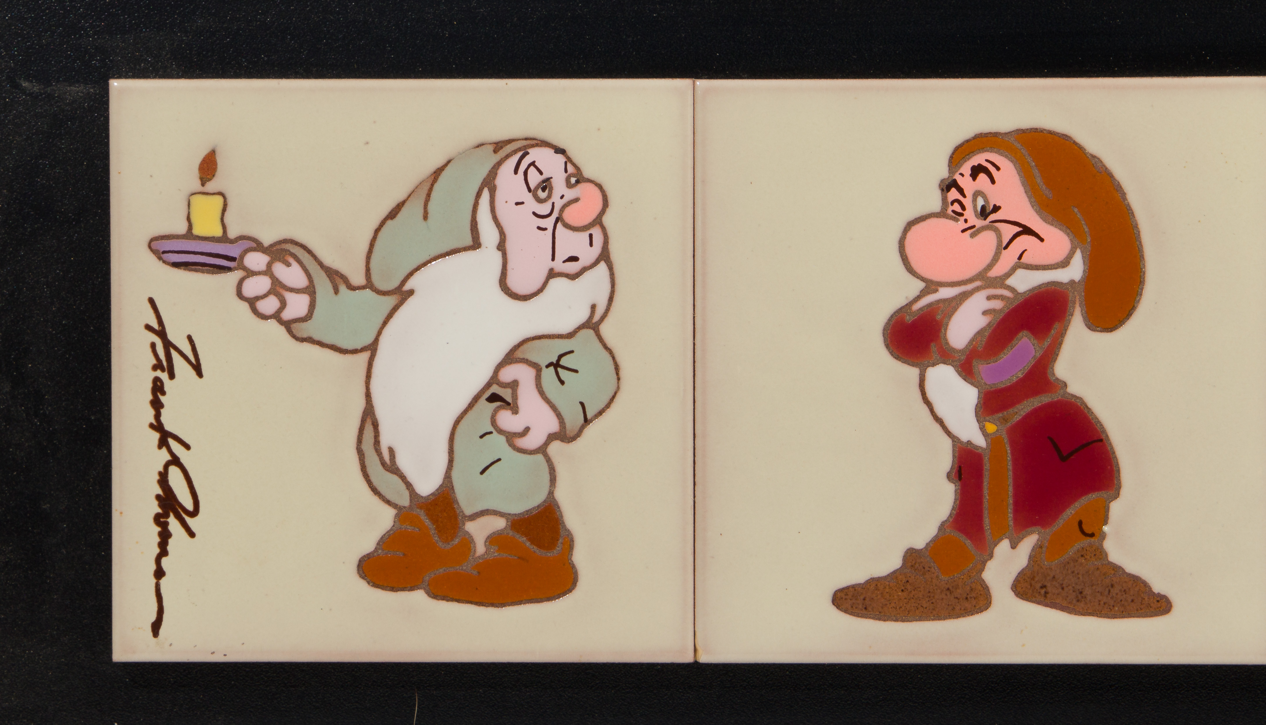 2000, seven ceramic tiles depicting the Seven Dwarfs by White Horse Studio, end tiles and verso signed ‘Frank Thomas’ and ‘Ollie Johnston’, float mounted in a wood frame