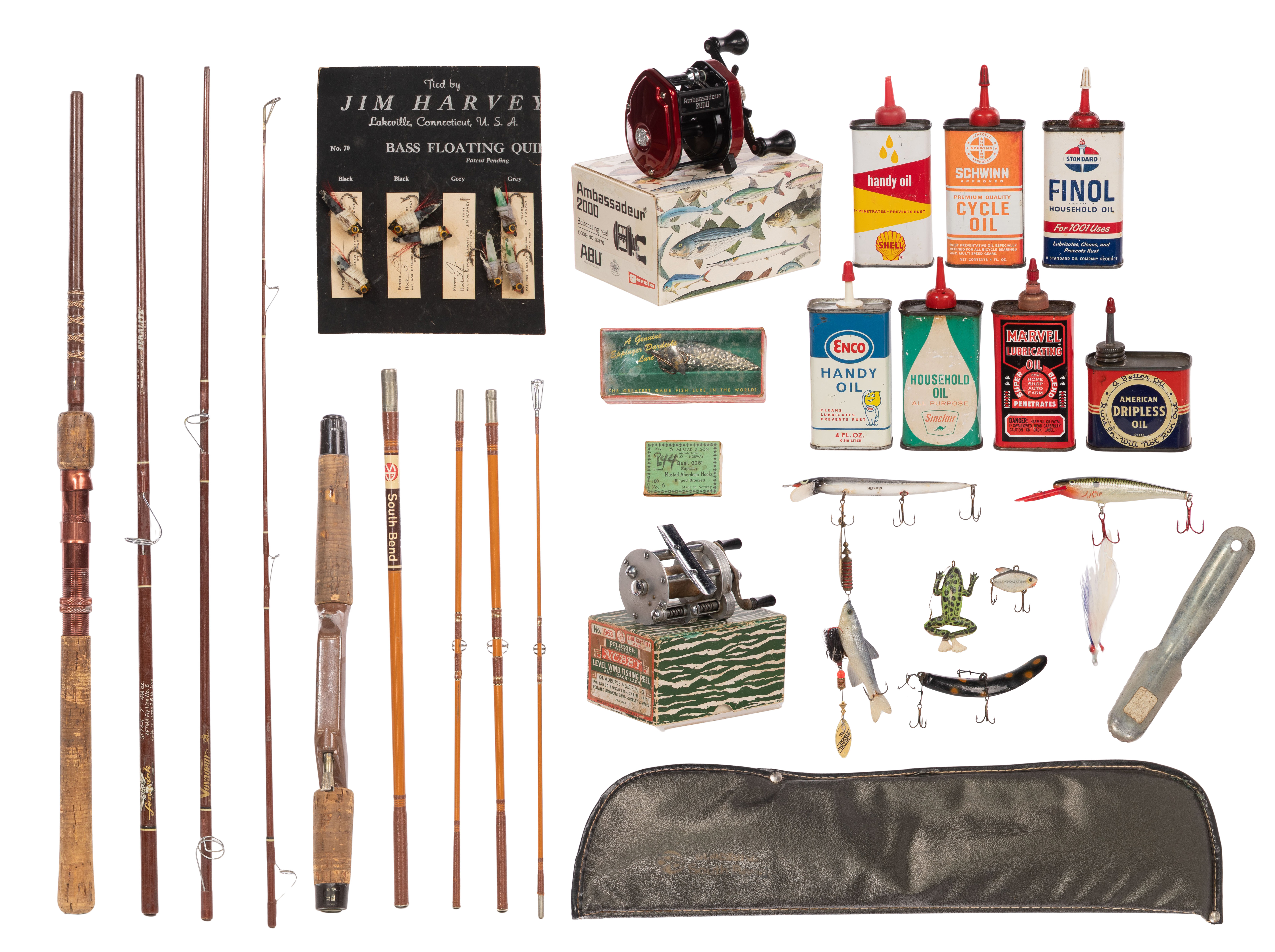 Approximately (25) total items including a Fewnwick Voyager fly fishing rod, a South Bend Outdoorsman pack rod having case, (2) reels including a Pflueger ‘Nobby’ and an Ambassadeur ‘2000’ as well as Jim Harvey flies and other items; together with empty oil cans