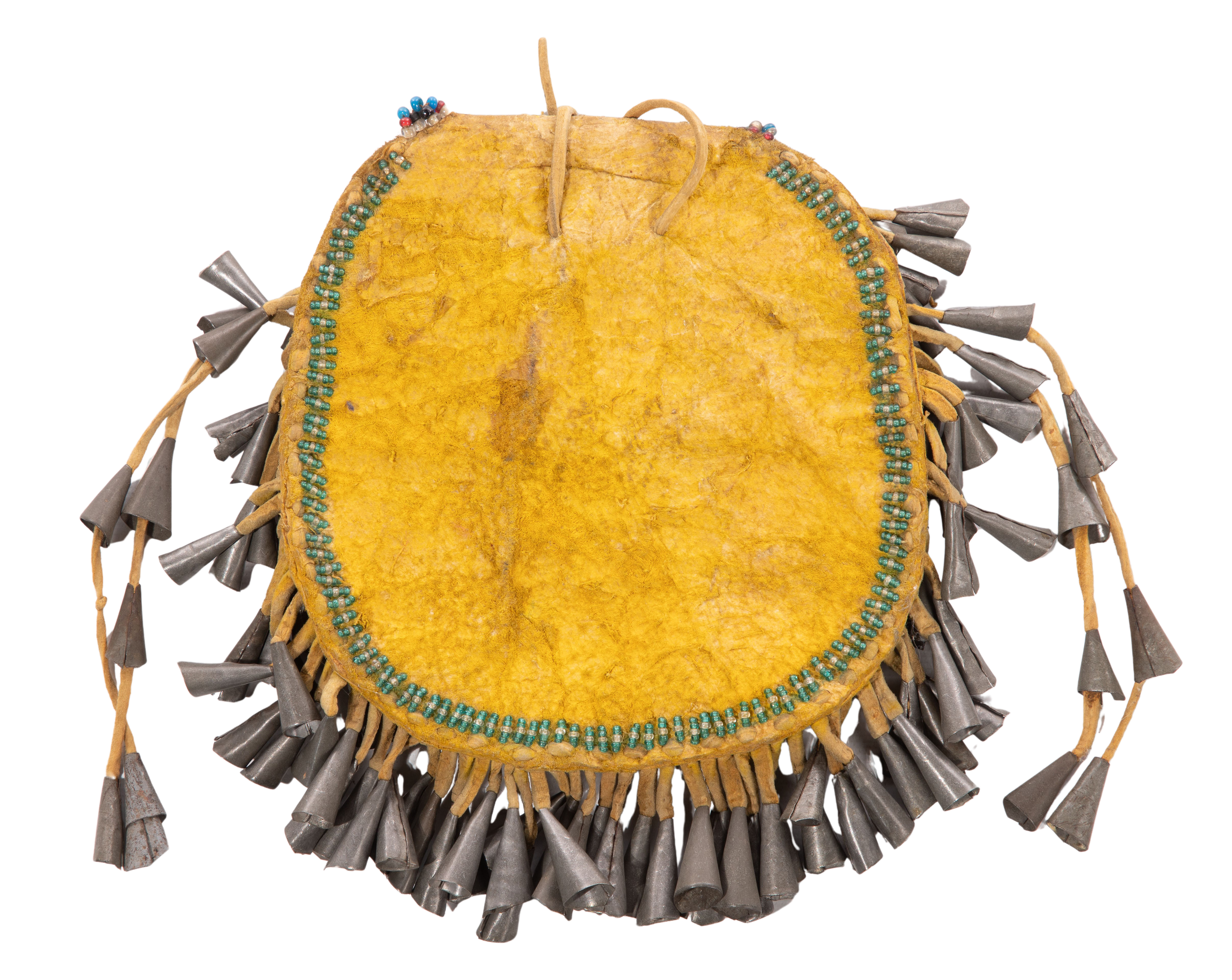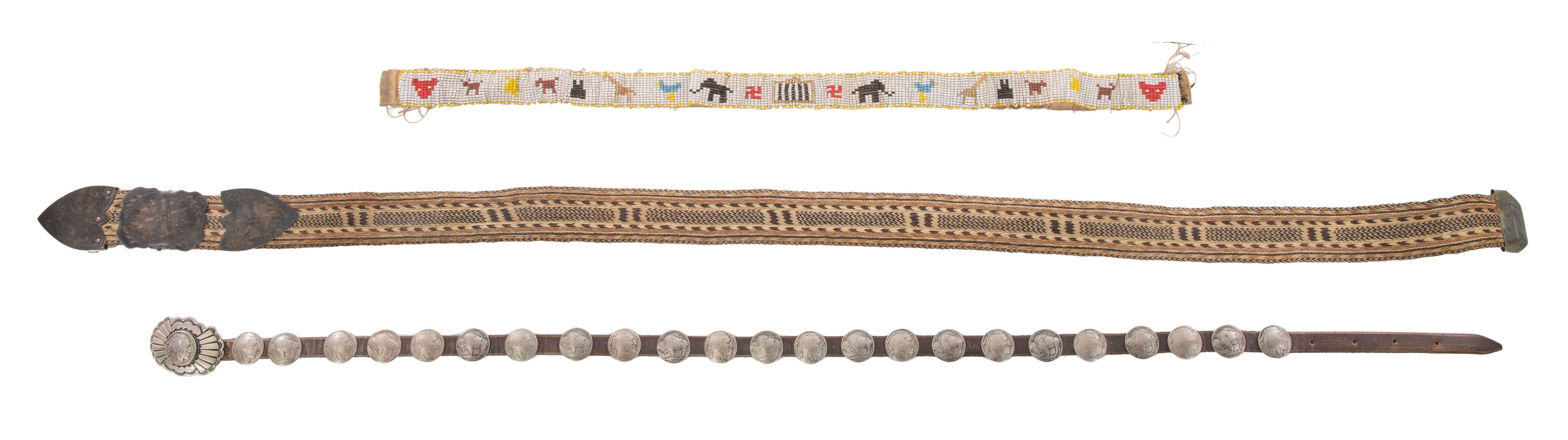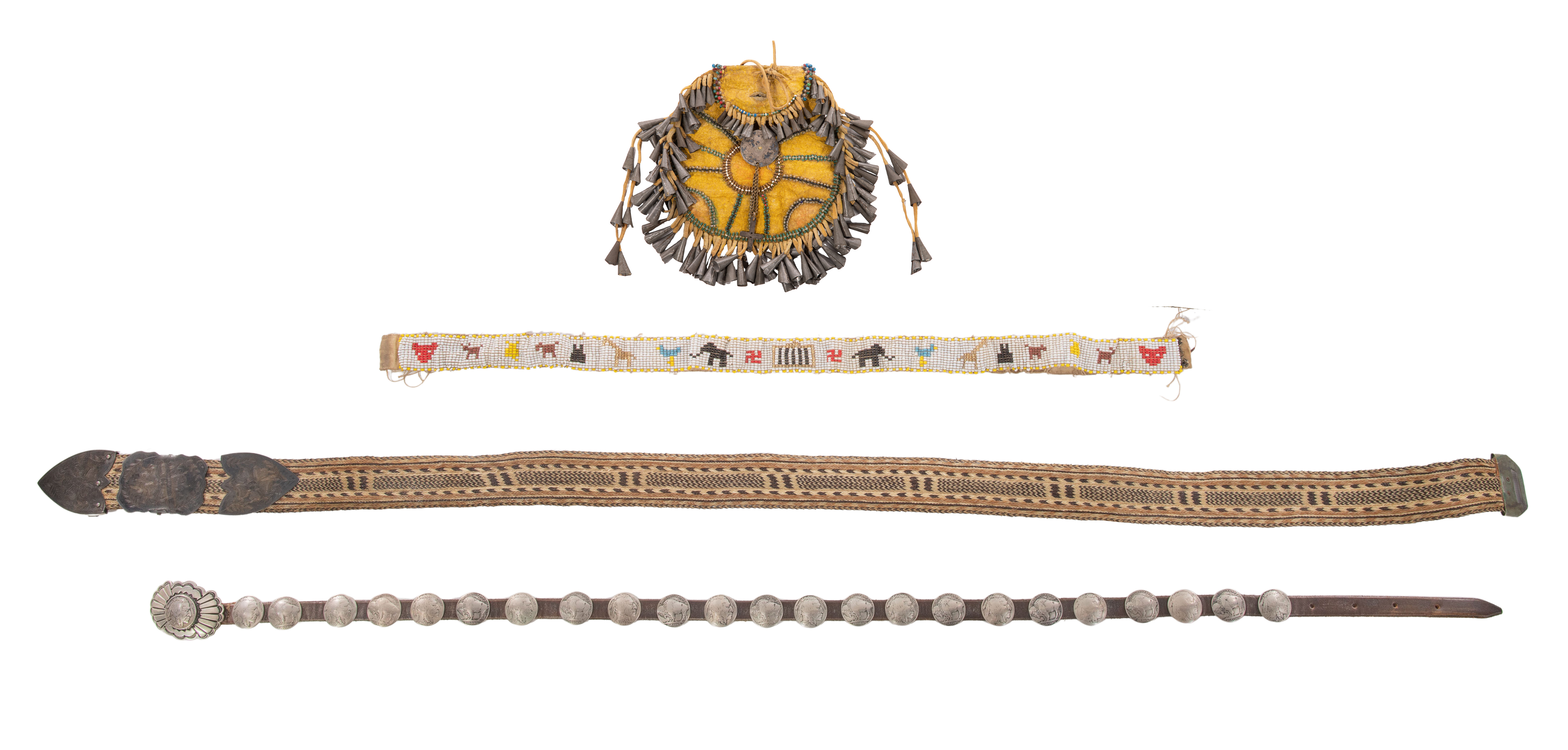 (4) items including an Apache round beaded pouch having tin cone fringe, made out of pigmented animal hides, partially beaded on the face and loop for carrying as well as (3) belts including a Buffalo Nickel coin belt signed ‘Lee Plateros’ (34-inches), a horse hair belt having silver accents (unmarked 0.900, 37-inches) and a beaded child’s belt sewn on ribbon (20-inches)