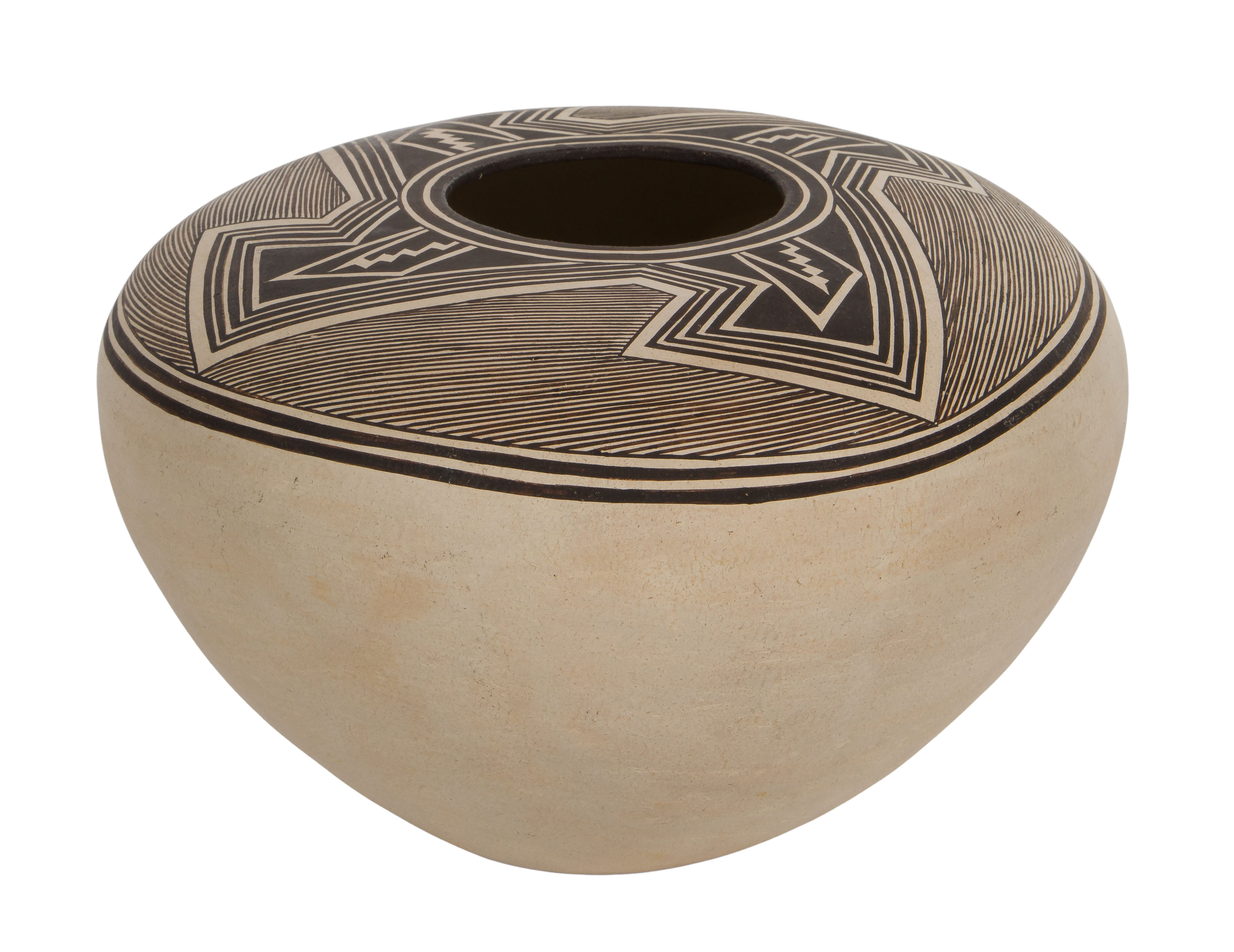 A pot in the ancient Mimbres black-on-white pottery design, having geometric shaped shoulder, signed on underside