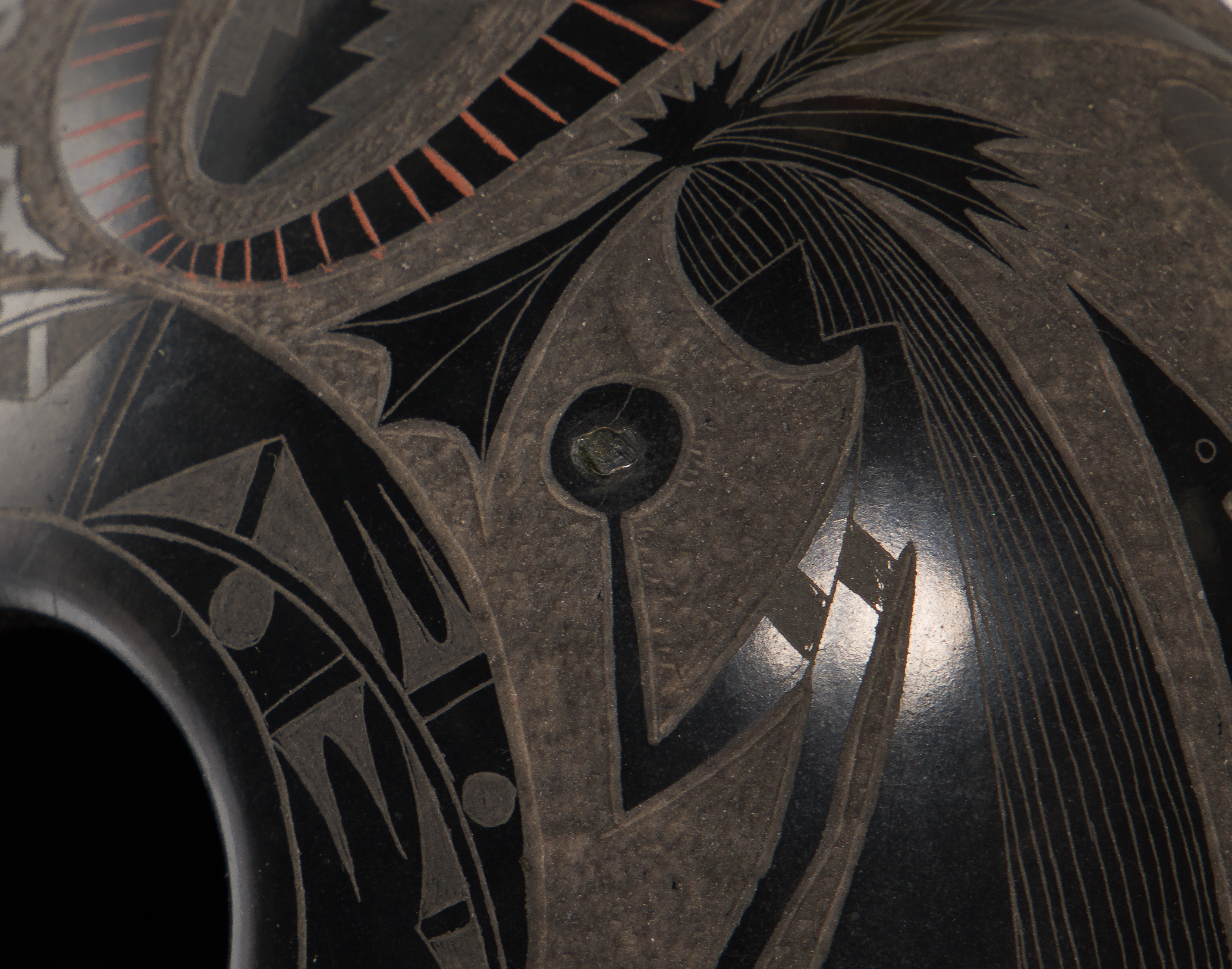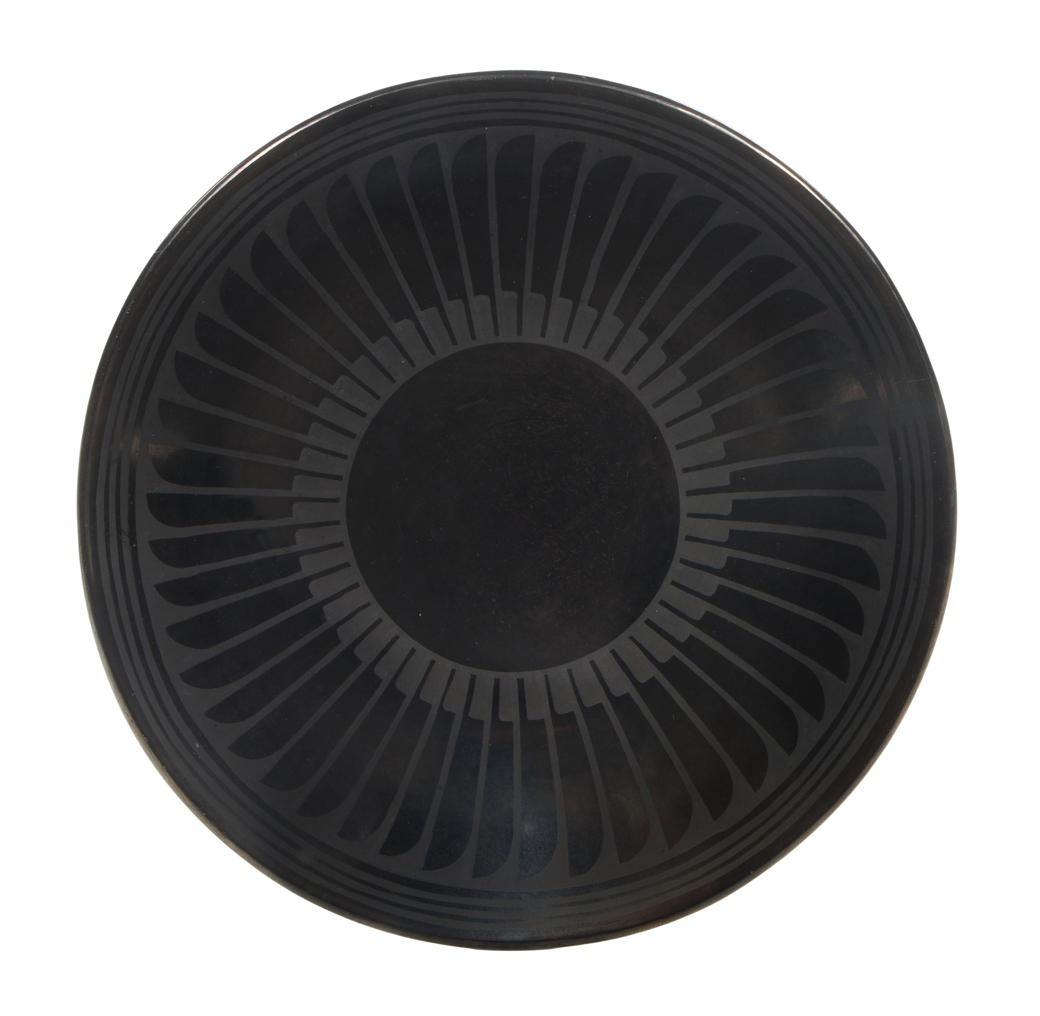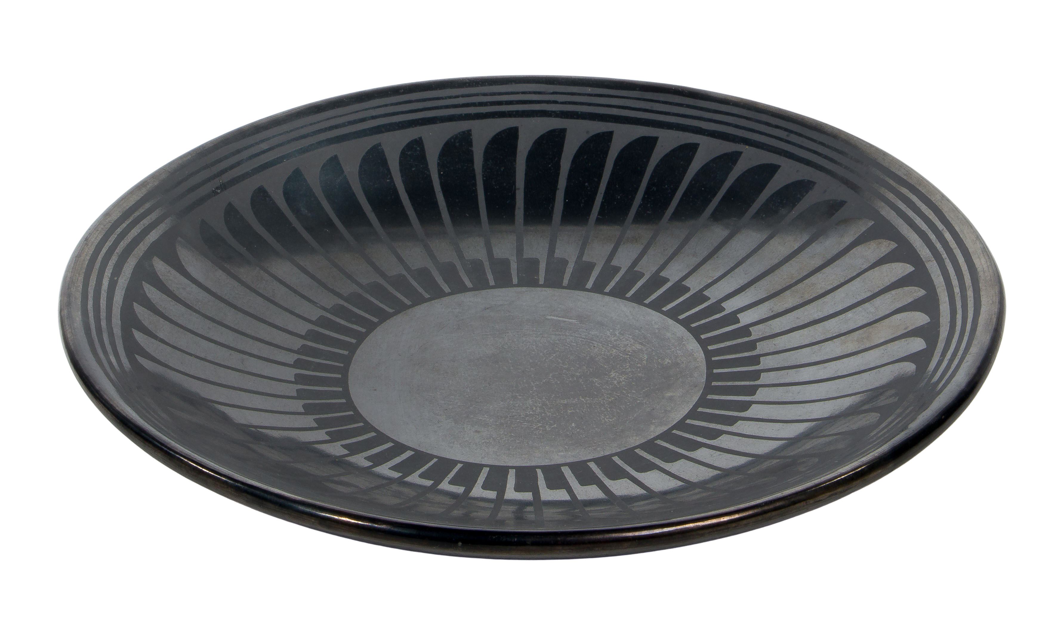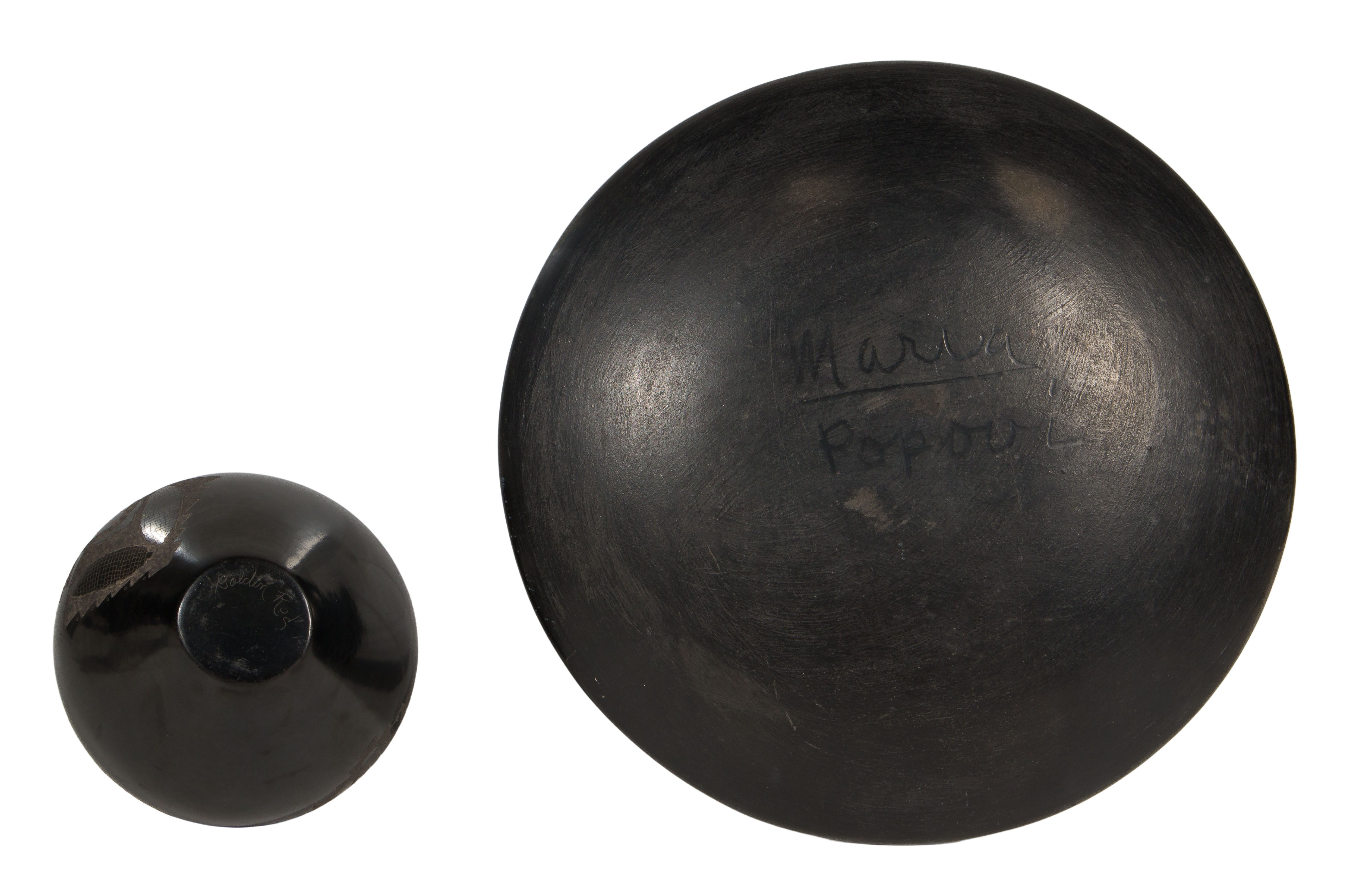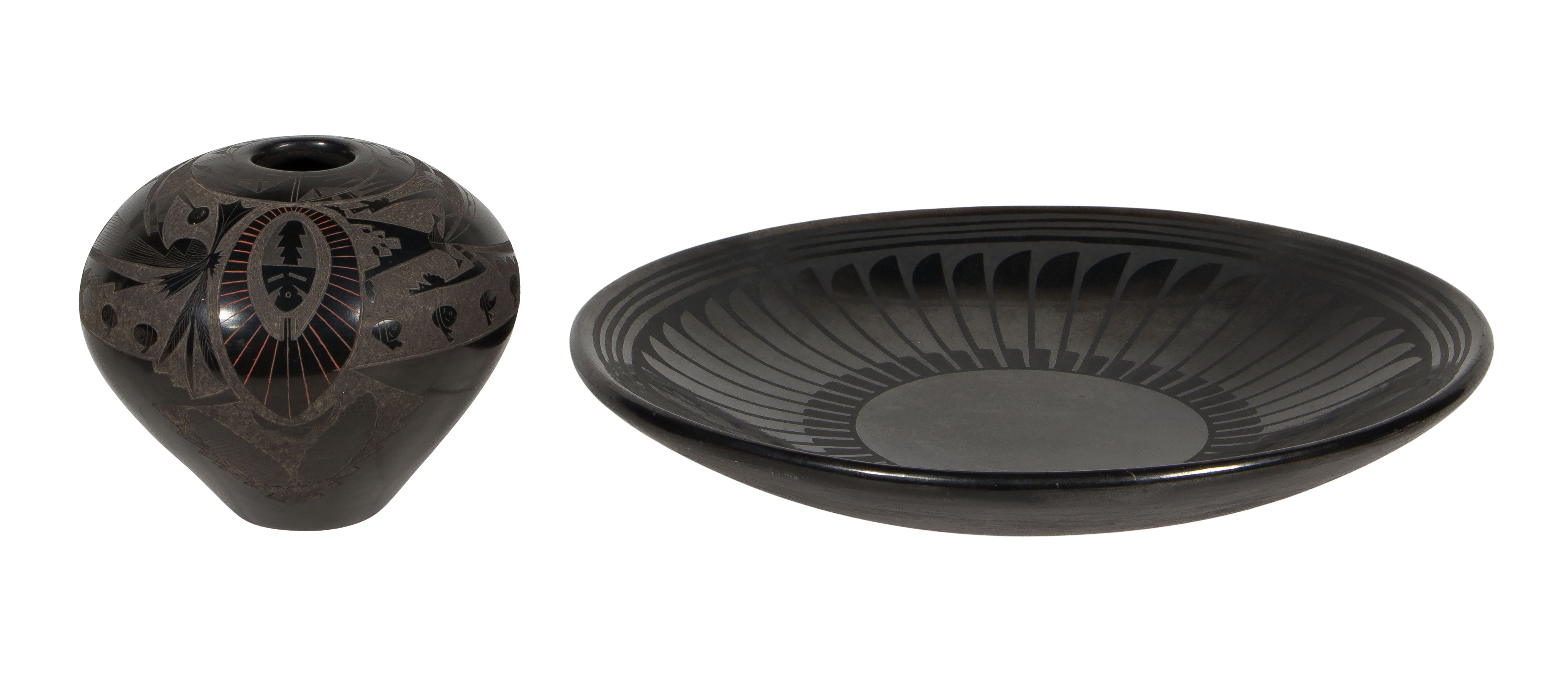 (2) total items including a matte-on-polished black having a repeating feather design, signed on underside by Maria Martinez (American Indian, 1887-1980) and Popovi Da (1923-1971); together with a Santa Clara Pueblo black sgraffrito pot signed ‘Golden Rod’ (Gloria Garcia, b.1942) on underside
