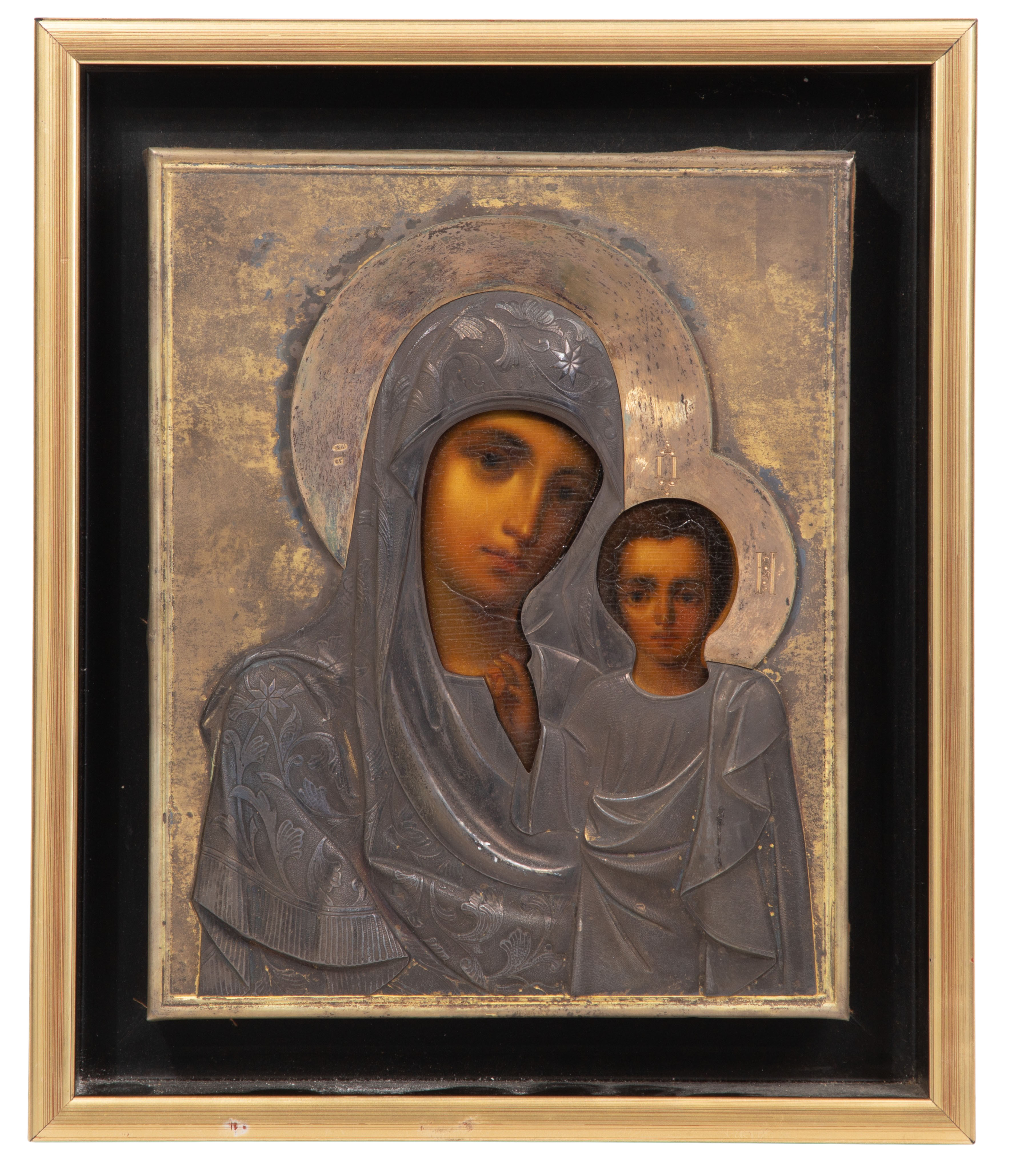 Kazan Mother of God painting having silver riza (marked ’84’ (Russian 0.875) silver) on halo, icon painted in a western style, float mounted in wood frame