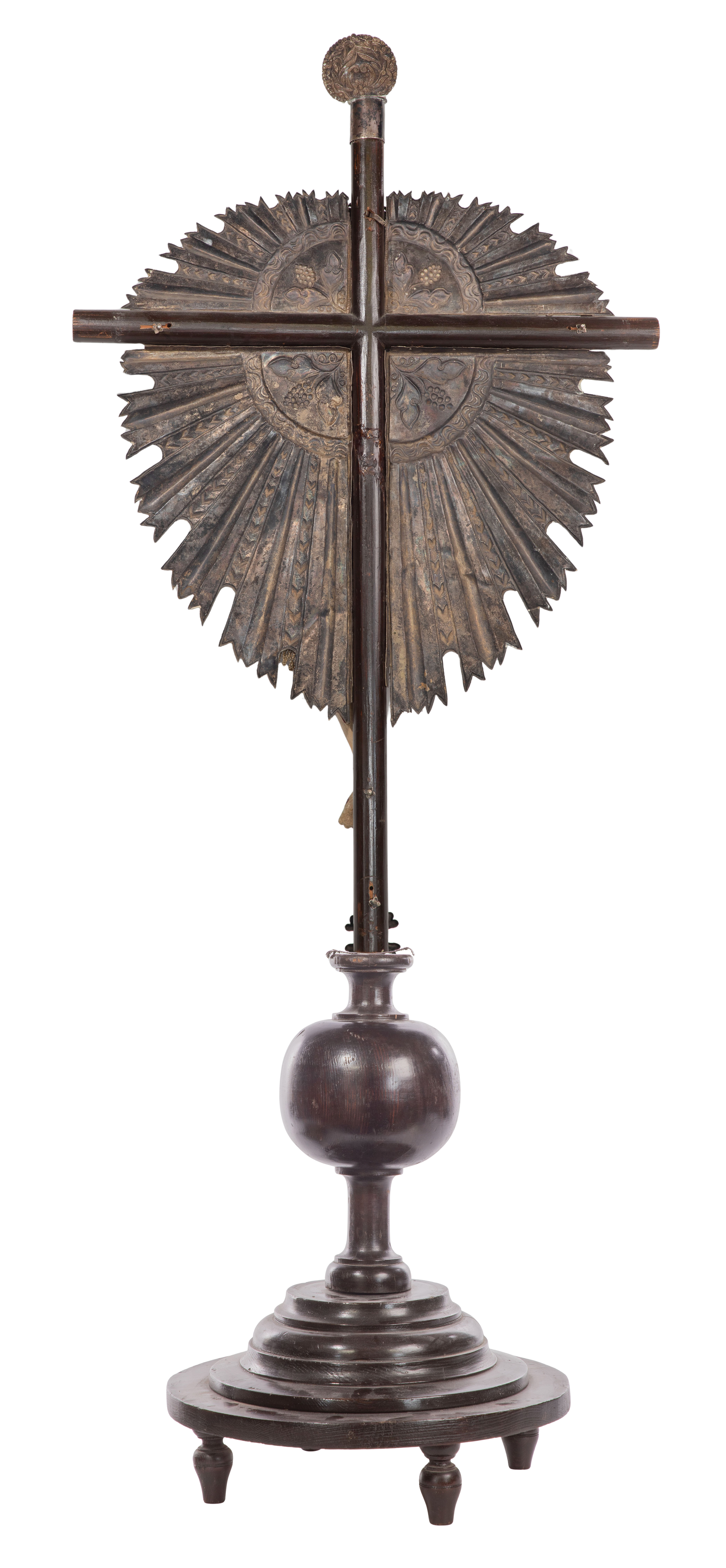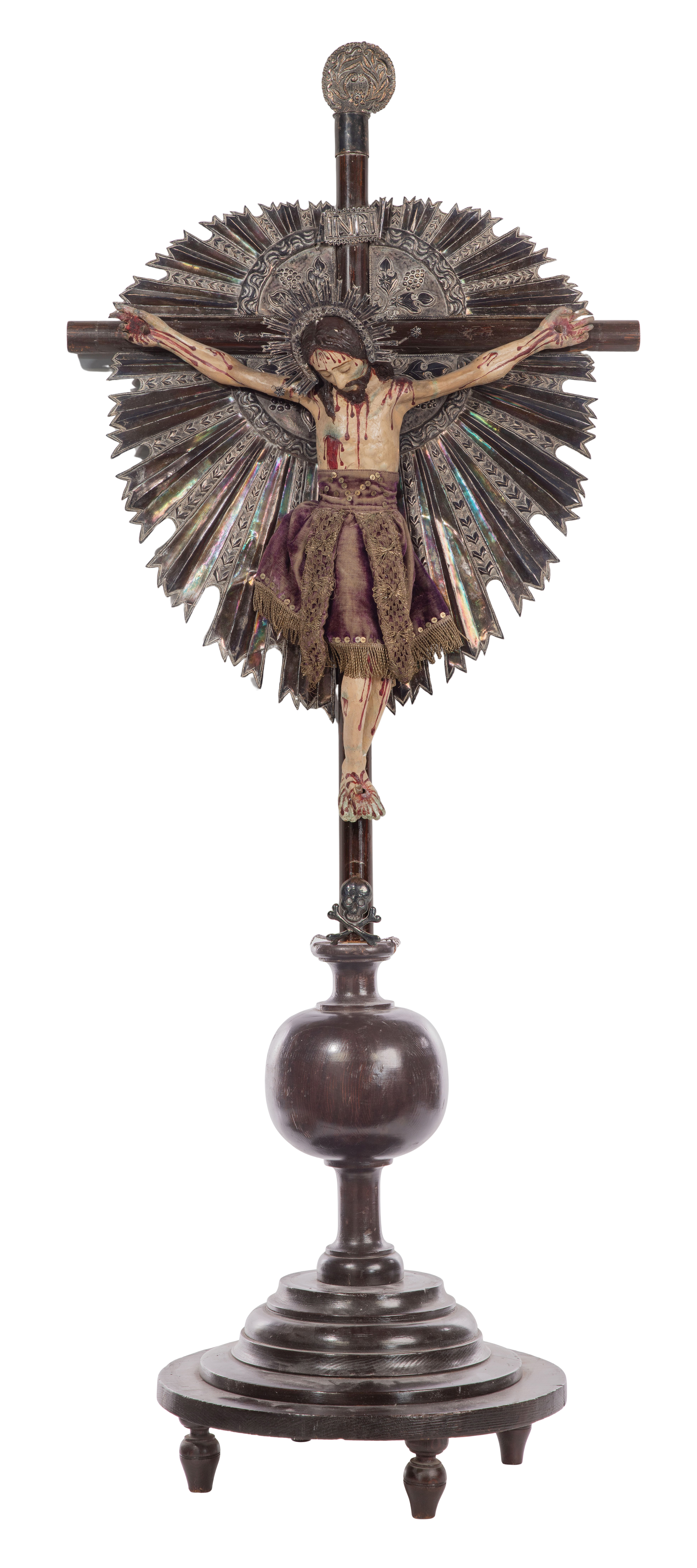 A crucifix of wood and gesso on papier mache Santo Christo in two pieces, having a sterling silver heart shaped background and crown of thorns as well as a velvet loin cloth, metallic thread and appliques set in large rounded base