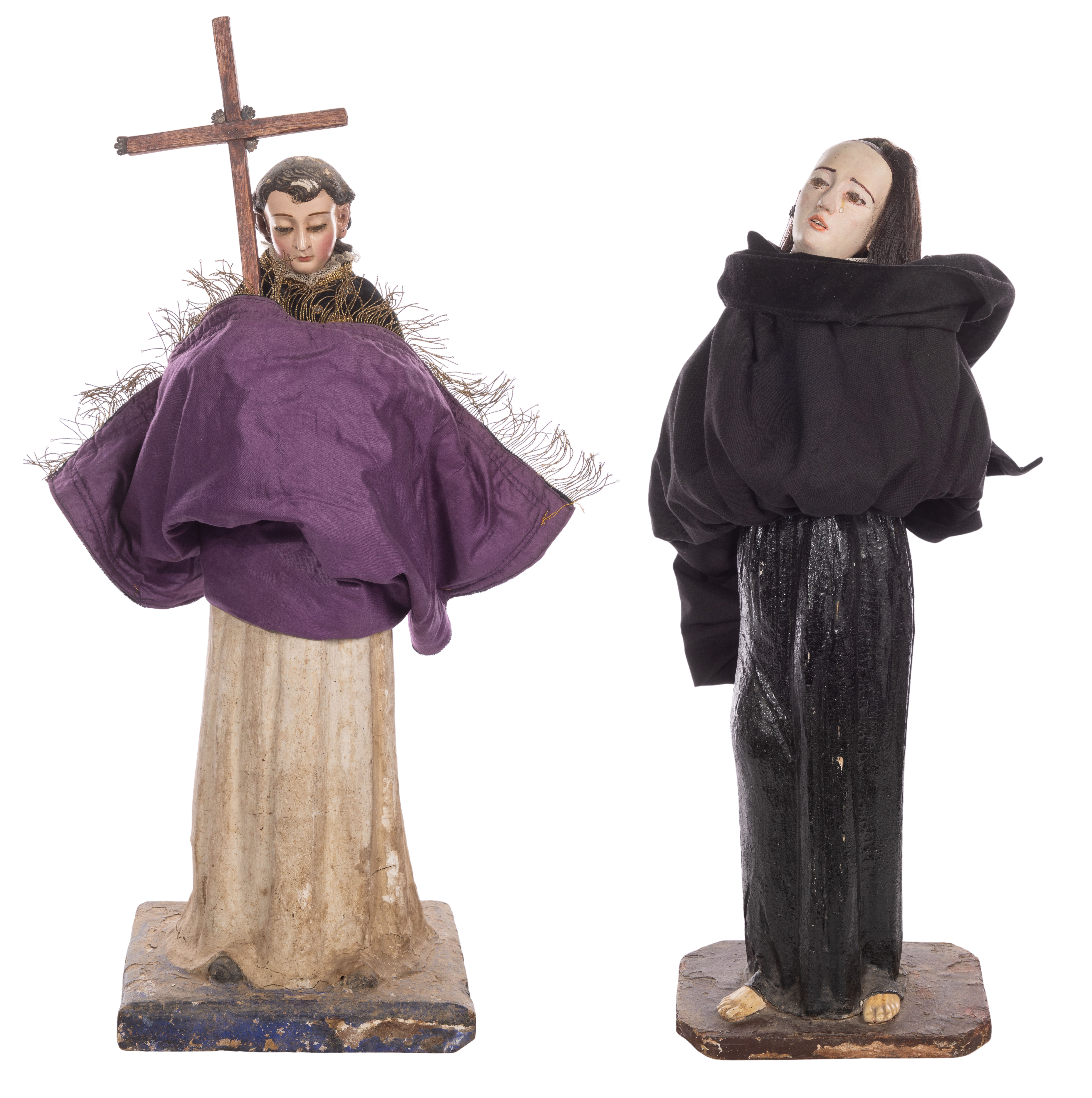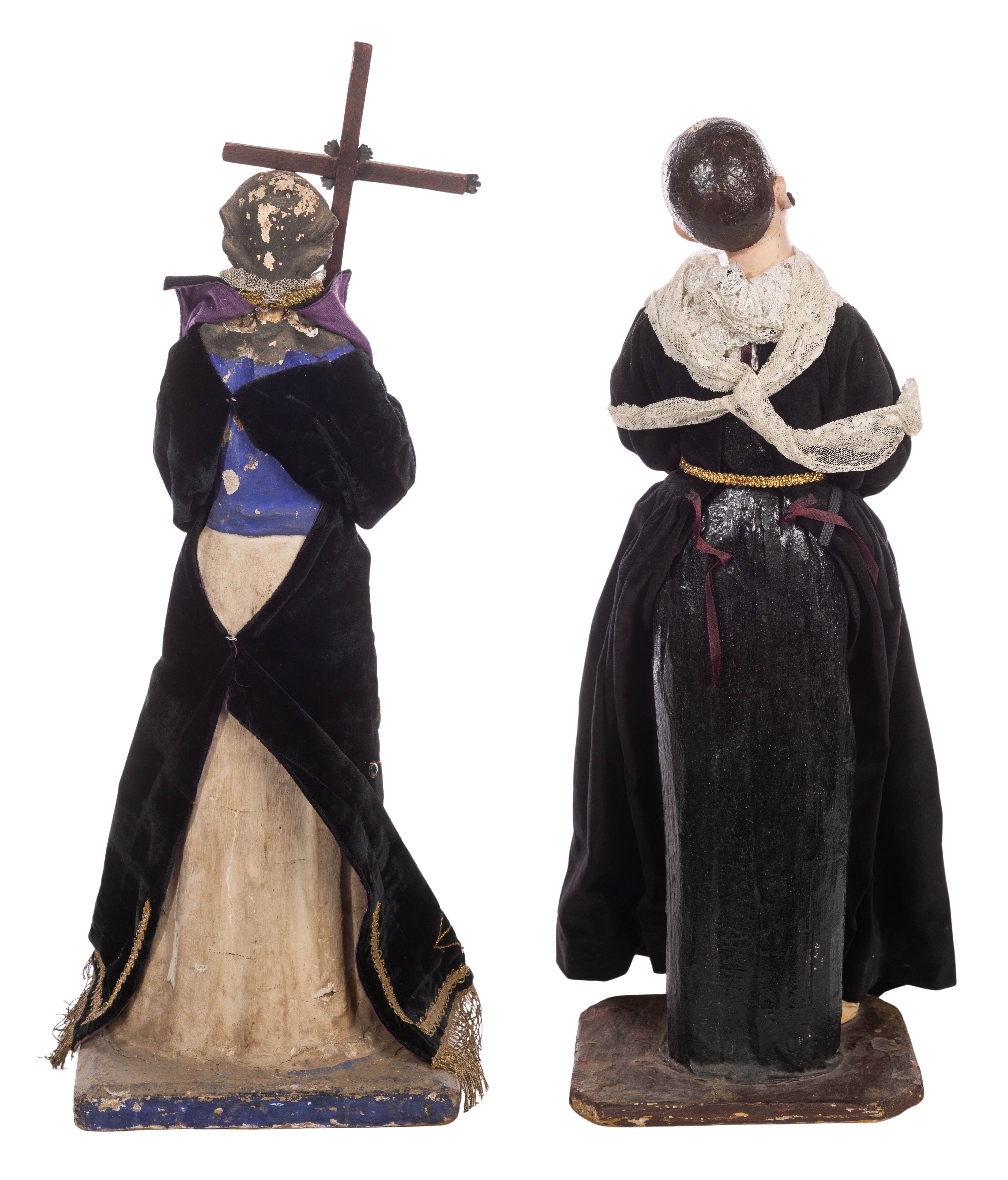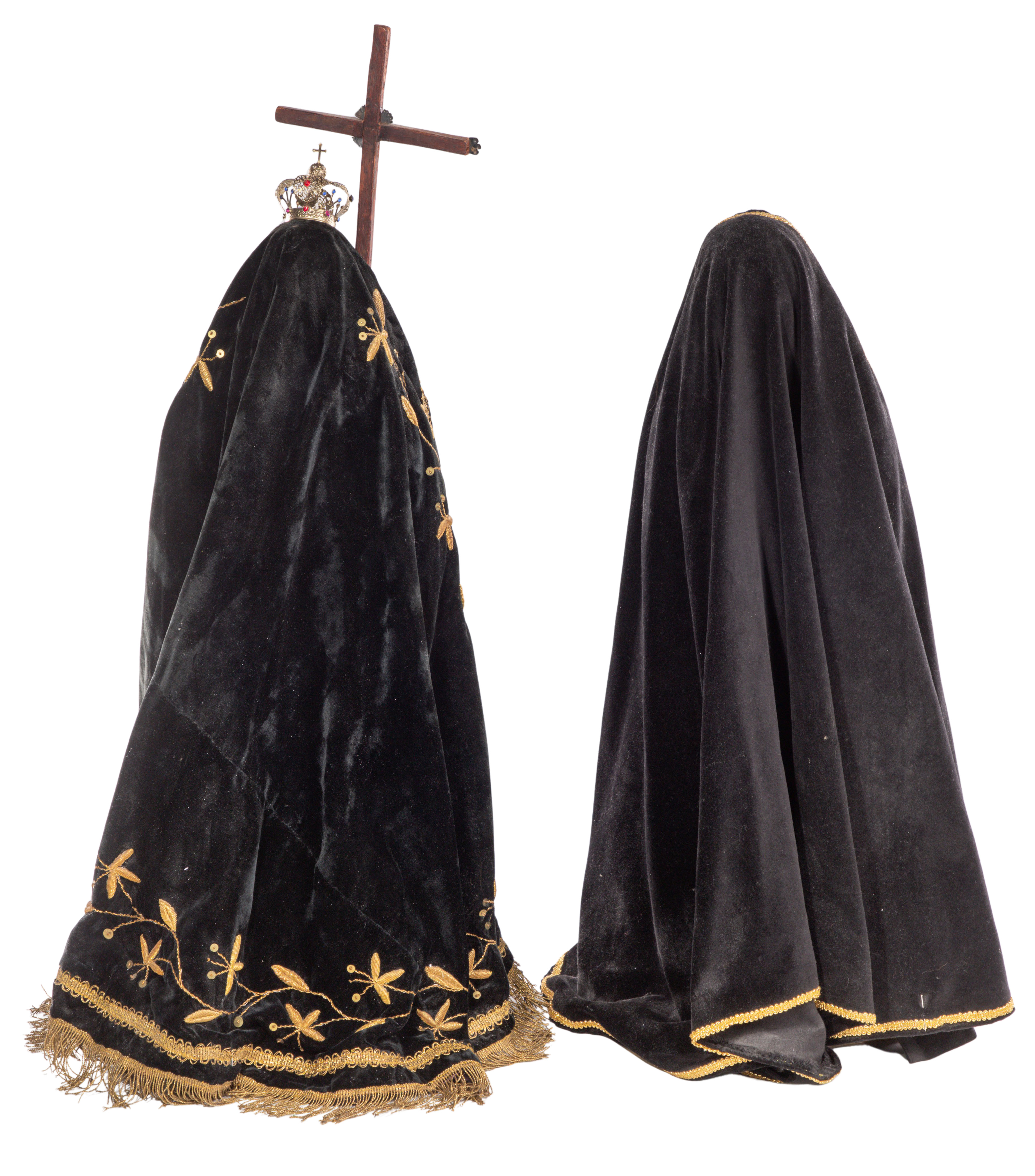 (2) items, both of painted gesso on papier mache, plaster and wood, robed in black velvet, both having (unmarked 925) Sacred Heart pins, one holding a cross and crowned having metallic thread fringe and raised embroidery embellished using sequins and glass beads, the other having lace collar and cuffs and gold-tone trim