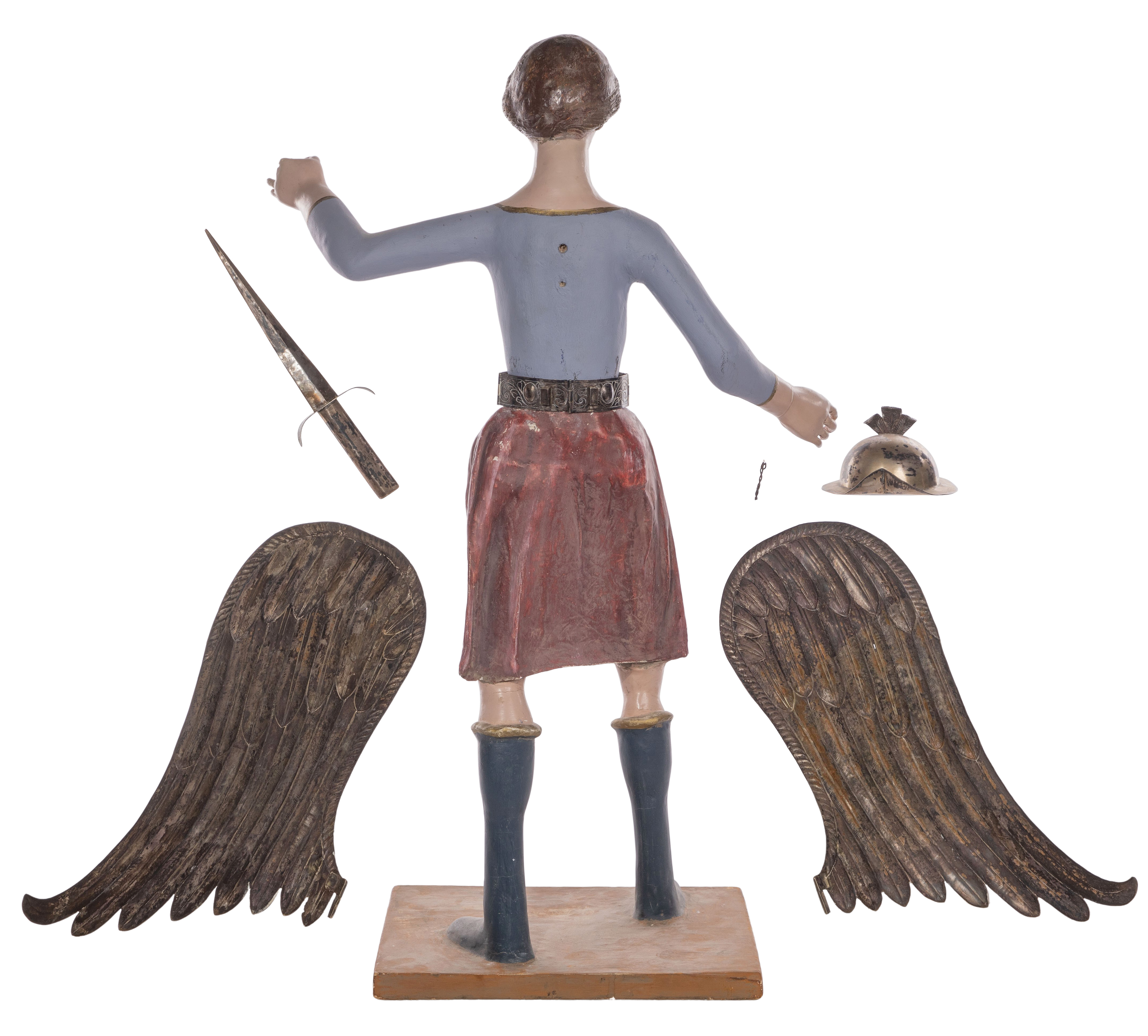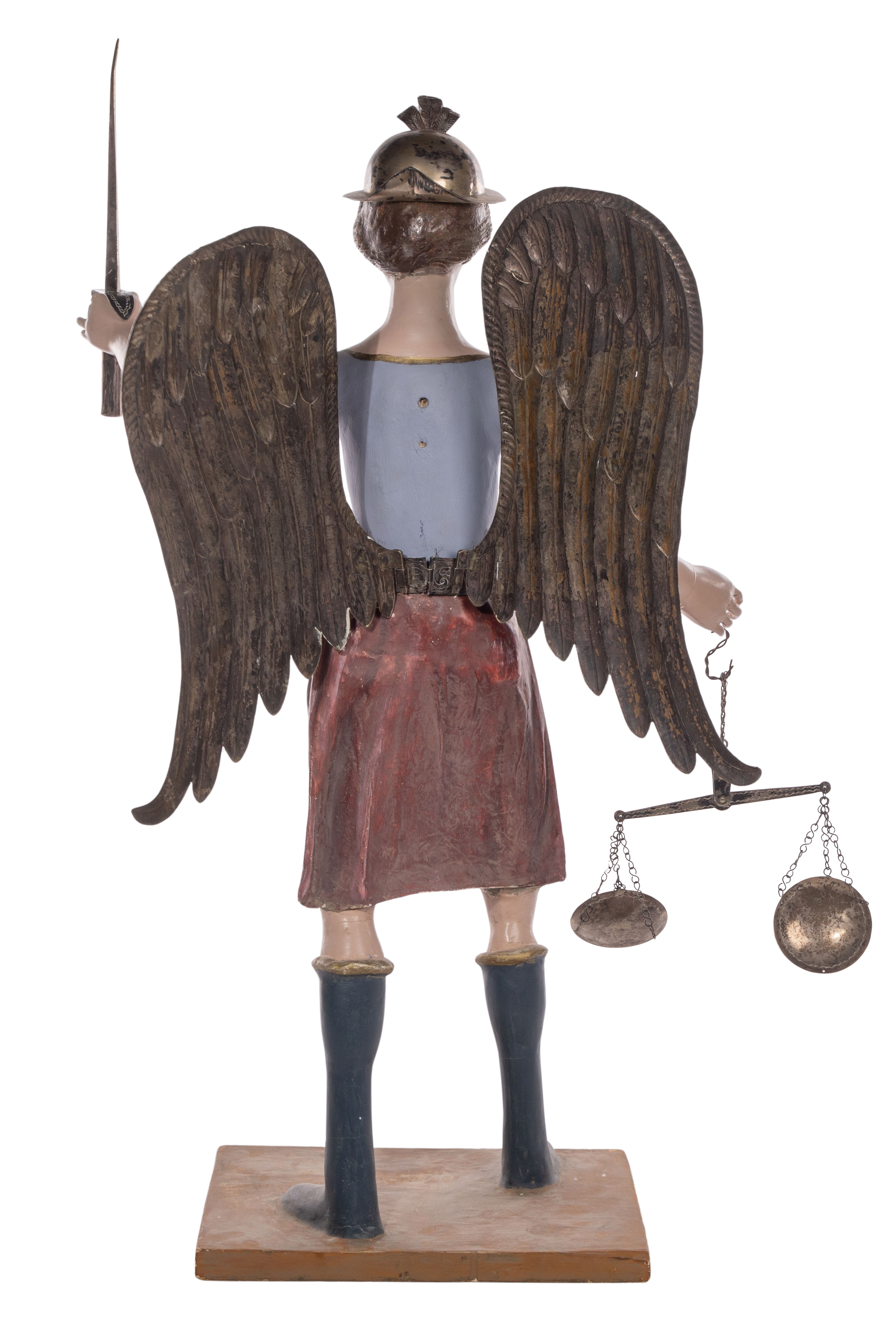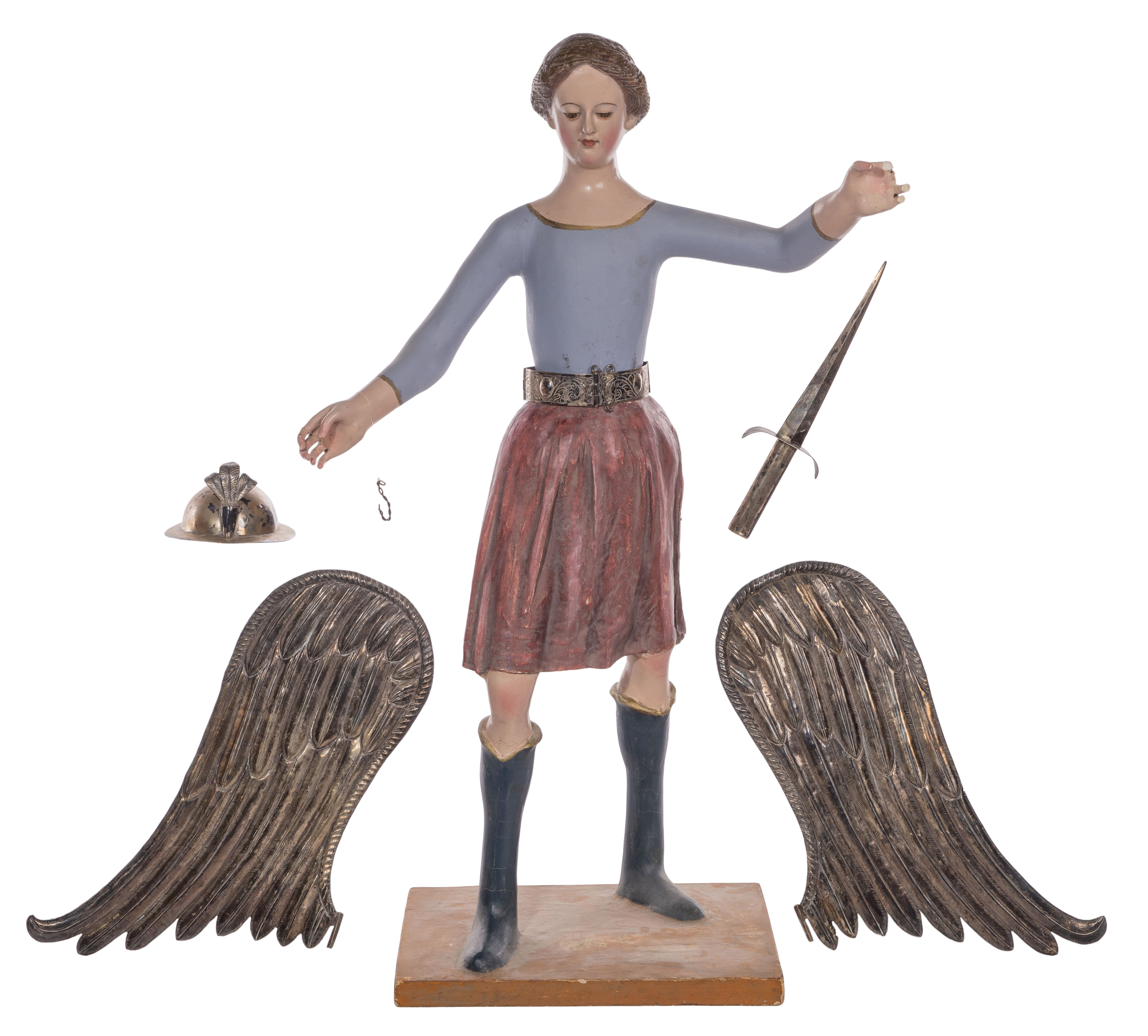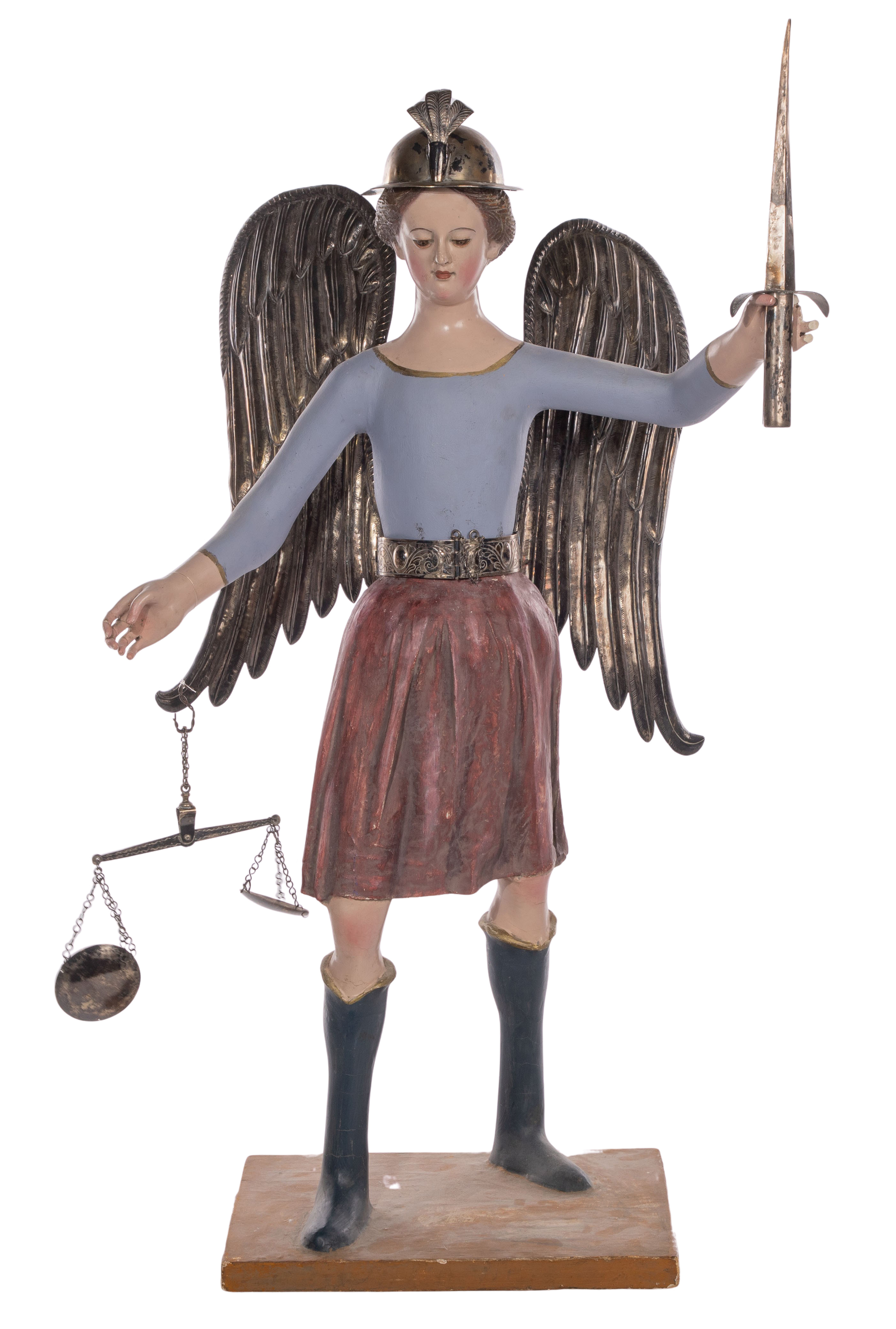 A painted gesso on papier mache, plaster and wood figure, having mixed purity (unmarked 925 to 900) silver wings, helmet, sword, scales and belt, wings inserted into belt, on wood base