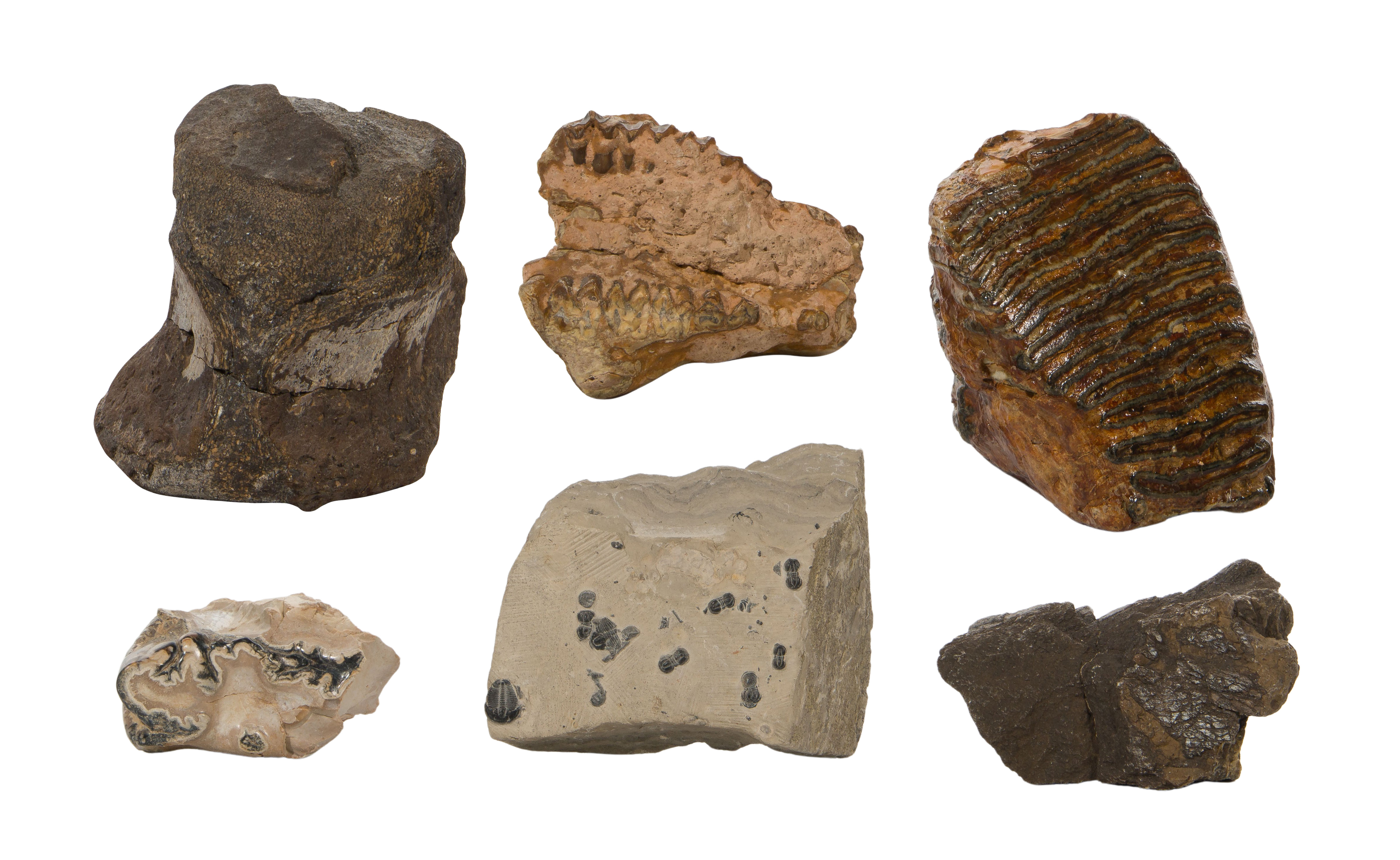 (6) items including a tooth, Oredont partial skull, vertebrae and mini trilobites in a matrix