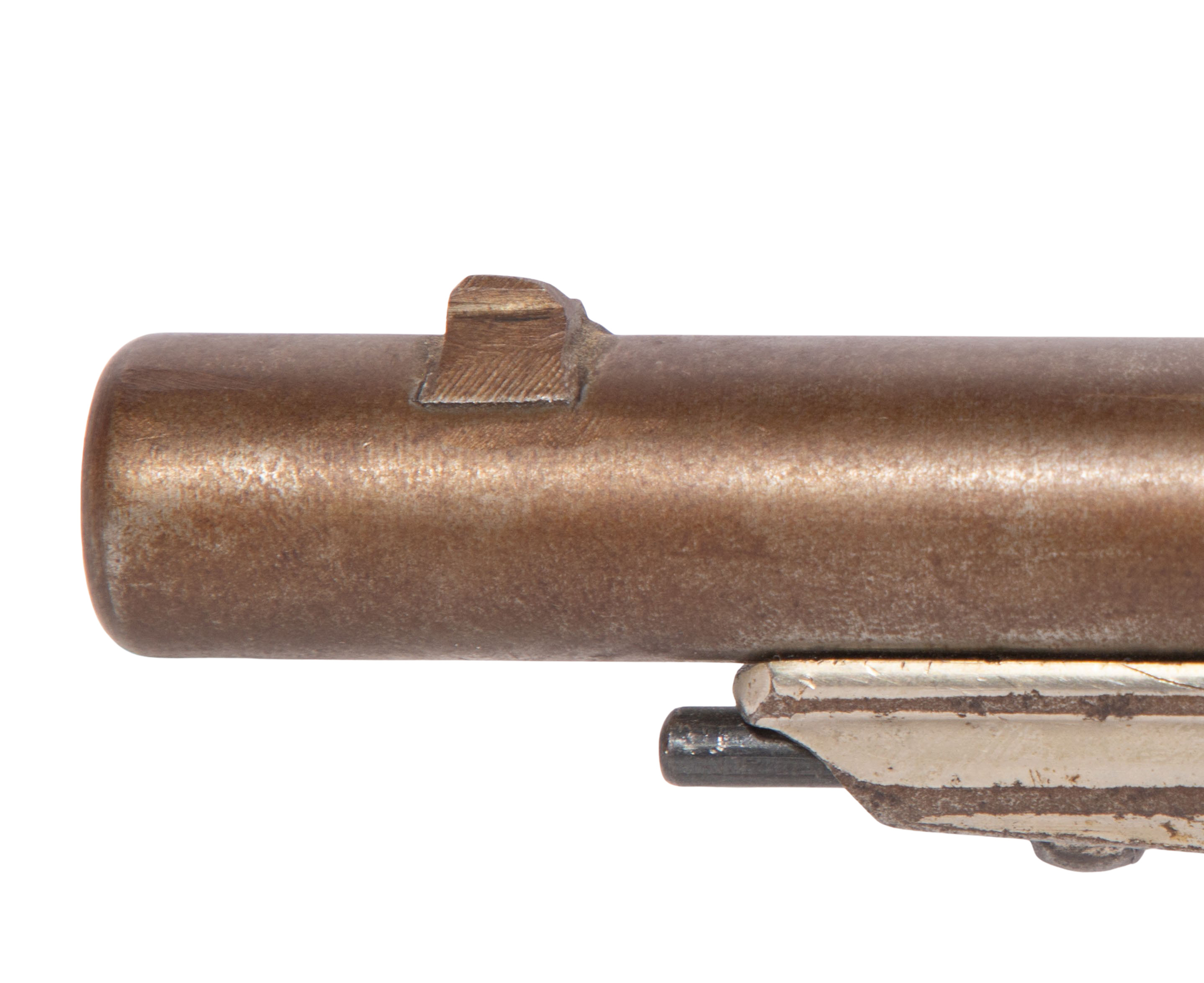 Condition: moderate wear, wood grip having broken piece (present), sight top broken off, missing ring on bottom, barrel having patina and finish issues overall
