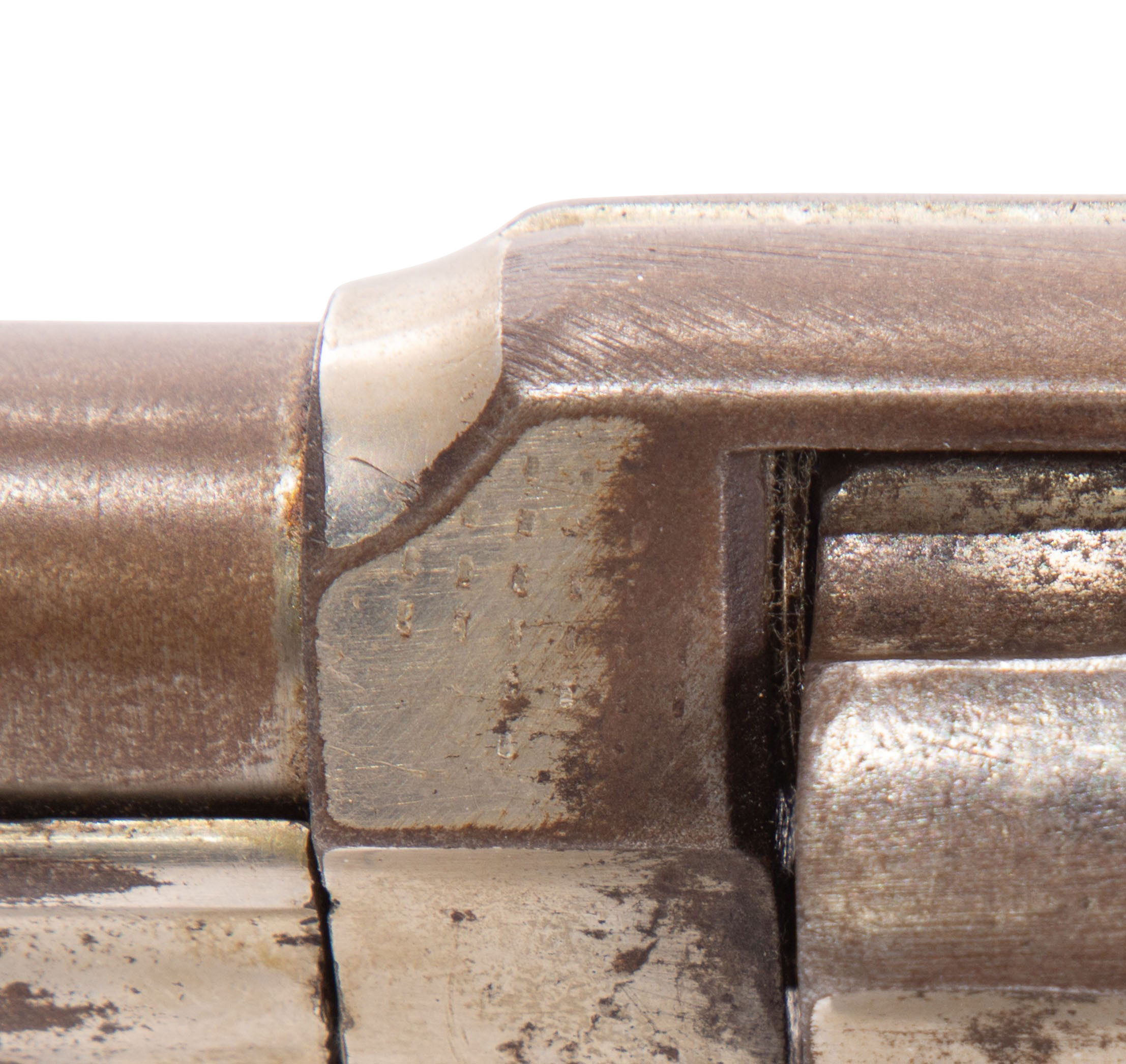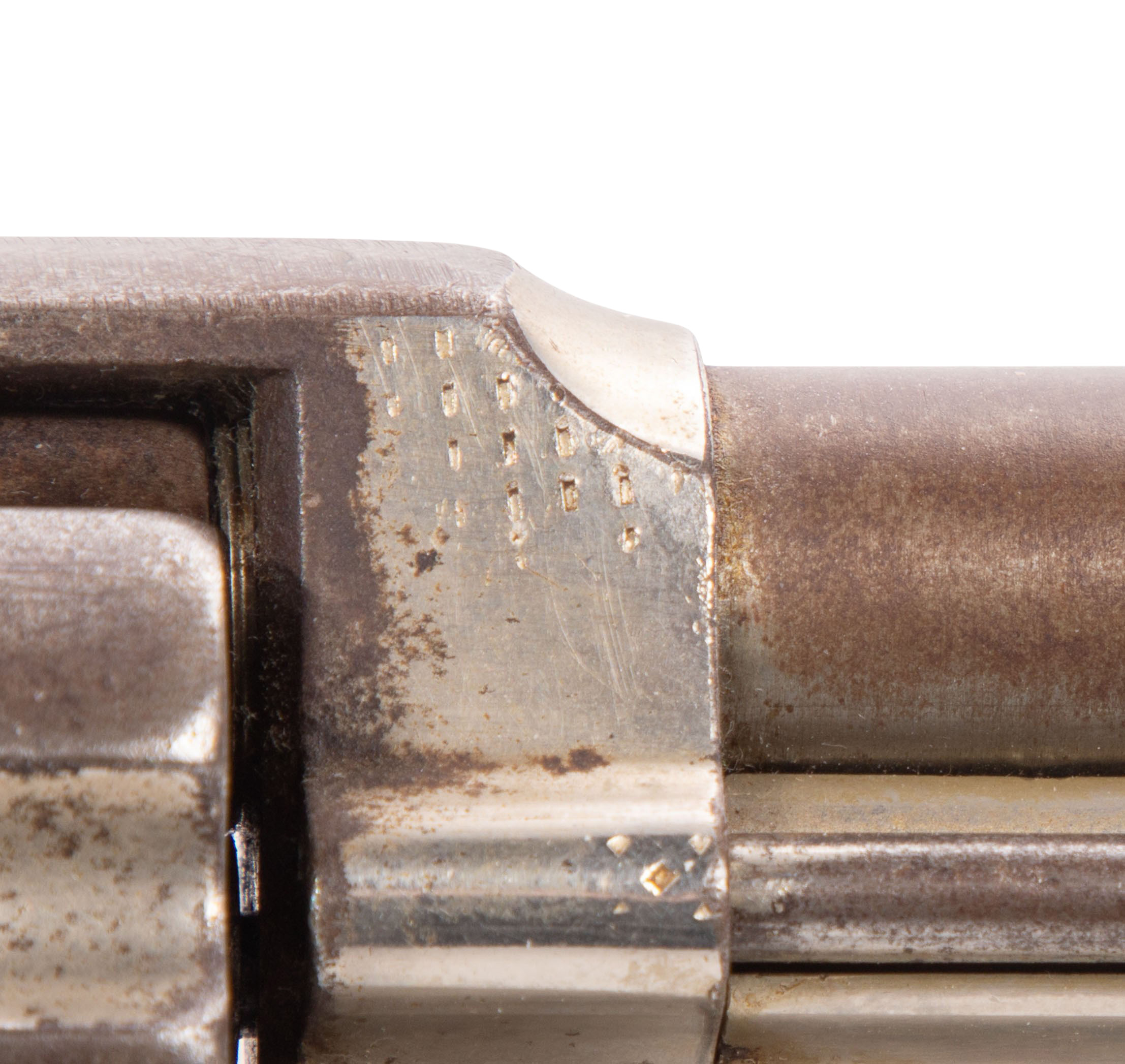 moderate wear, wood grip having broken piece (present), sight top broken off, missing ring on bottom, barrel having patina and finish issues overall