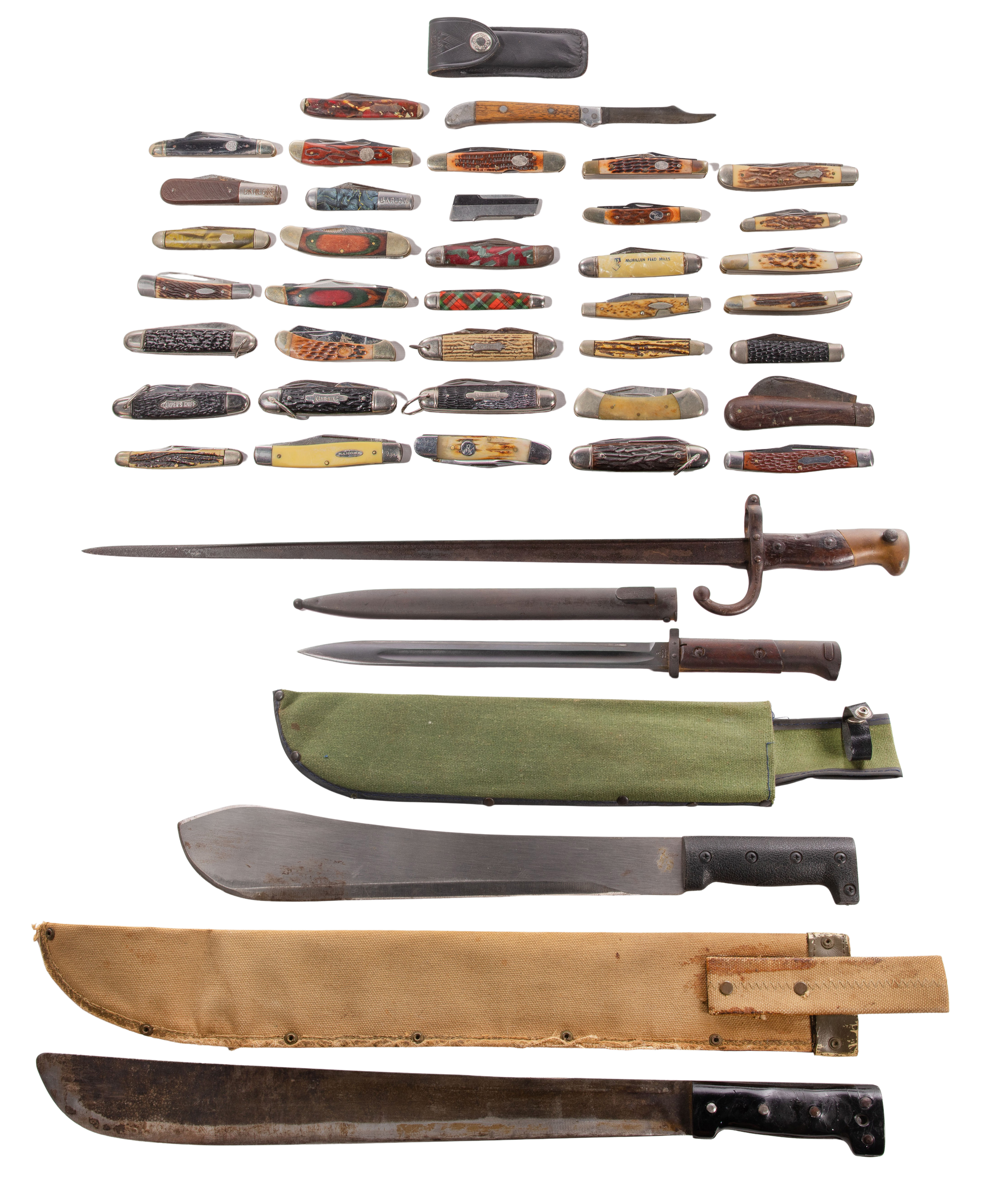 (43) total items including (36) pocket knives of various shapes, sizes and materials from makers including Kamp King, Barlow, S. W. as well as a 1945, AF / 0100 Sheffield machete and sheath, a German Gewehr bayonet, a Czechoslovakian bayonet and sheath and a handmade hunting knife and sheath; together with a wood handled serrated knife and knife cover