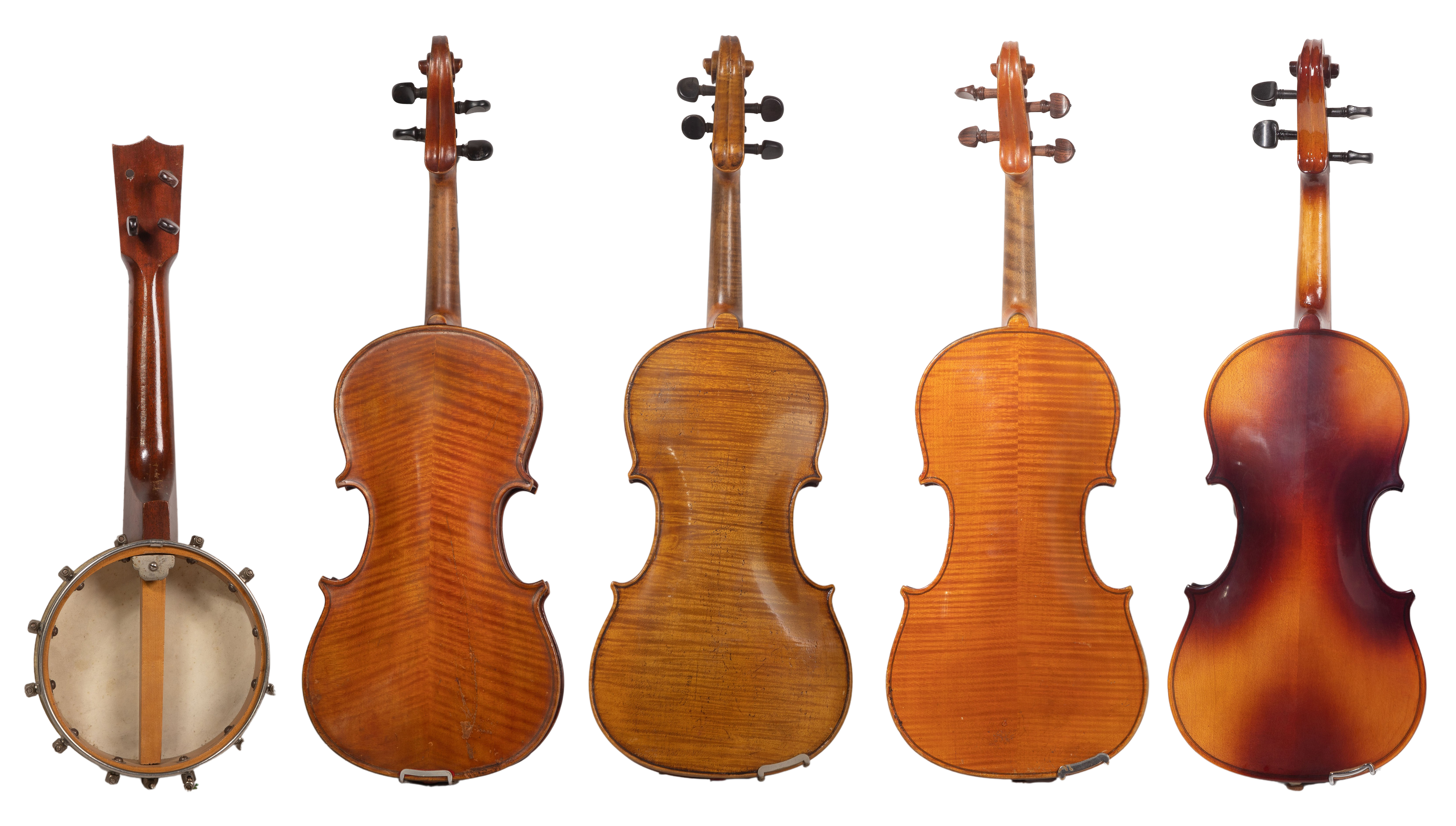 (5) total items including a labeled ‘Carlo Micelli 1922’ by German maker Karl Meisel, having figured maple back and sides, spruce top and ebony tuners, chin rest and tailpiece; together with a labeled ‘Anton Breton / 1994 Model AB 10 4/4’ and bow and (2) unlabeled violins, all in hard cases, as well as a banjolele / ukulele banjo labeled ‘First Hawaiian Conservatory of Music’ on head stock