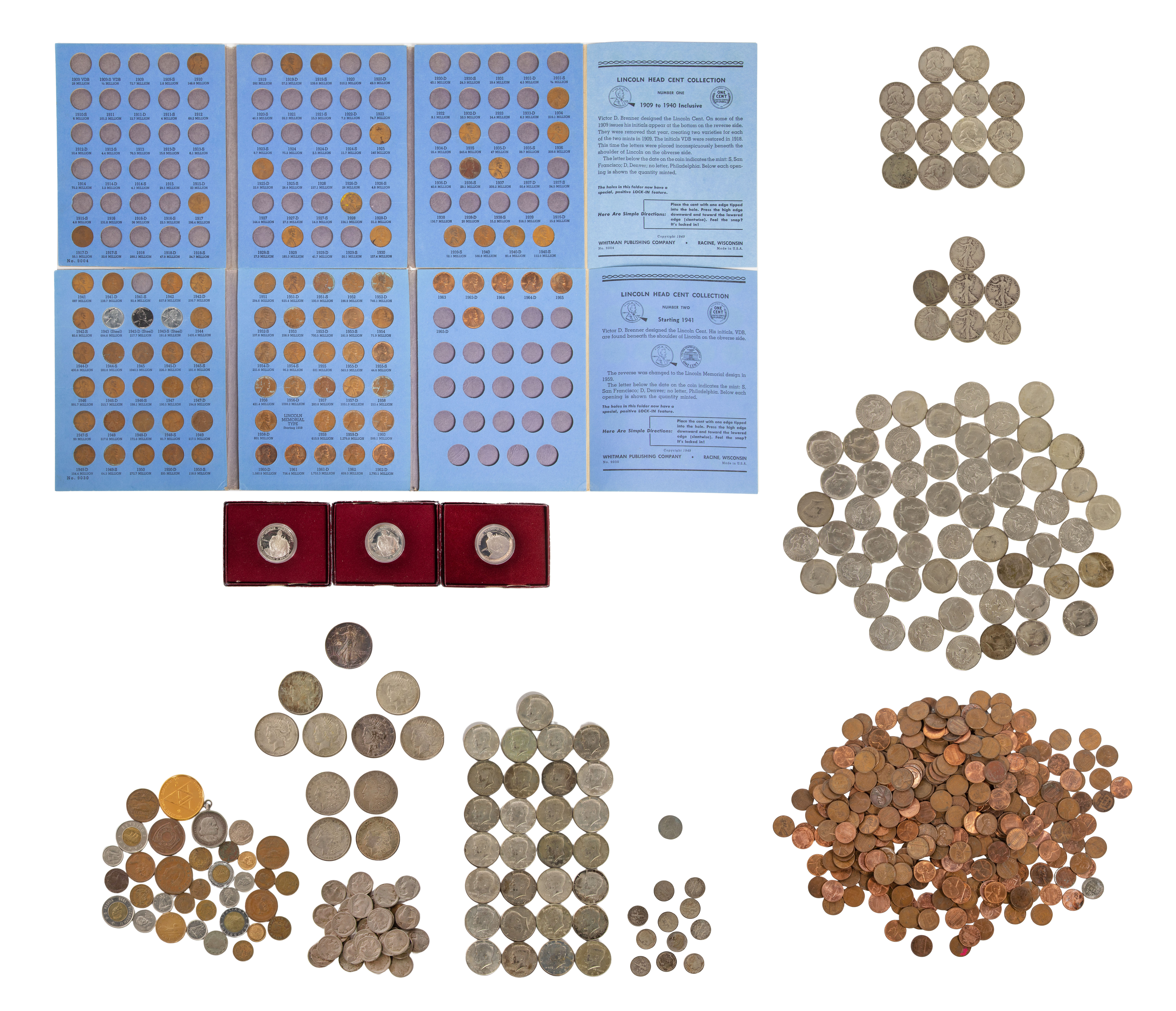 $48.10 US 90% silver including (4) Morgan $1, (6) Peace $1, (7) Walking 50c, (14) Franklin 50c, (55) 1964 Kennedy 50c and (11) Roosevelt 10c, US 40% silver including (29) Kennedy 50c and a US 35% silver war nickel; together with (35) Buffalo 5c, (2) partial 1c Whitman coin folders, approximately (200) wheat and memorial 1c, a 1986 Silver Eagle, (3) 250th anniversary of Washington 50c and assorted foreign coins