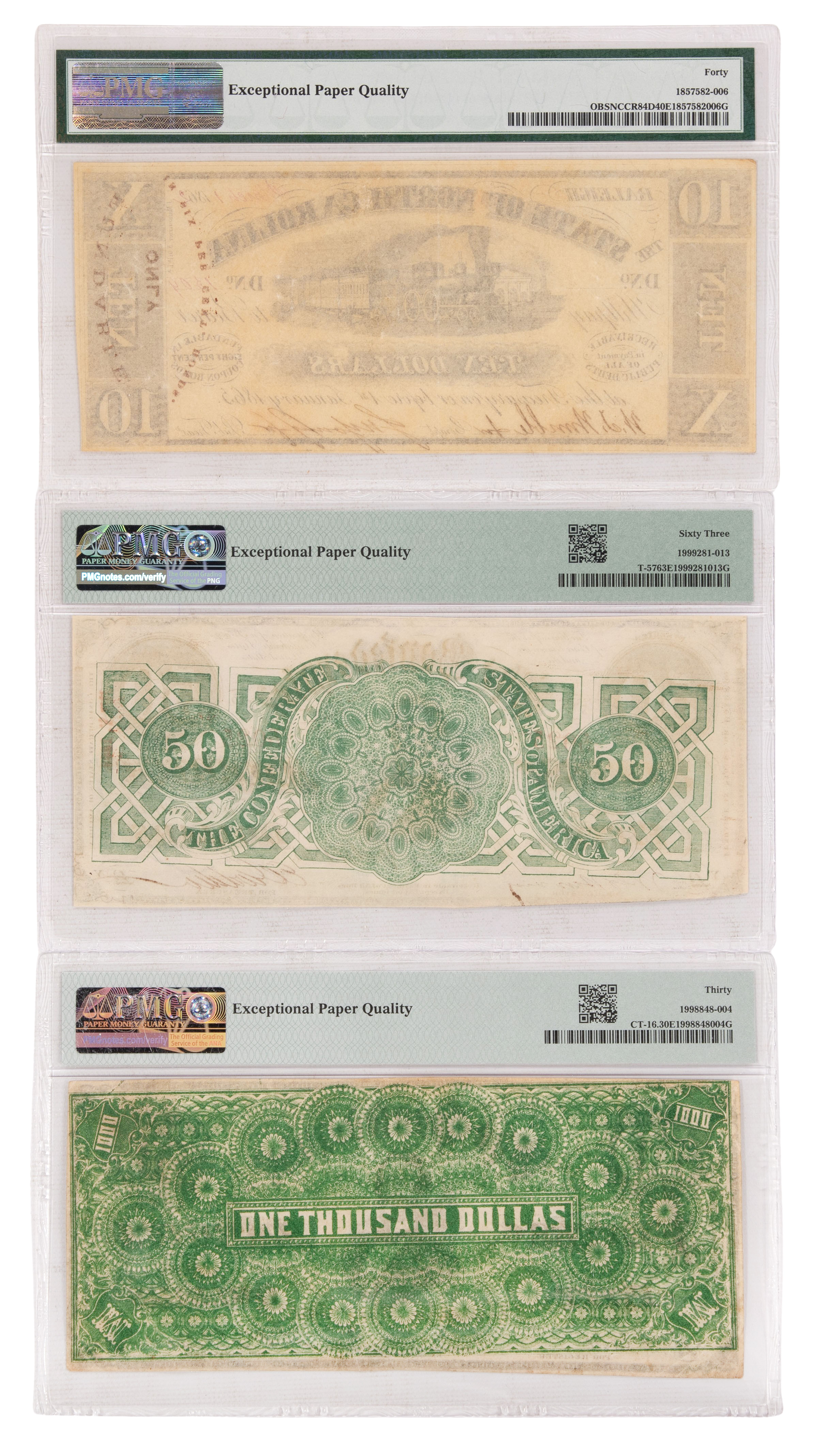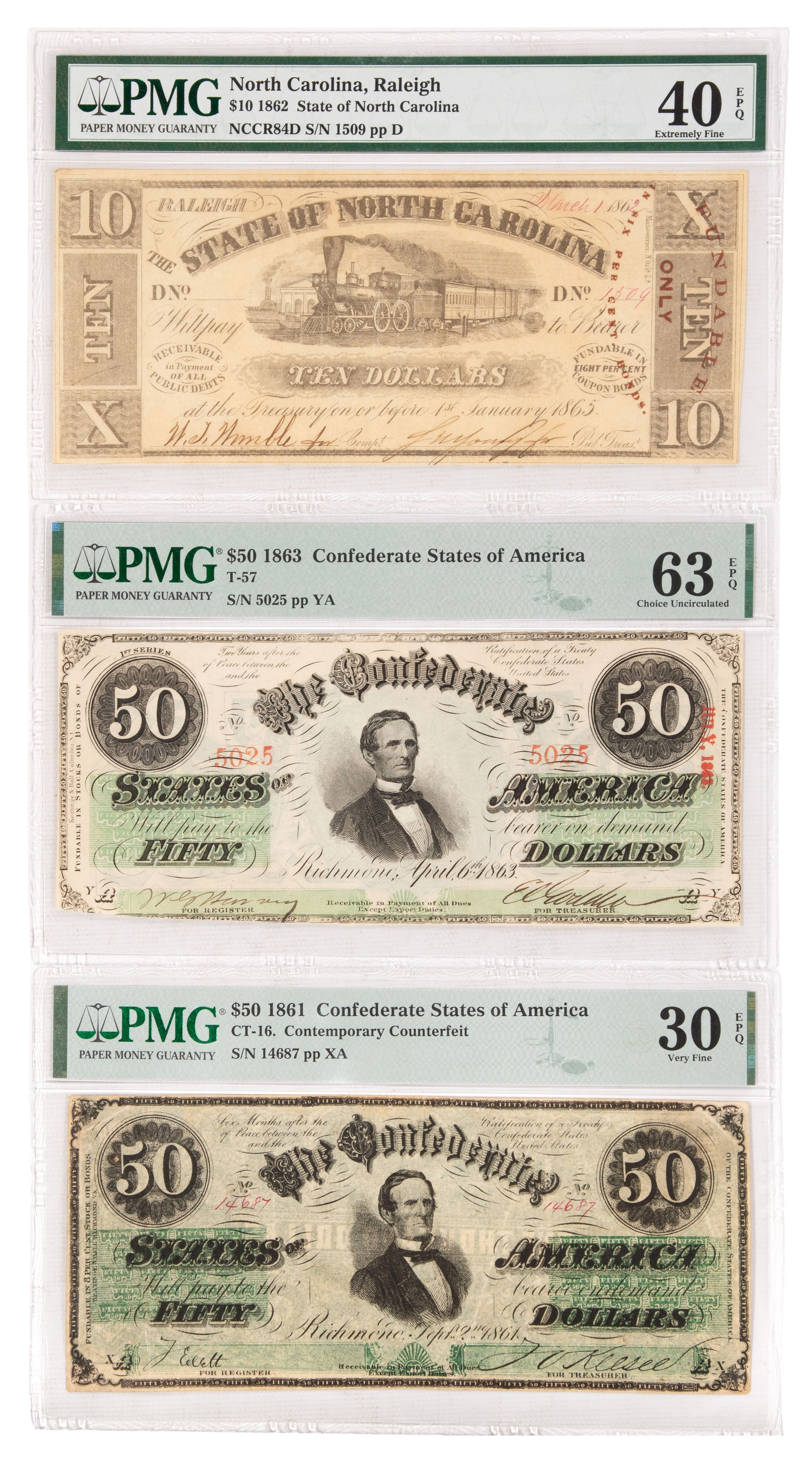 (3) banknotes including an 1863 $50, an 1861 $50 contemporary counterfeit and an 1865 $10, all in PMG holders