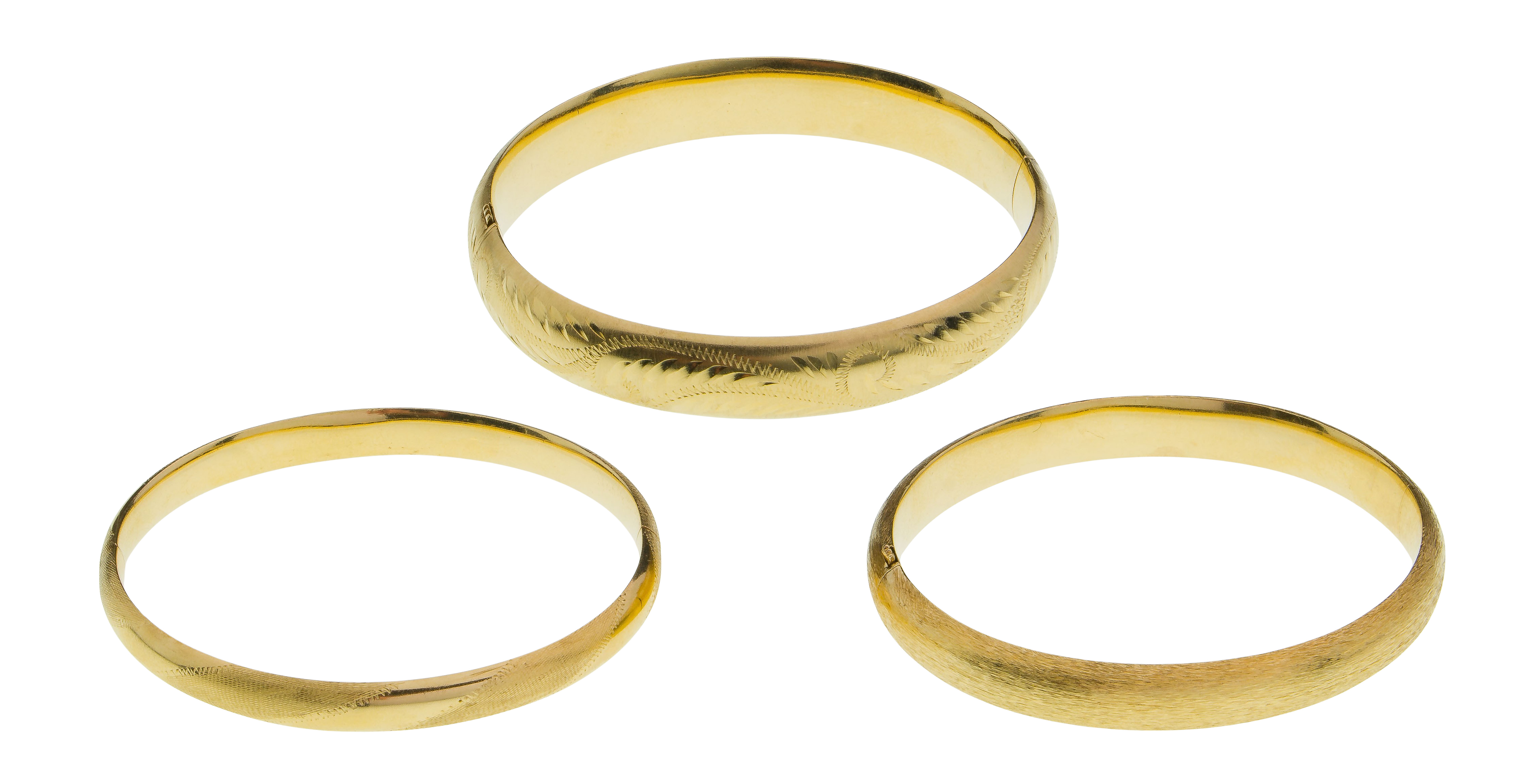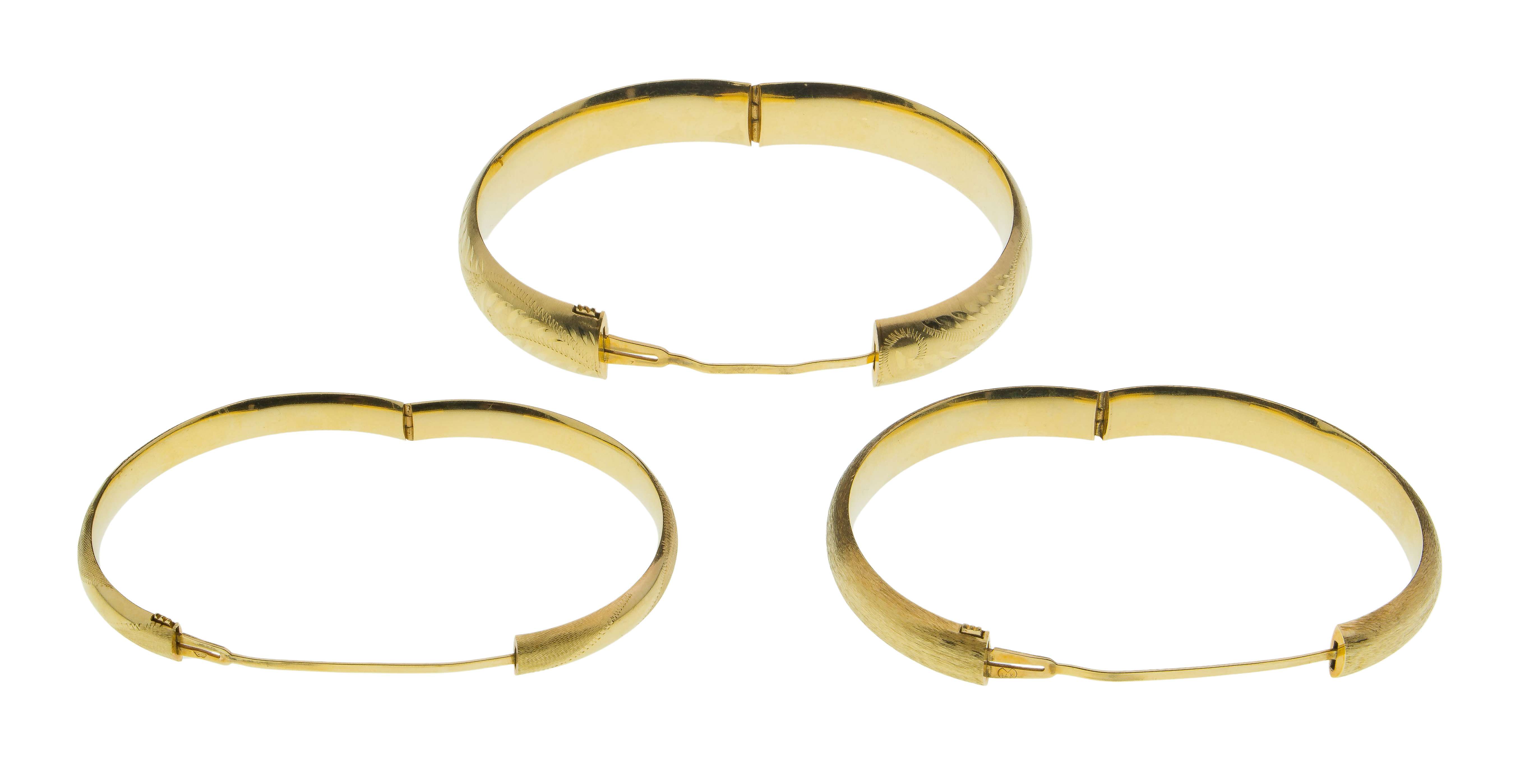 (3) items having brushed or engraved finish (two marked ’14k’ on inside clasps, one poorly marked)