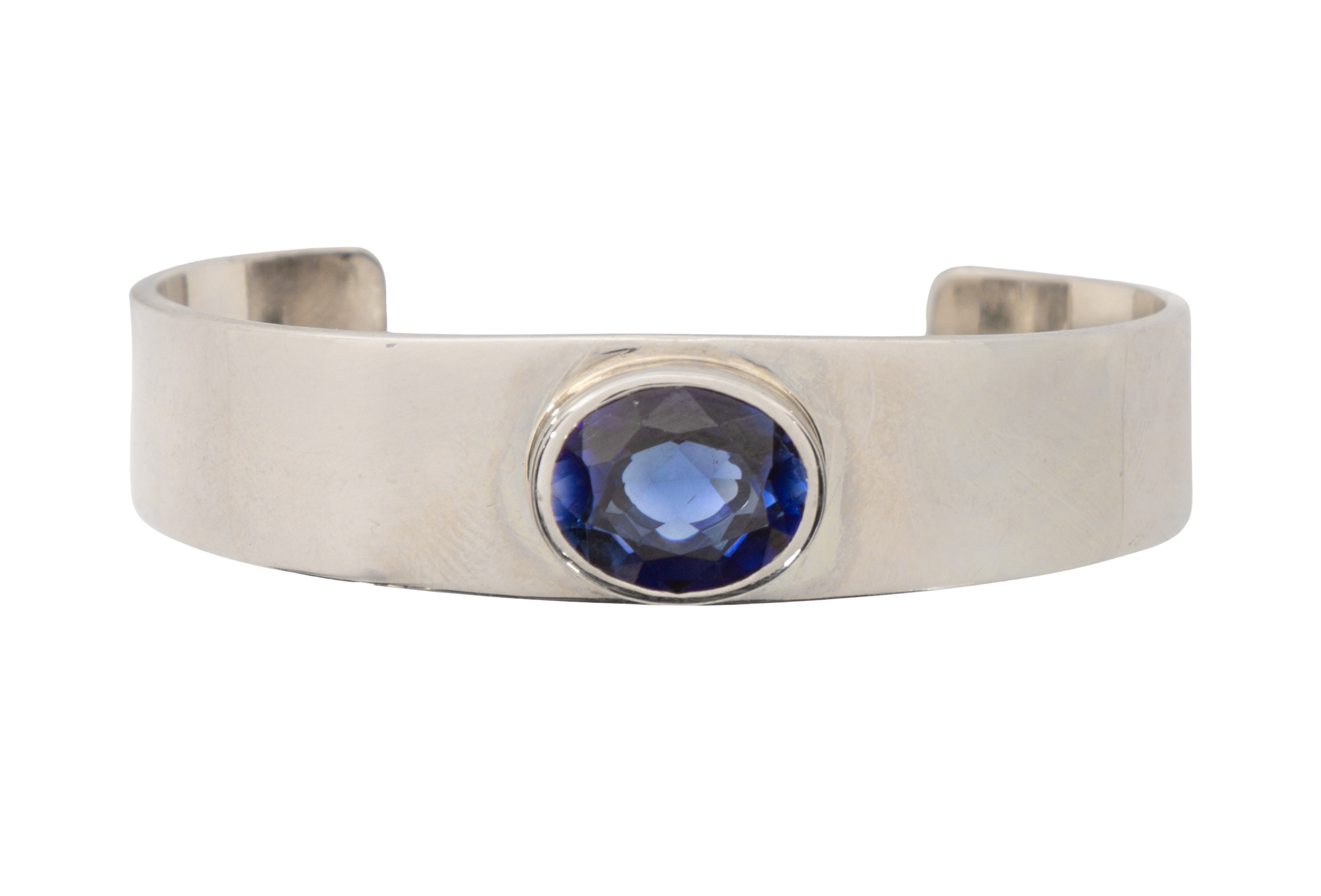 A cuff bracelet having an oval cut sapphire in a bezel setting (marked ’18k’)