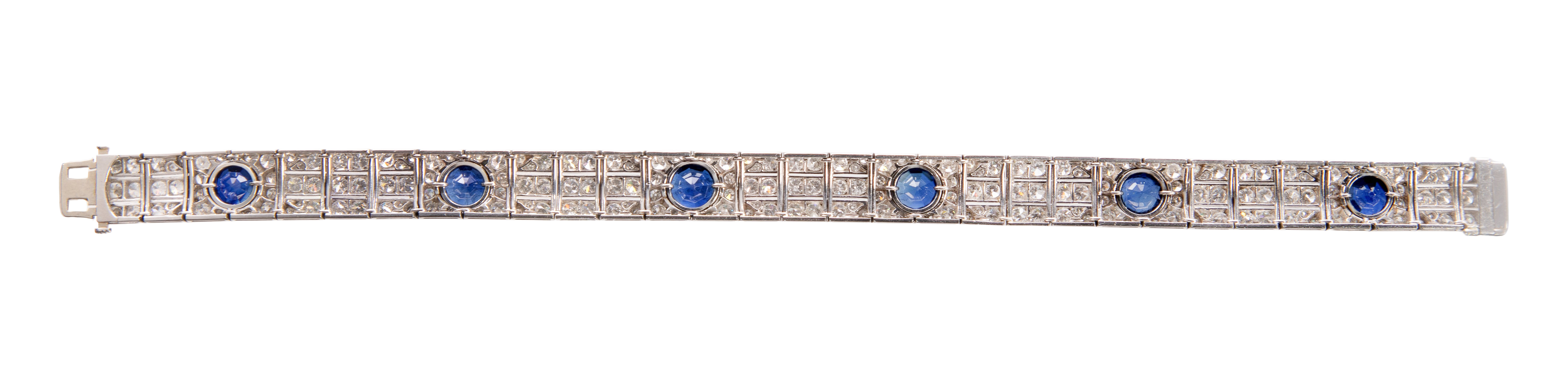An Art Deco style bracelet having links of diamonds, approximately 8.30 carats total weight, G-I color, VS-SI clarity, and six round cut bezel set sapphires approximately 9.06 carats total weight, including Spaulding Jewelers box (unmarked 90% platinum)