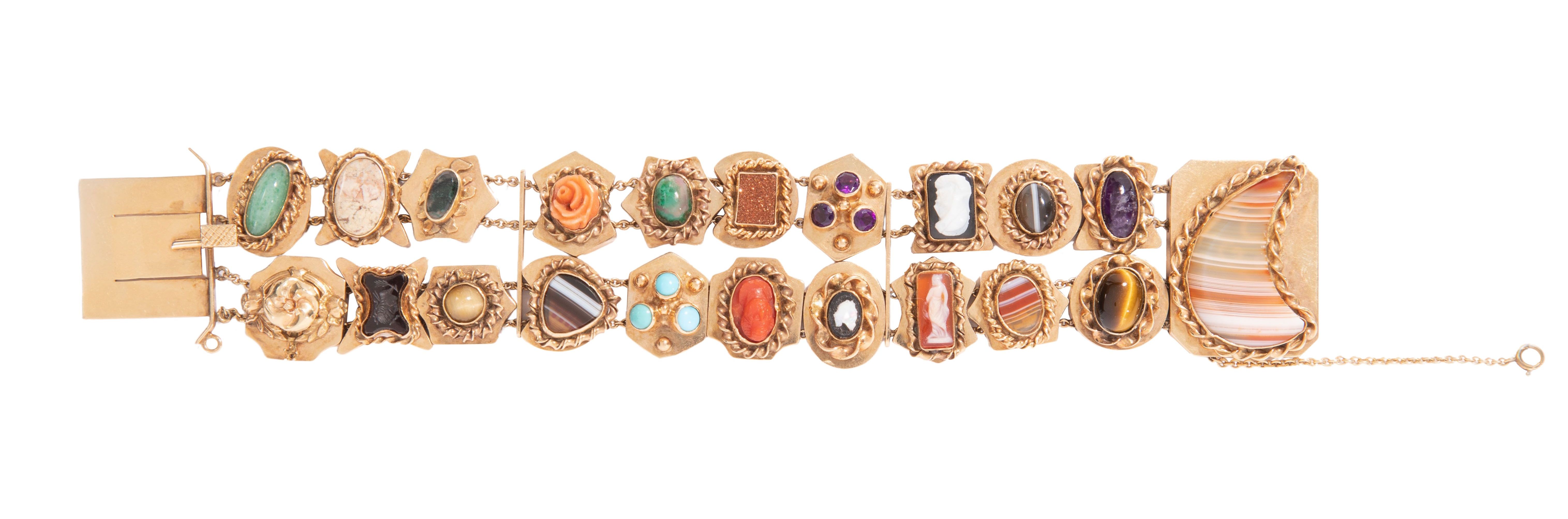 Featuring twenty decorated slides having gemstone and enameled accents, strung on a chain with round box clasp and safety latch (each slide marked ’14k’)