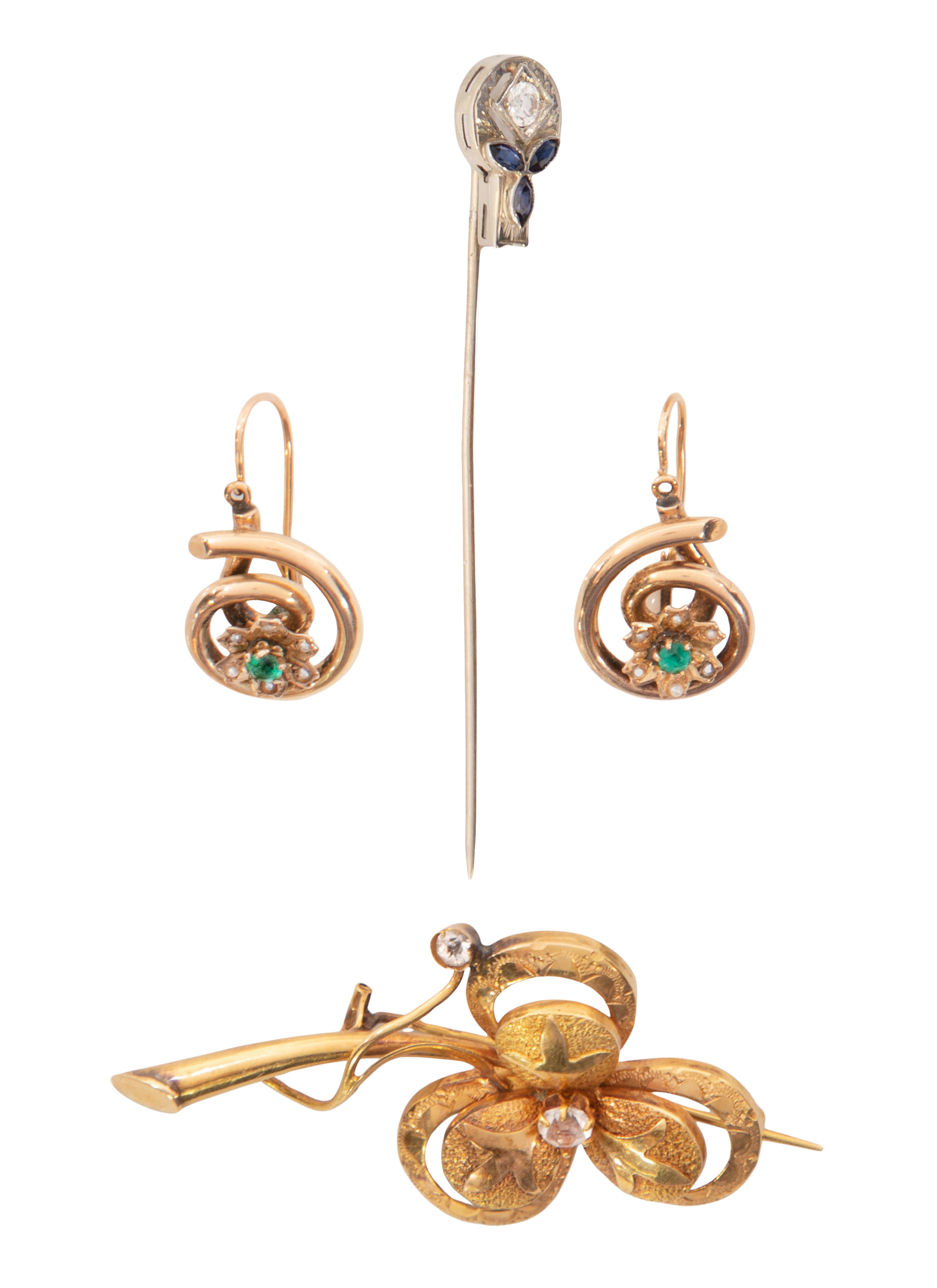 (3) items including a clover pin having a round cut center diamond, a diamond and sapphire Victorian style lapel pin and a pair of pierced earrings accented with diamonds and emeralds (unmarked 18k)