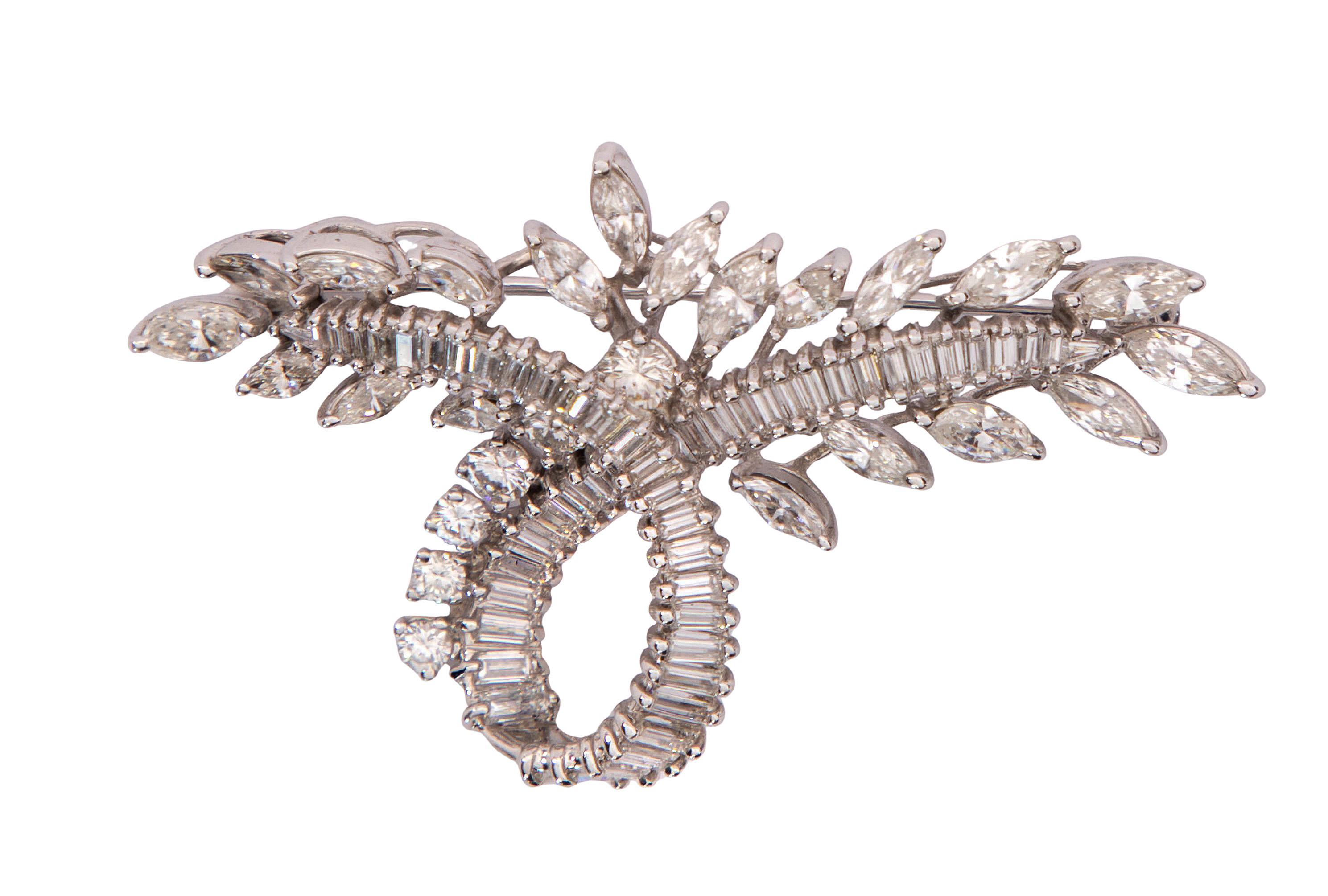 Bow style, formed using twenty marquis cut diamonds, five round cut diamonds and tied together by tapered baguettes