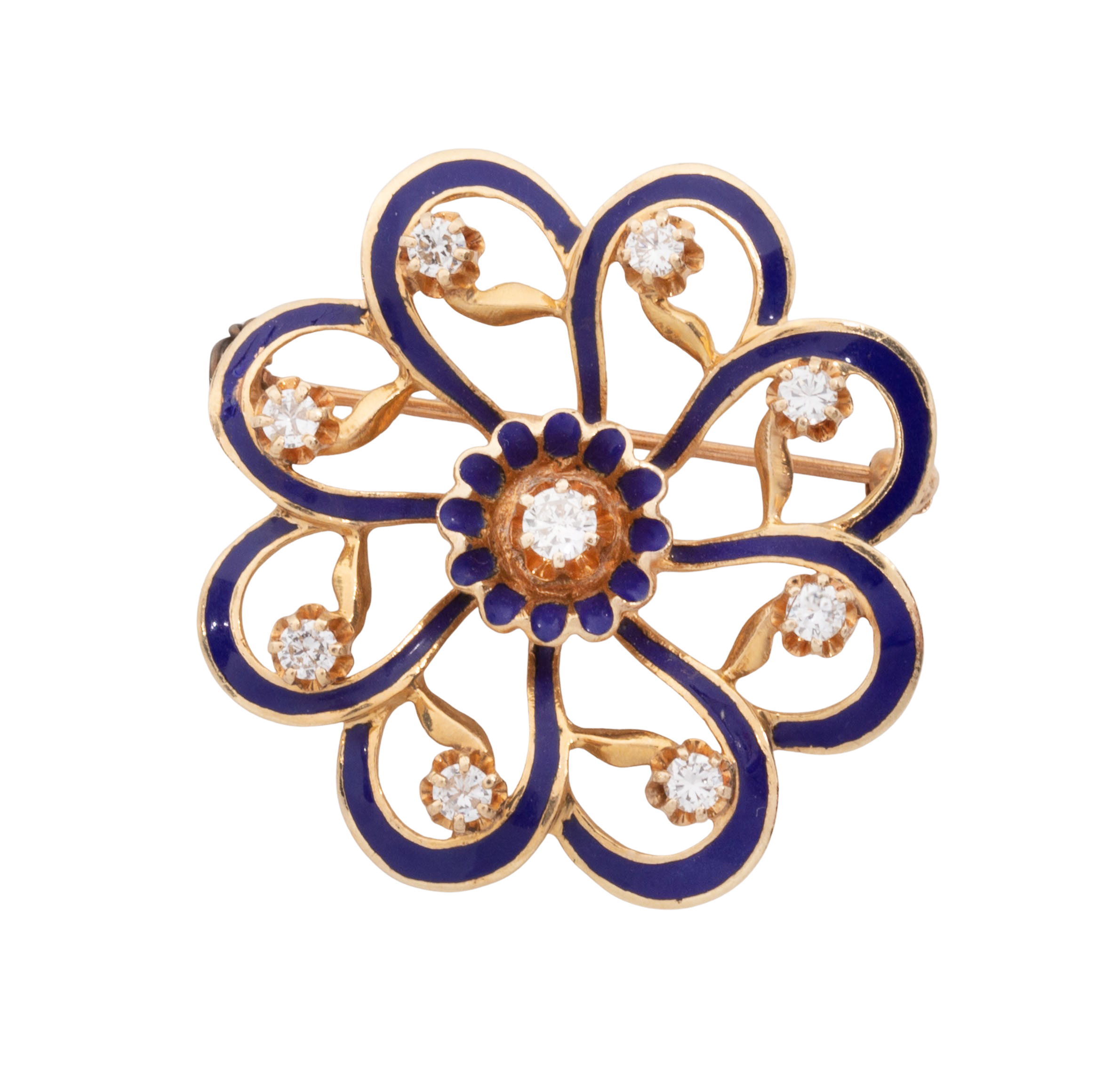 Blue enamel floriform brooch / pendant having nine round cut diamonds weighing approximately 0.70 carats total (unmarked 14k)