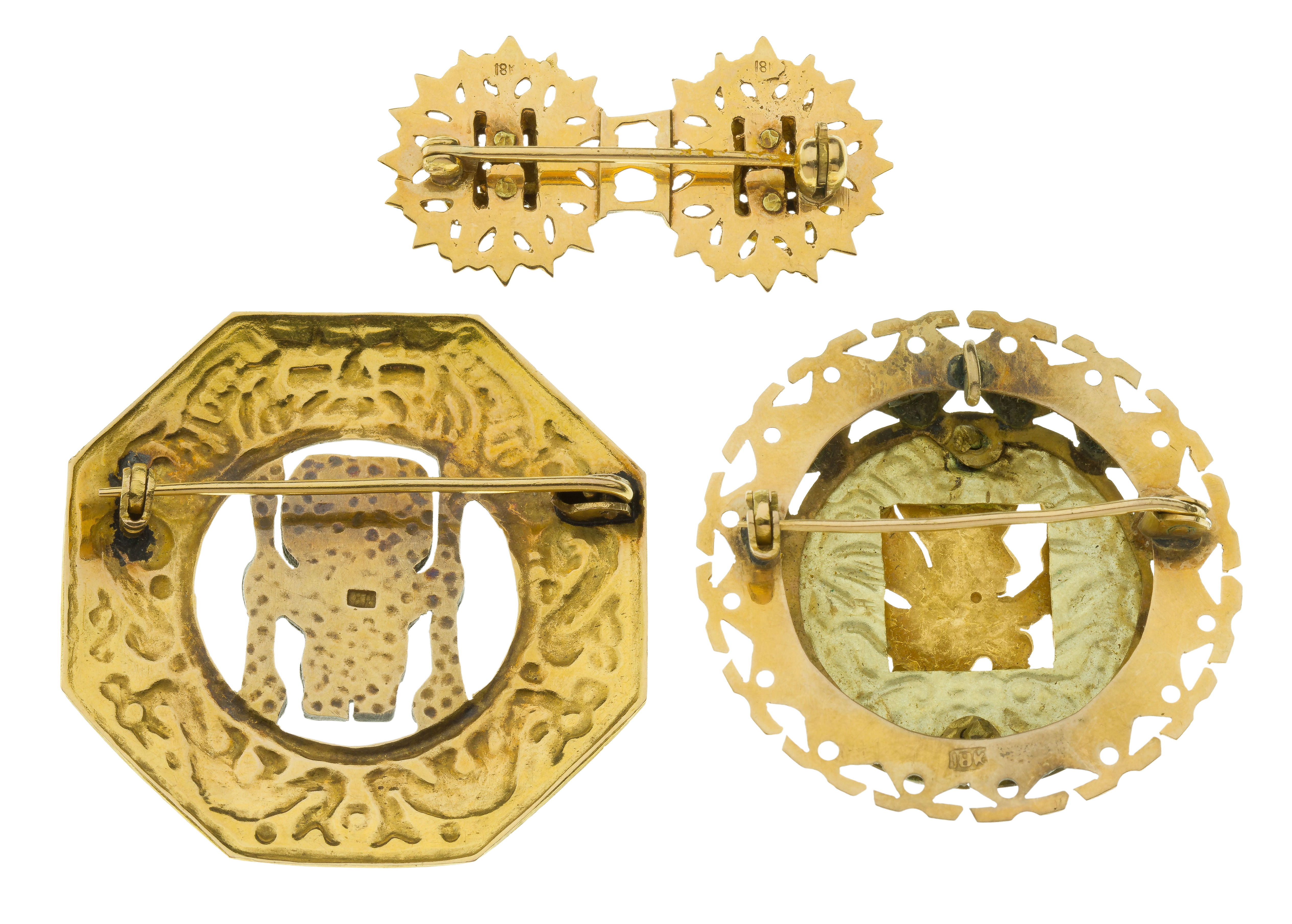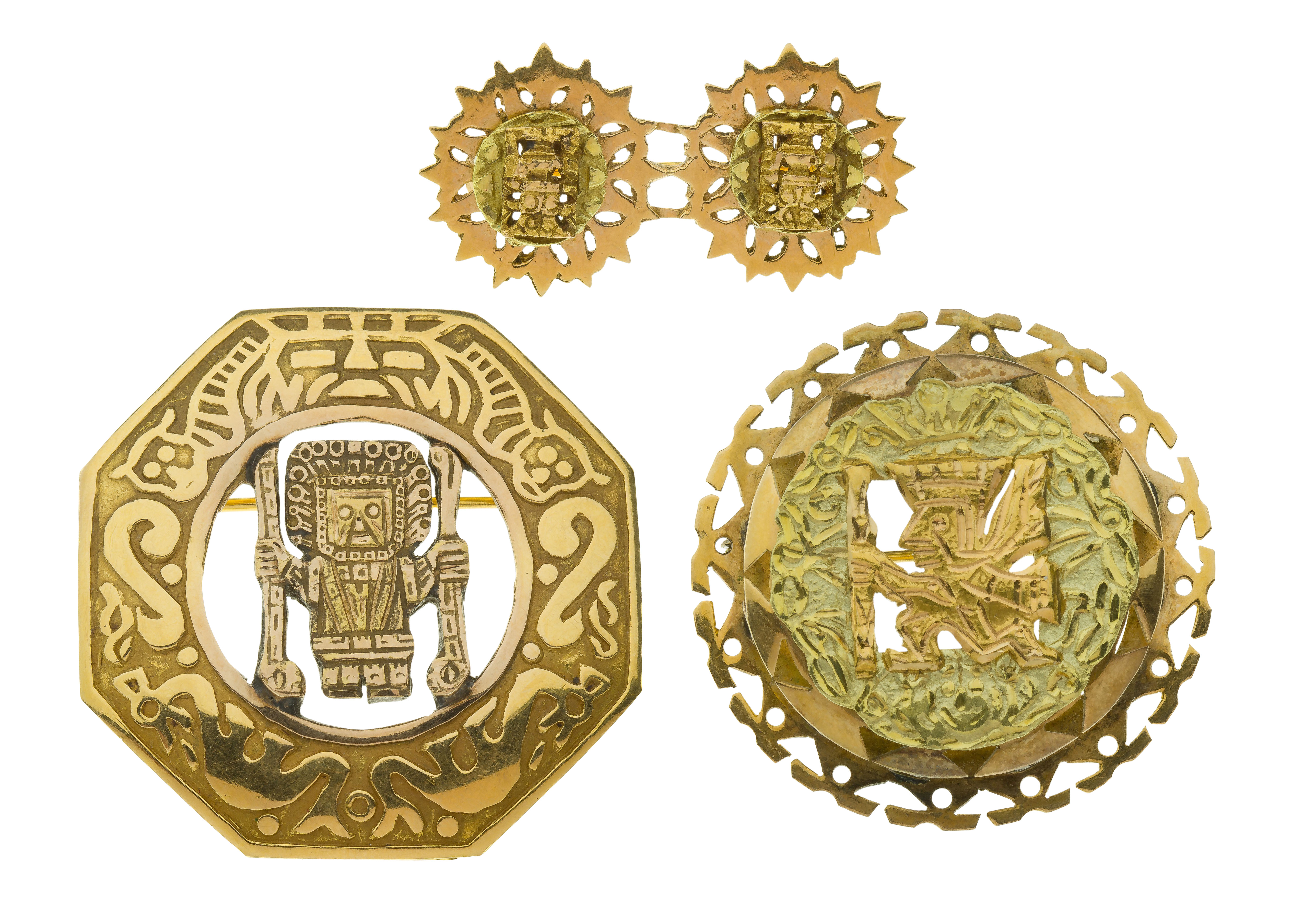 (3) pins having a Mayan / Aztec motif (marked ’18k’)