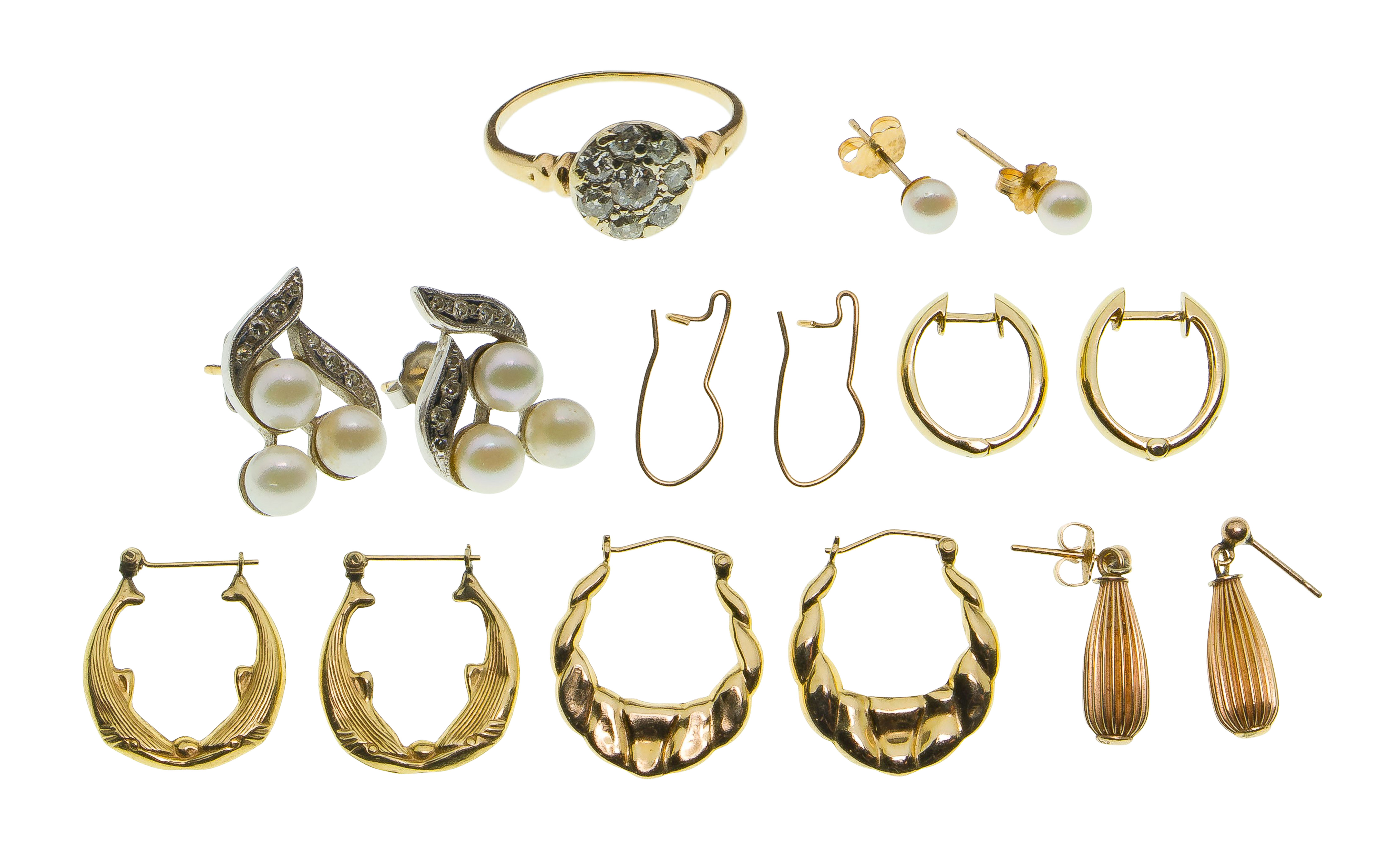 (8) items including a halo style diamond ring and (7) pairs of pierced earrings (most marked ’14k’)