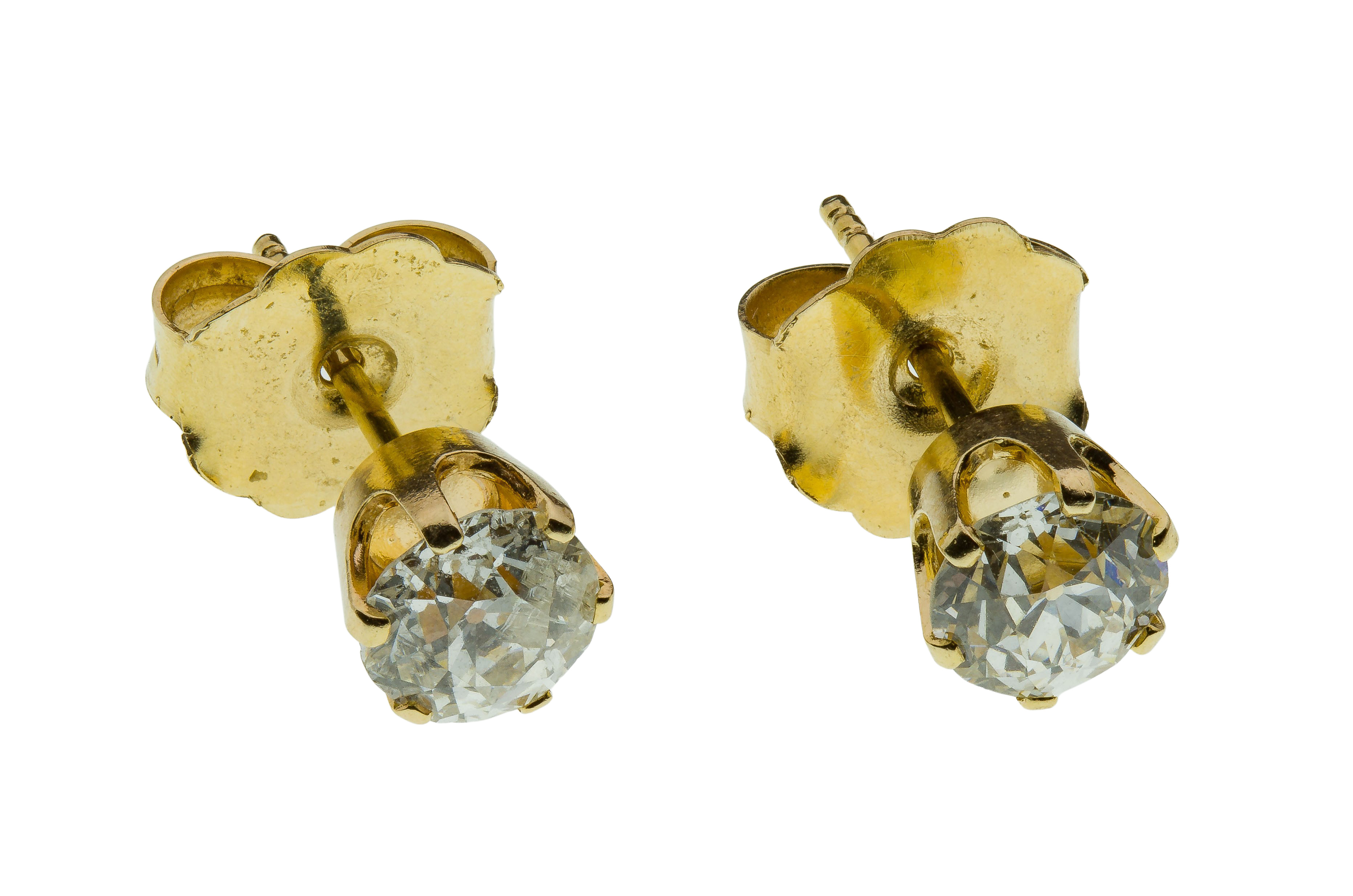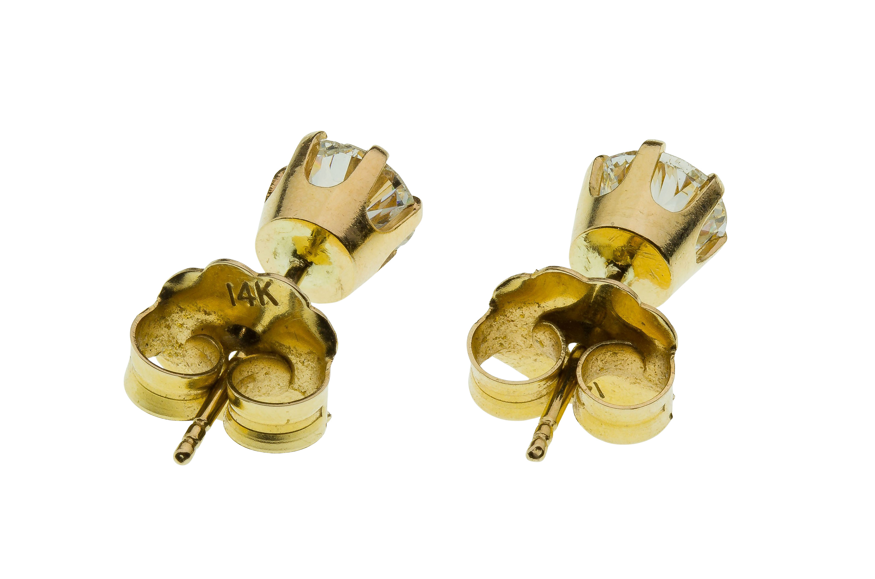A pair of round cut diamond studs (earrings unmarked 14k, backers marked ’14k’)