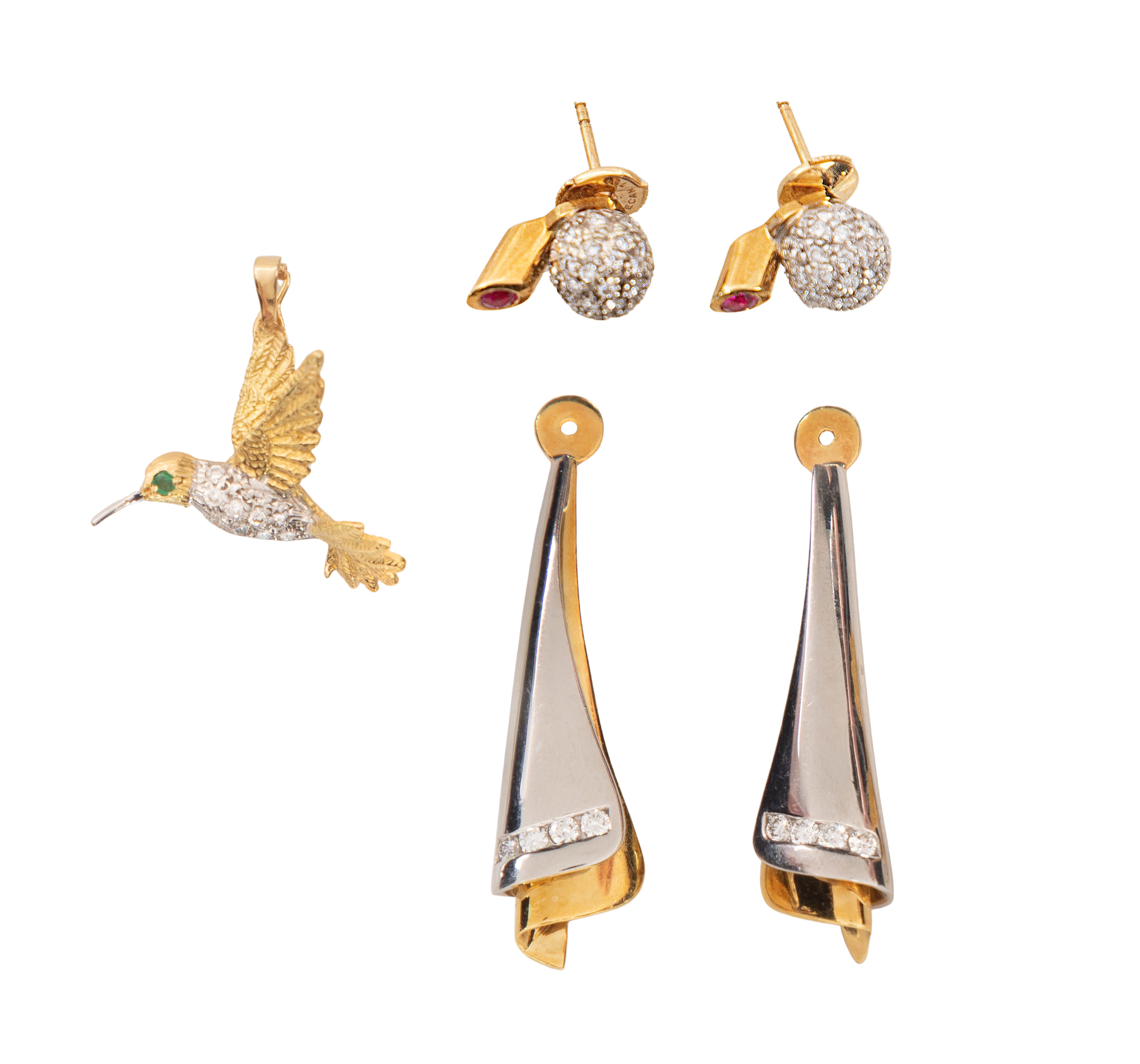 (3) items including a pair of diamond accented earring jackets (marked ‘plat’ and ’18k’), a pair of diamond pave pierced earrings and a diamond pave hummingbird pin having emerald eyes (all marked ’18k’ / ‘750’)