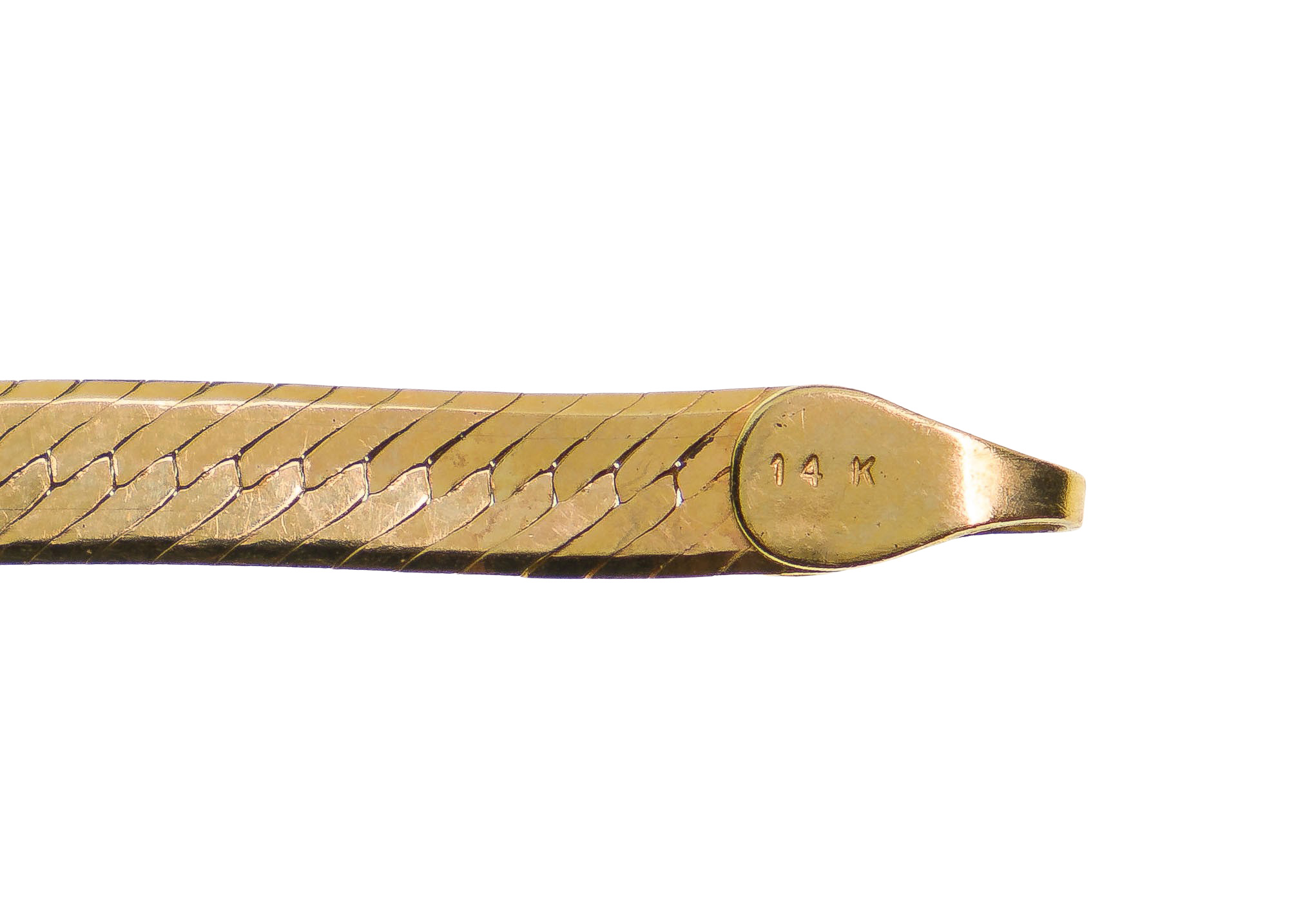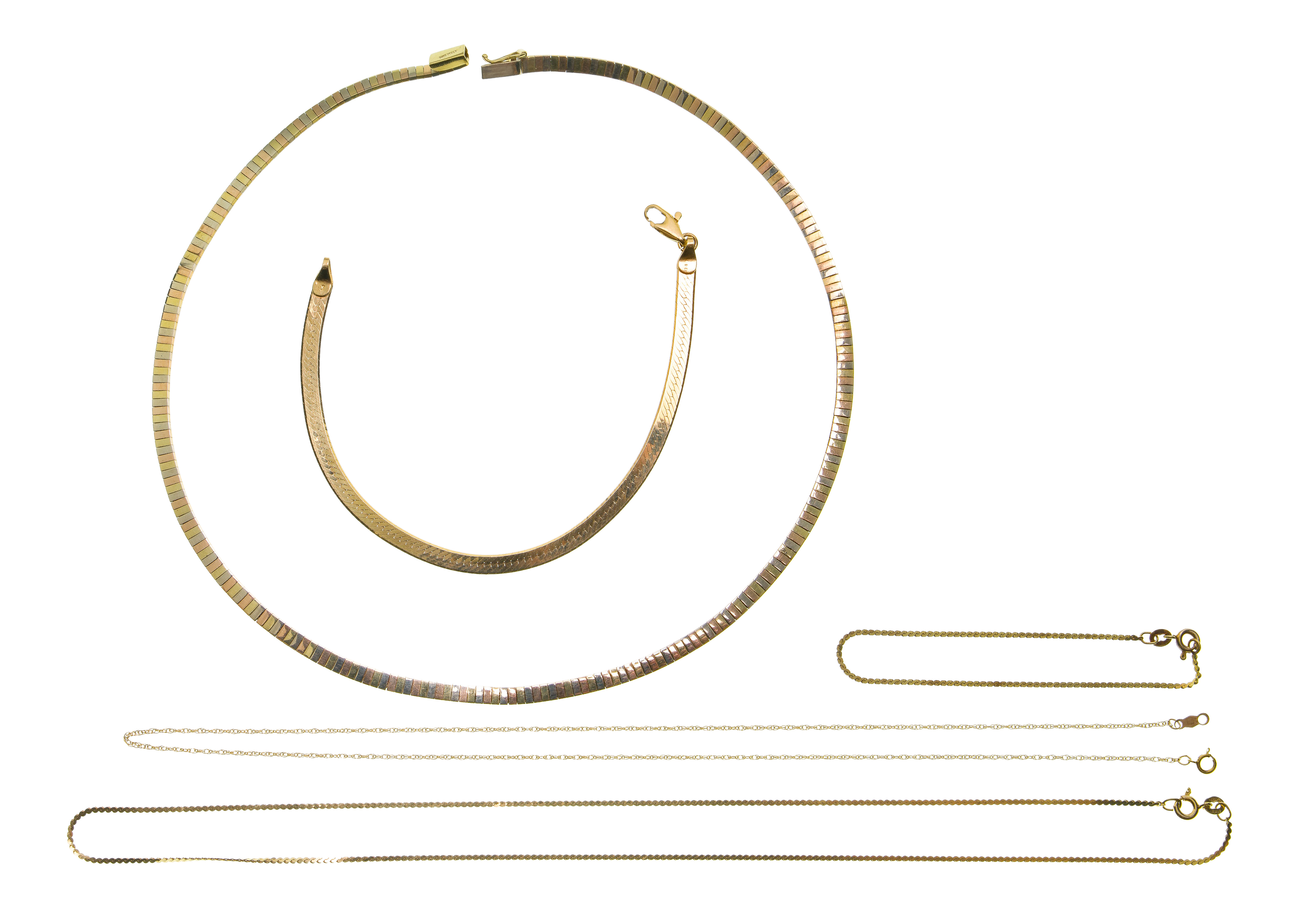 (5) items including a tri-color box style chain necklace 0.25-inch wide, (2) chain style necklaces, (3) chain style bracelets (all marked ’14k’ / ‘585’)