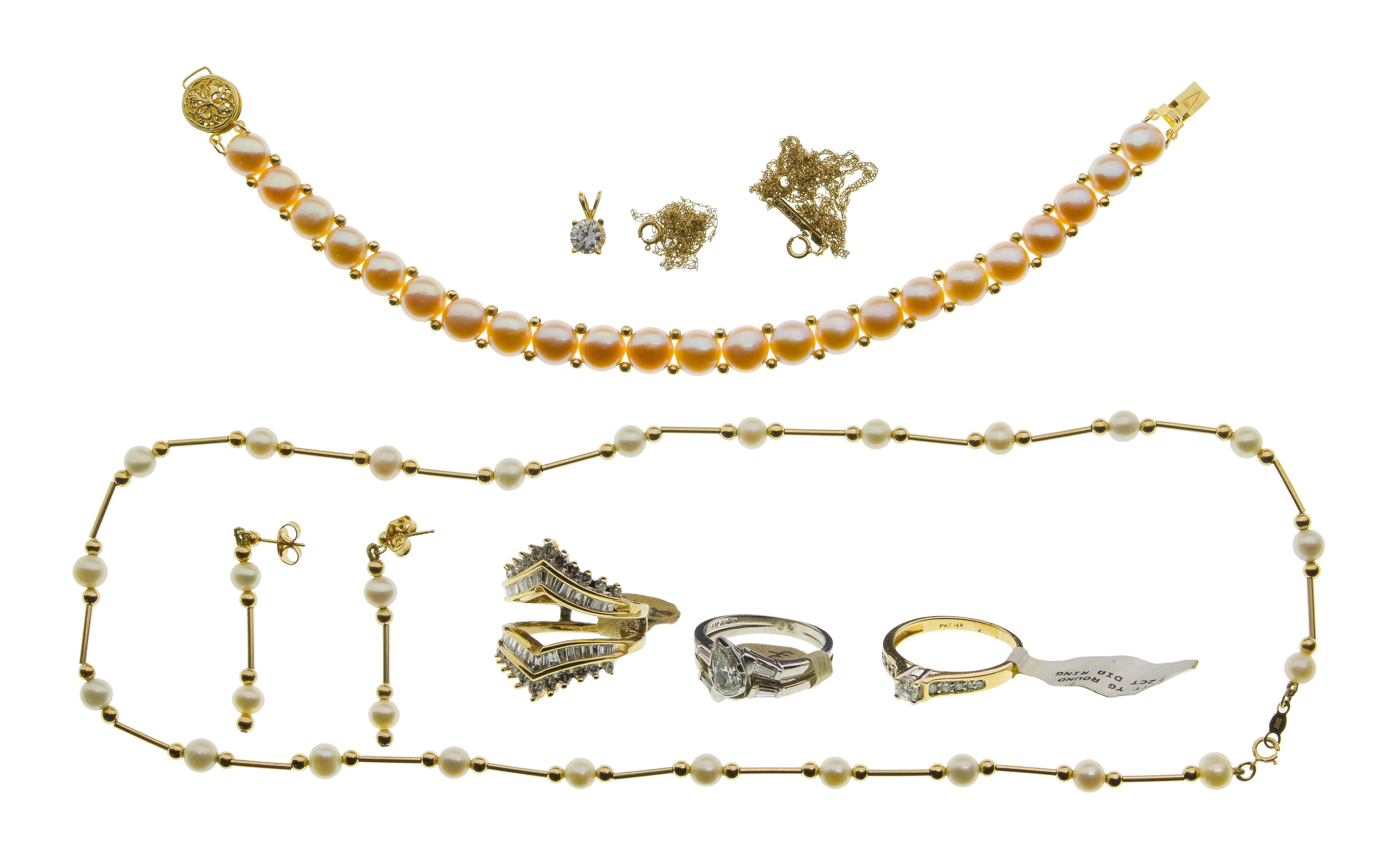 (9) items including a round cut diamond pendant, (3) rings comprising of a diamond accented ring guard, a round cut diamond solitaire flanked by diamonds accents on each side and a white gold interlocking wedding set as well as a pink pearl bracelet, a pearl style necklace, matching earrings and (2) gold chain style necklaces (all marked ’14k’)