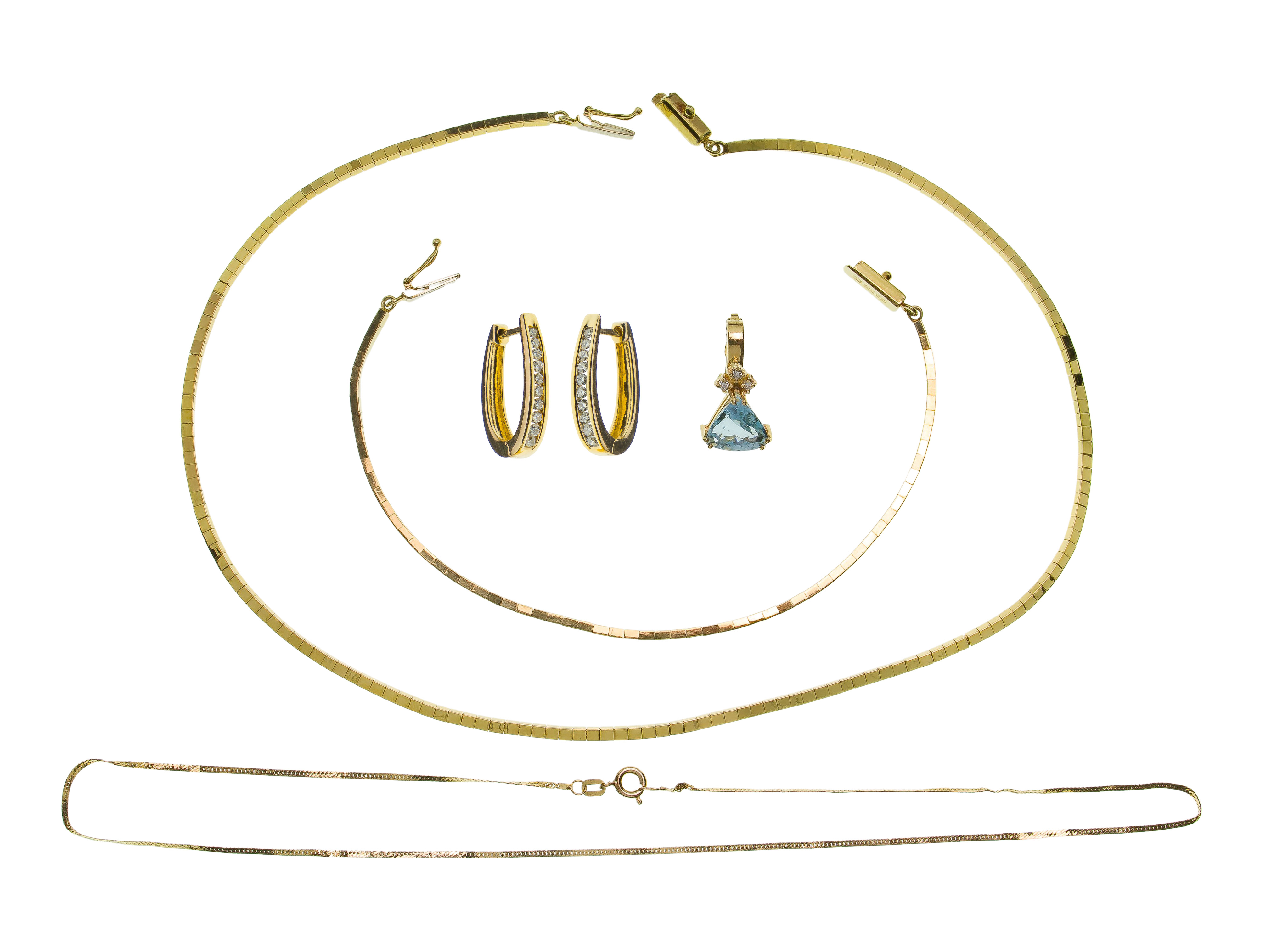 (5) items including a box link necklace having matching bracelet, an S-chain necklace, a gemstone pendant and a pair of diamond accented pierced earrings (all marked ’14k’ / ‘585’)