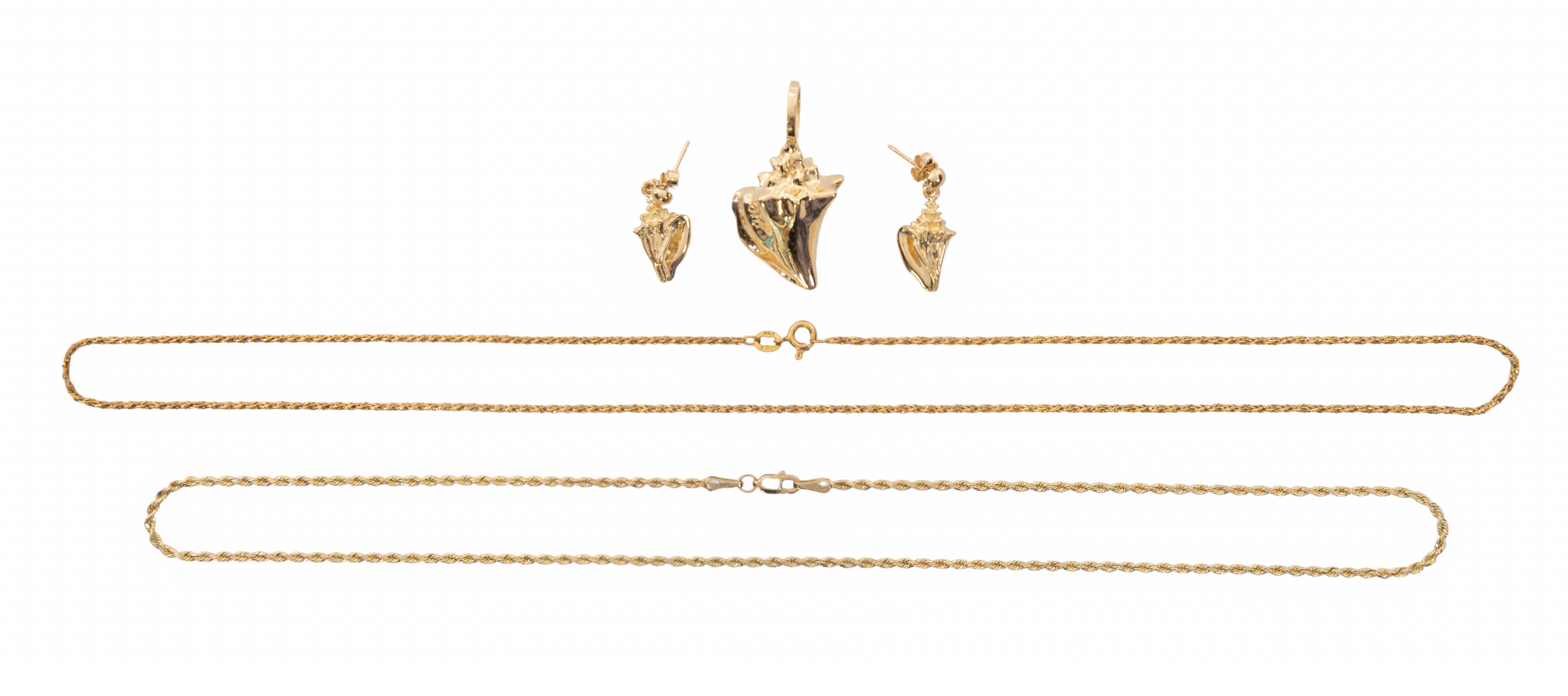 (4) items including (2) rope style chain necklaces, a shell pendant and a matching pair of pierced earrings (marked ’14k’ / ‘585’)