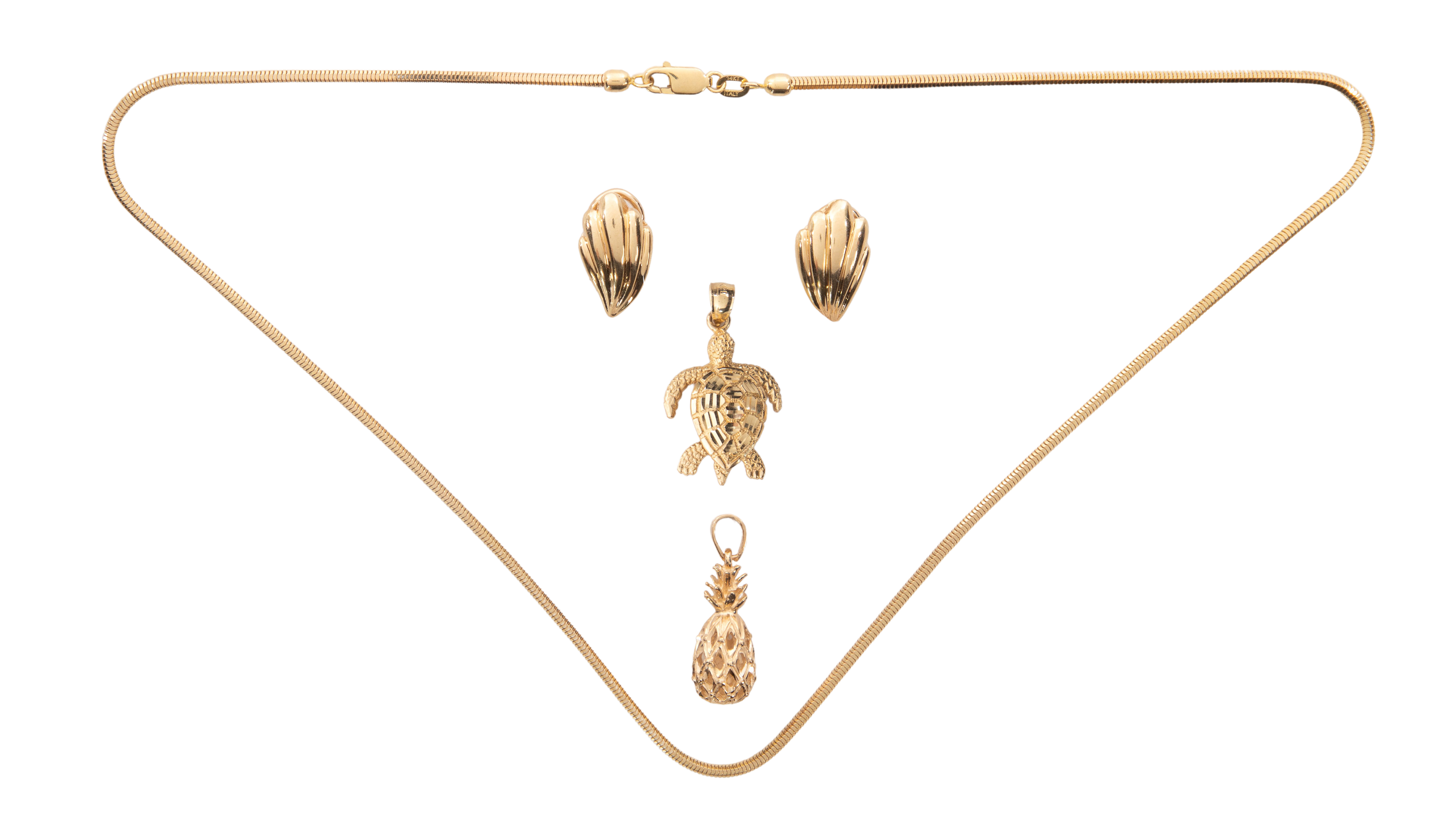 (4) items including a fluid style necklace, an articulated turtle pendant, a pineapple pendant and a pair of shell design French clip earrings (all marked ’14k’ / ‘585’)