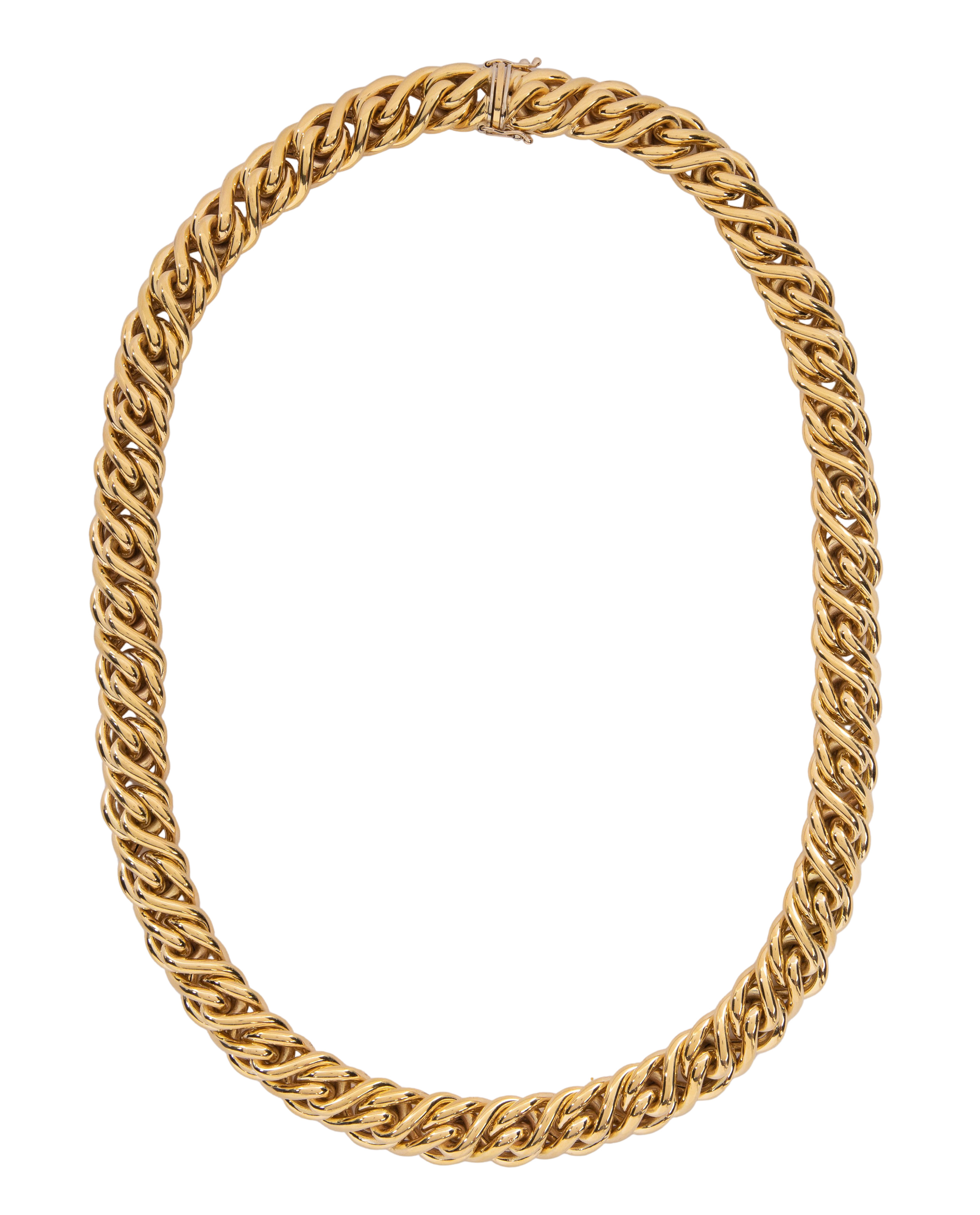 A double link curb chain style 10-mm wide including presentation sleeve (marked ‘750’ on back of clasp)