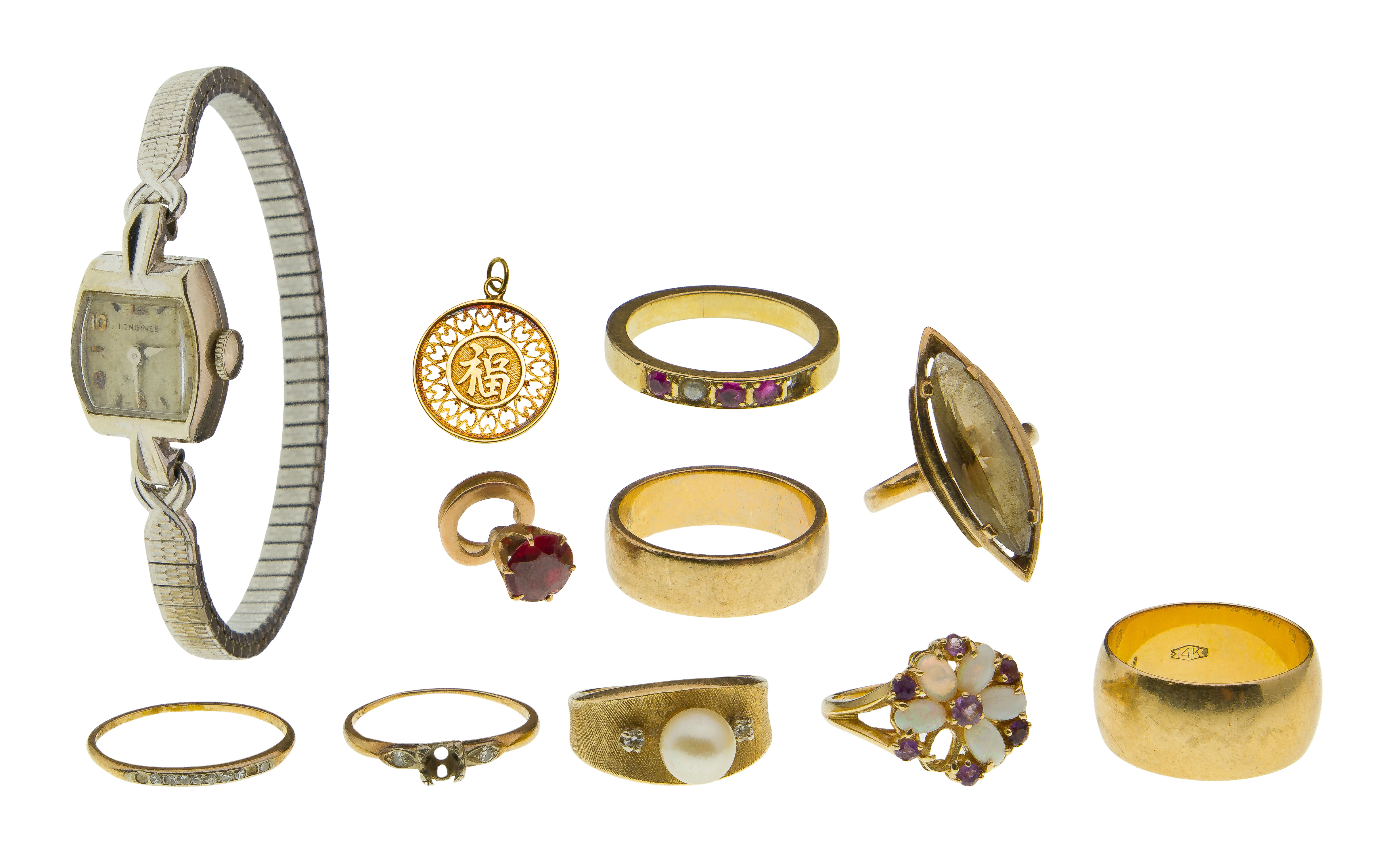 Condition: overall light to moderate wear, some rings missing stones, watch not running when tested, some unmarked but XRF tested as 14k / 10k / 9k gold