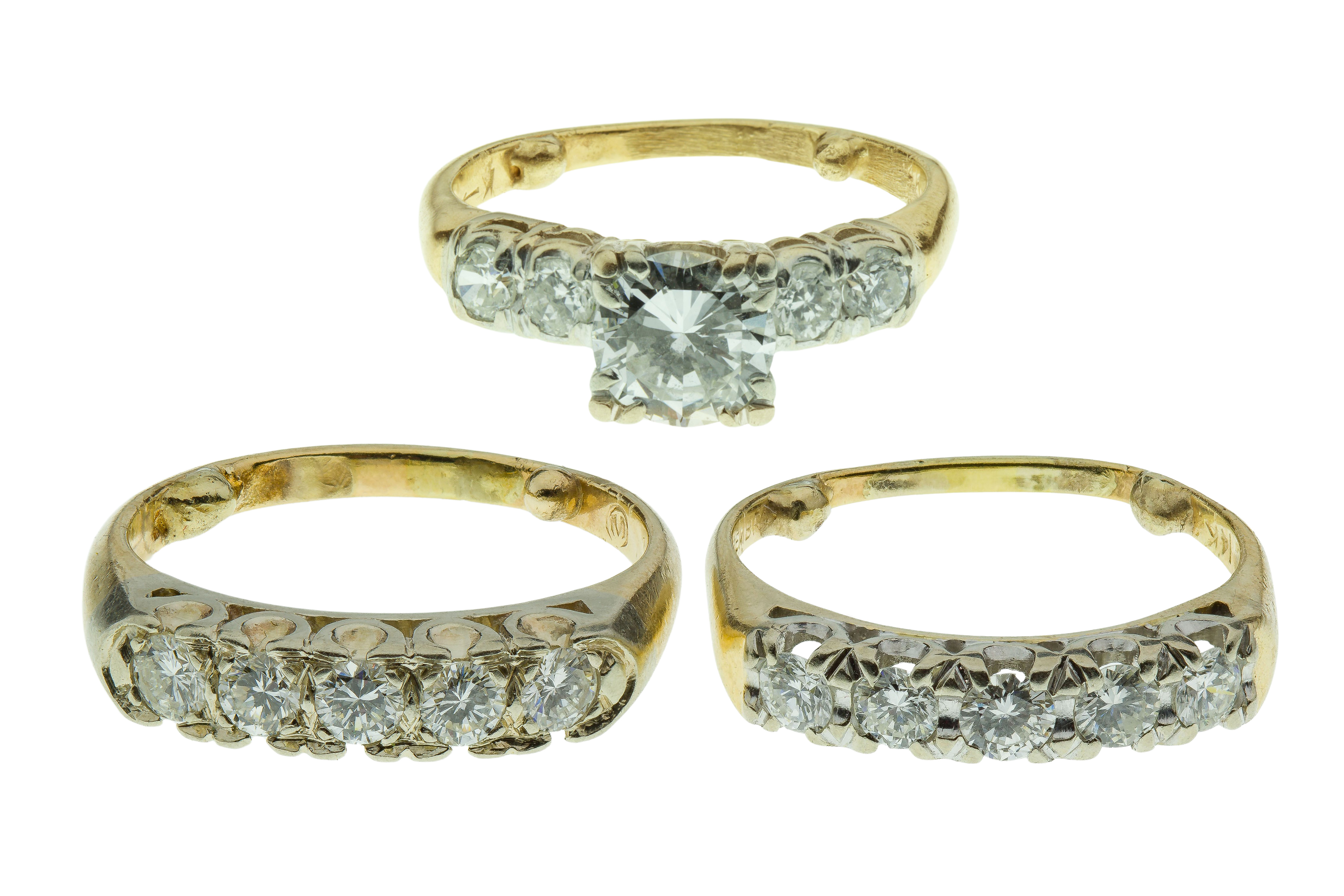 (3) items including a ring having a round cut diamond, approximately 1.00 carats, H/I color, I-1 clarity, flanked on either side by two round cut diamonds, approximately 0.80 carats total weight, and (2) matching bands having a row of five round cut diamonds across front, each approximately 0.75 carats total weight (some marked ’14k’)