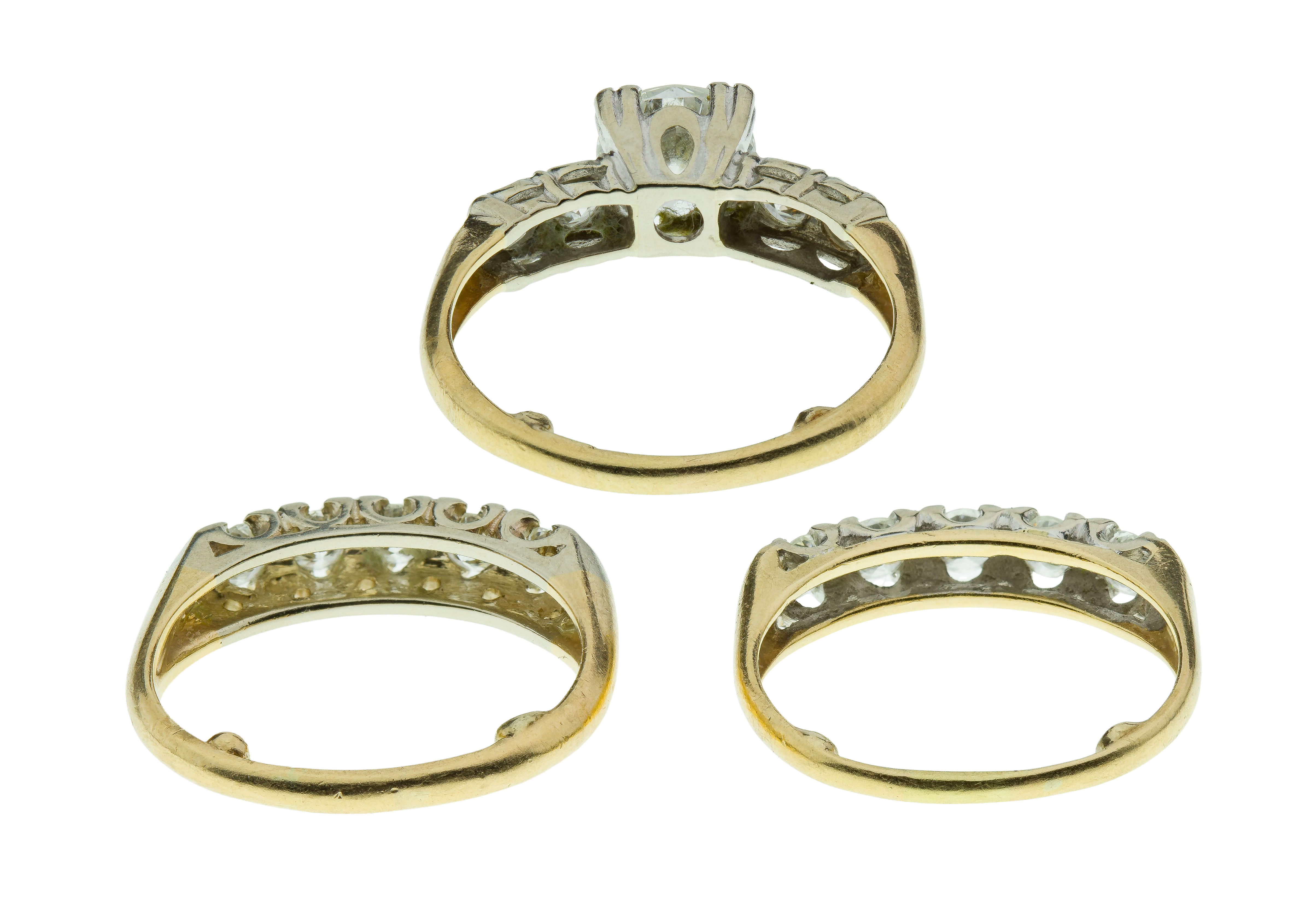 overall light wear consistent with normal use, engagement ring having two flanking diamonds fluoresced as well as one diamond on a band, and all having sizer balls, some unmarked but XRF tested as 14k gold