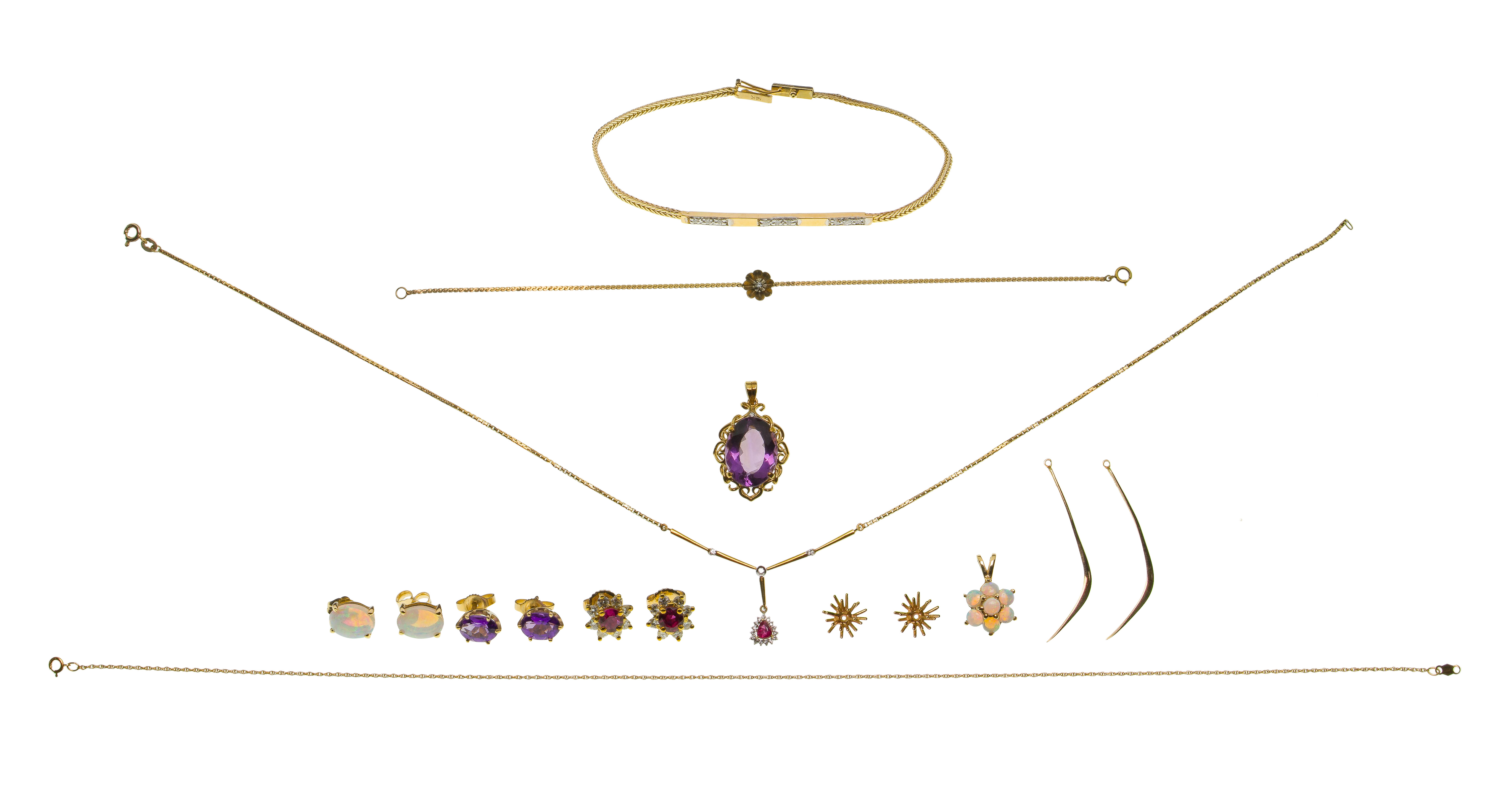 (13) items including a gray and white pearl dome style ring, an oval lapis lazuli ring, (2) necklaces, (2) bracelets, (2) pendants, (3) pairs of pierced earrings and (2) pairs of earring jackets (most marked ’14k’)