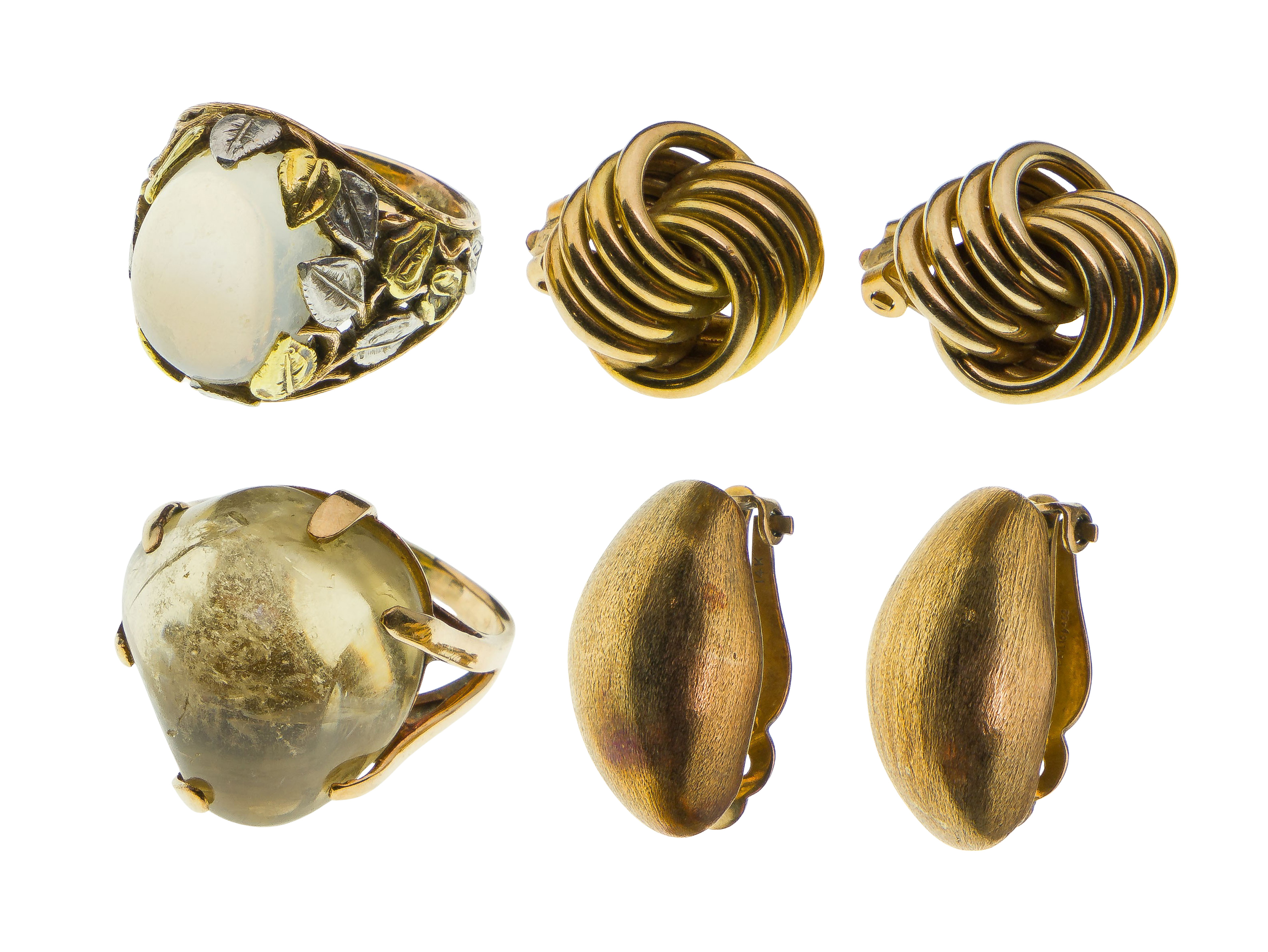 (4) items including (2) gemstone statement rings and (2) pairs of clip earrings (some marked ’14k’)